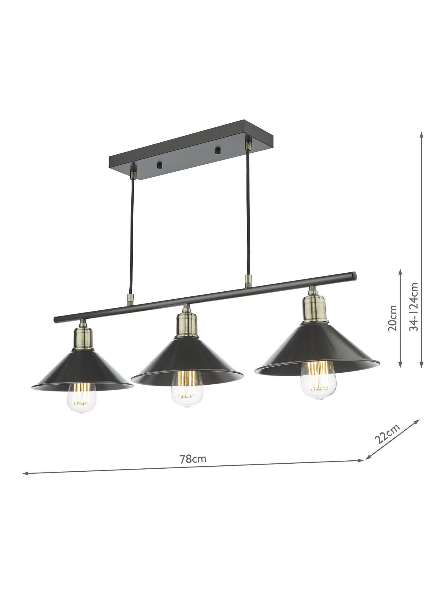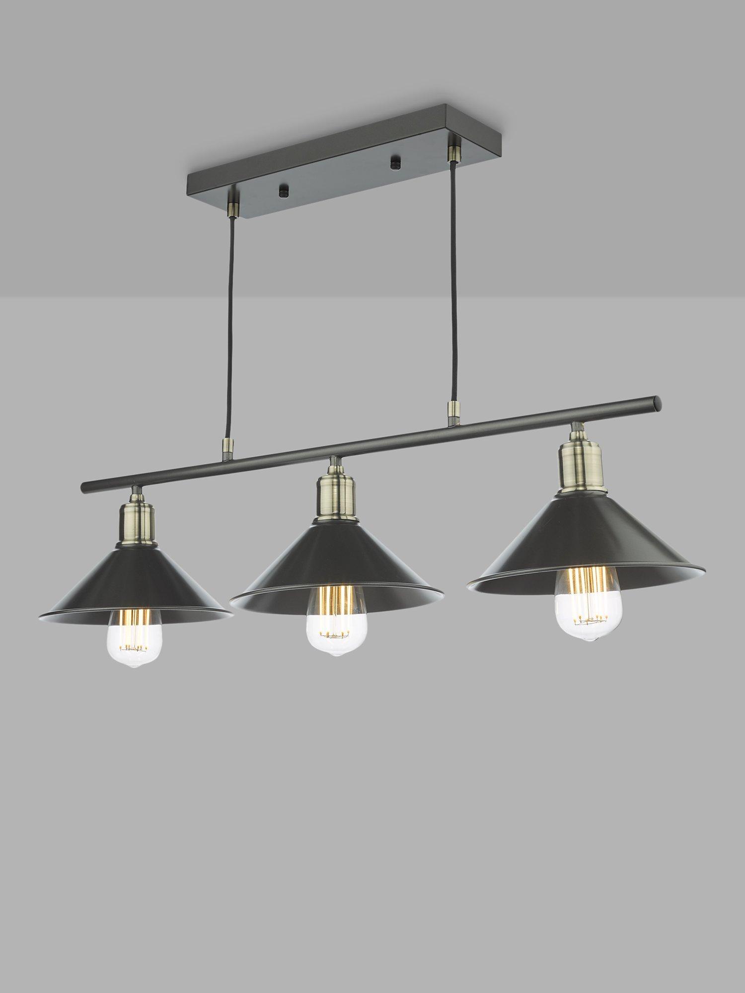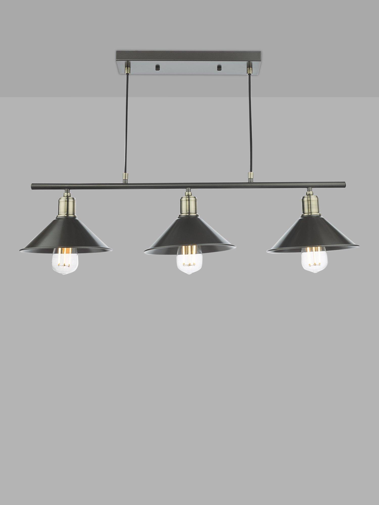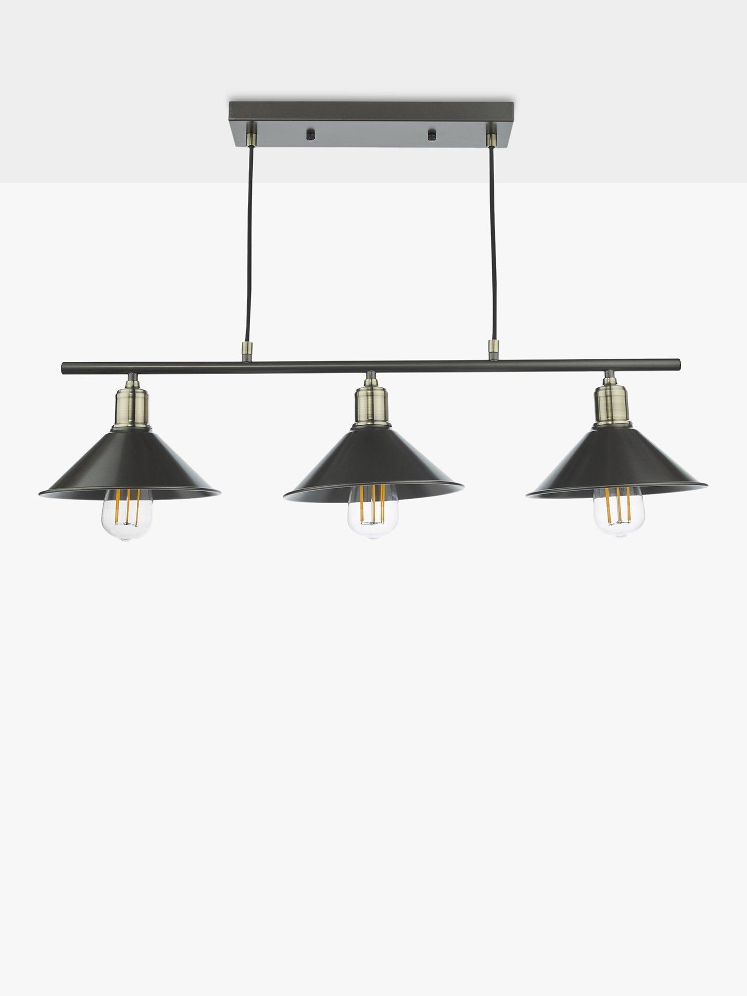 Reminiscent of old factory lighting, this ceiling light is a brilliant option for hanging over a long dining table or breakfast bar. Made from sturdy metal with three shades, it offers a warm glow of direct light and the cable can be shortened on installation. The addition of antique brass metal detail enhances its industrial-style look. Three LED bulbs are required.