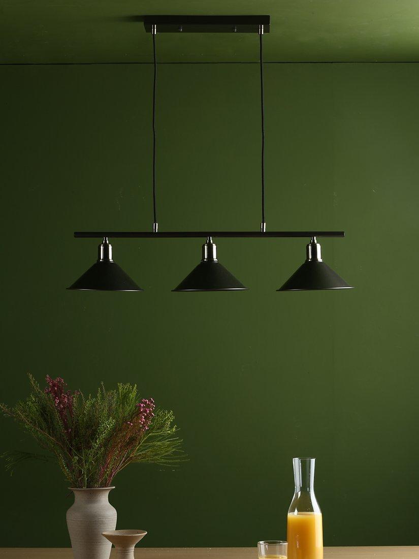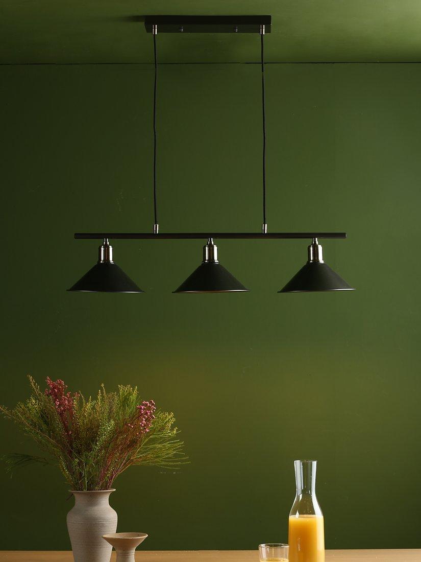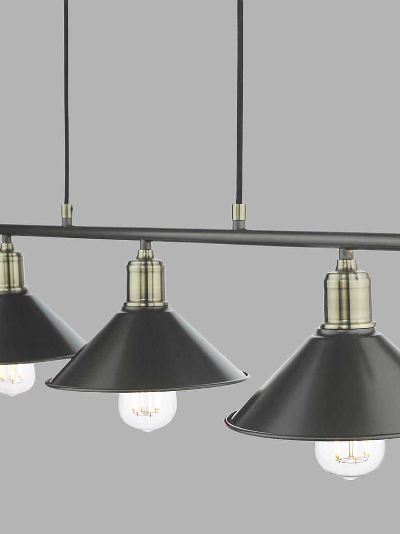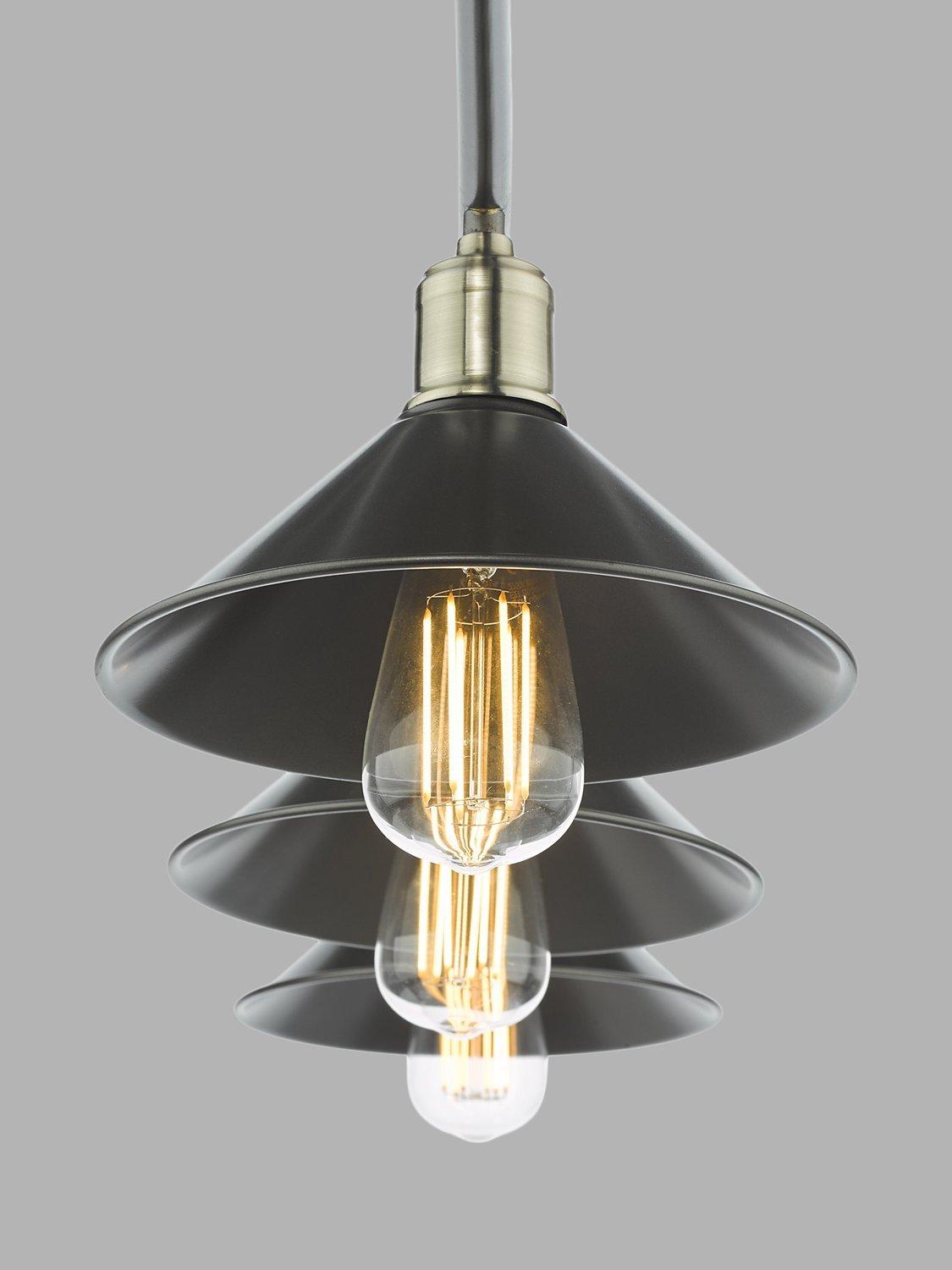 Reminiscent of old factory lighting, this ceiling light is a brilliant option for hanging over a long dining table or breakfast bar. Made from sturdy metal with three shades, it offers a warm glow of direct light and the cable can be shortened on installation. The addition of antique brass metal detail enhances its industrial-style look. Three LED bulbs are required.