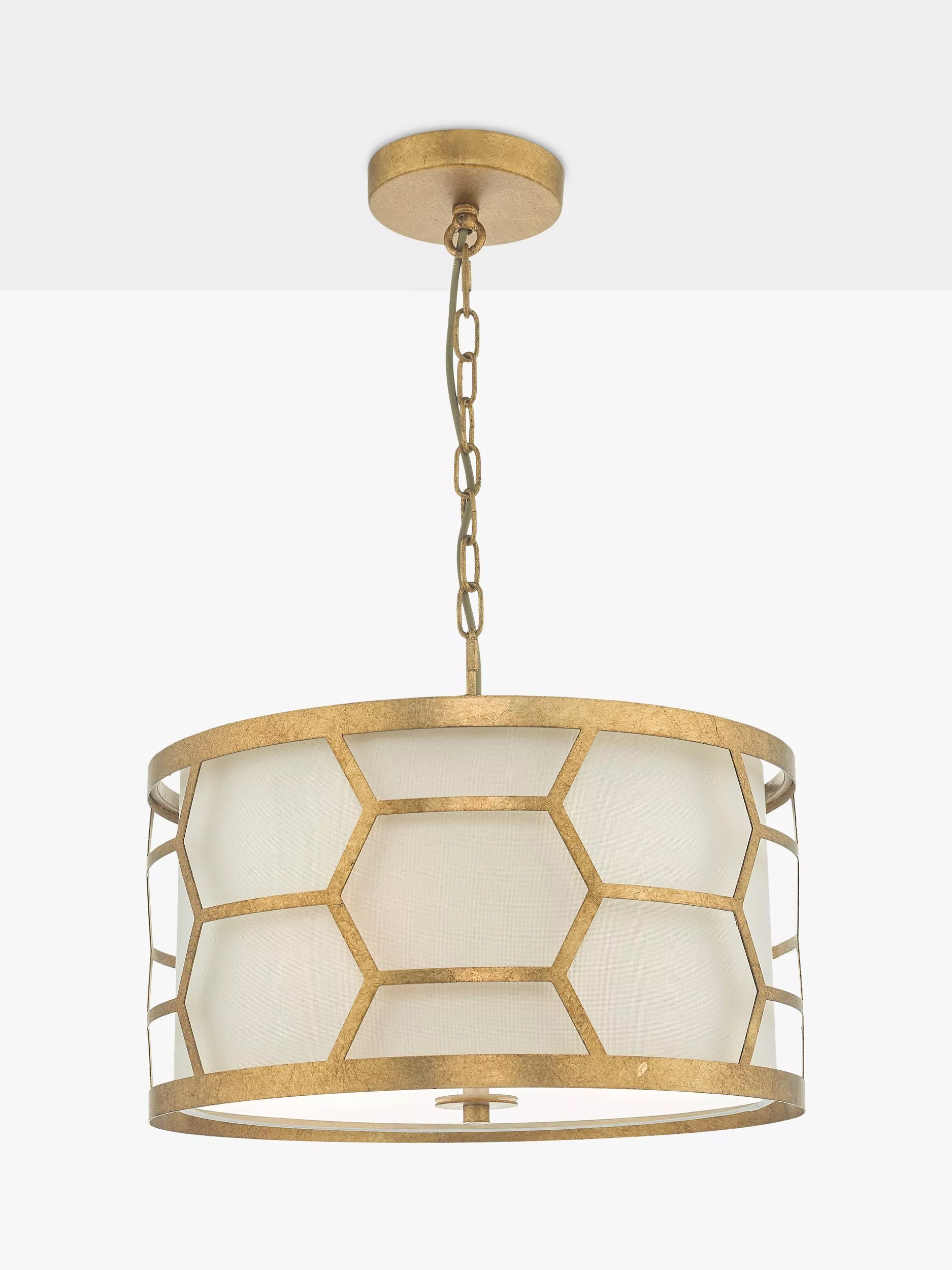In a honeycomb design, this smaller ceiling light from Där is finished in hand-applied, distressed gold leaf.