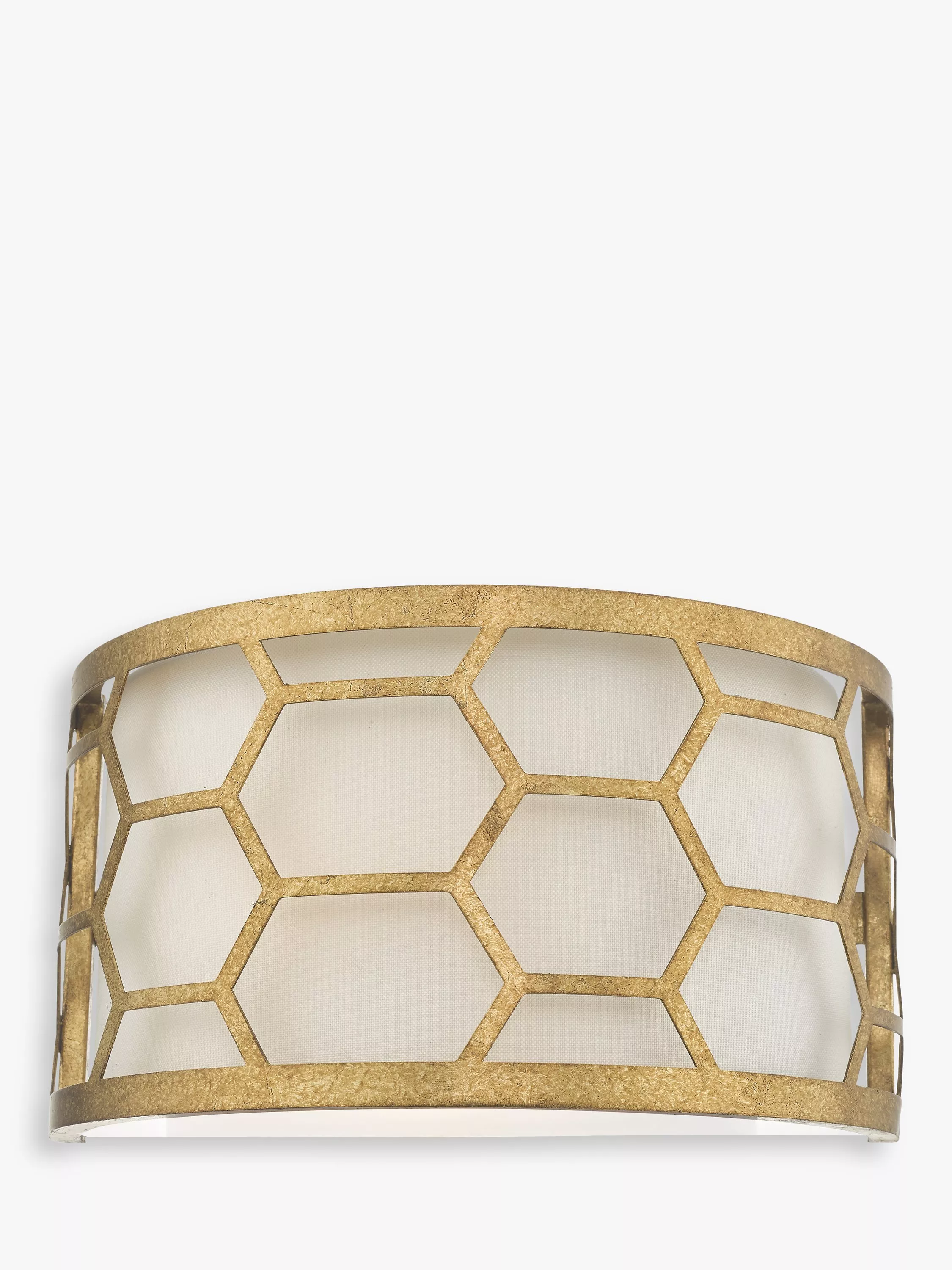 In a honeycomb design, this wall light from Där is finished in hand-applied, distressed gold leaf. The ivory linen shade and tempered glass diffuser soften the light from the single bulb.