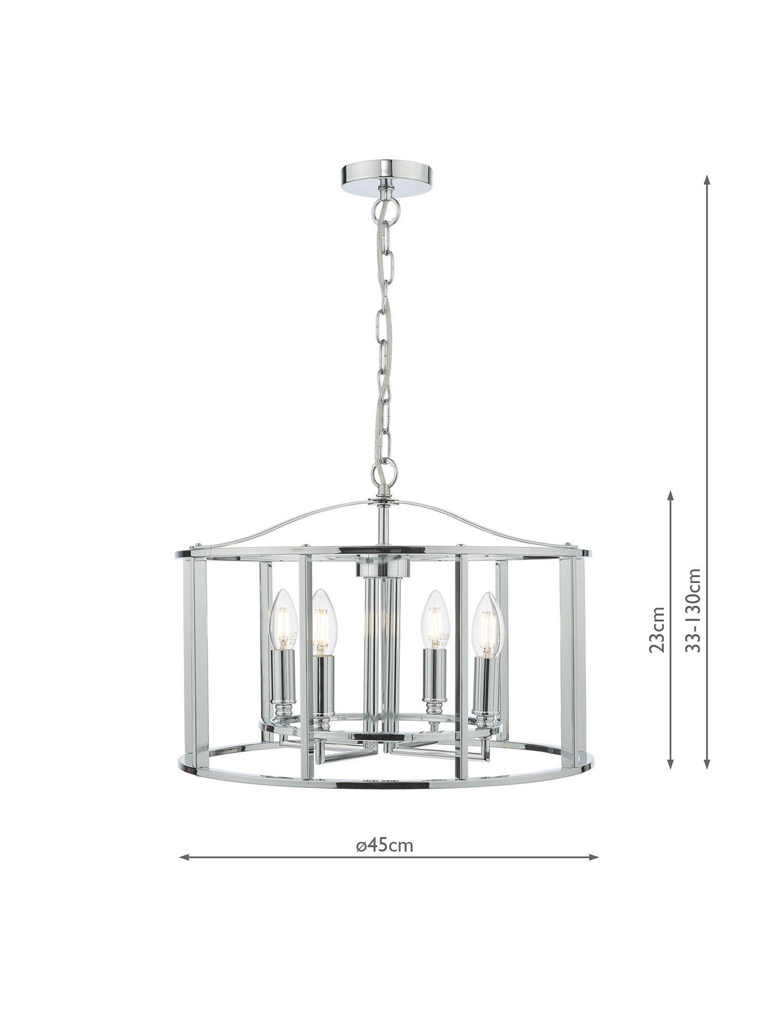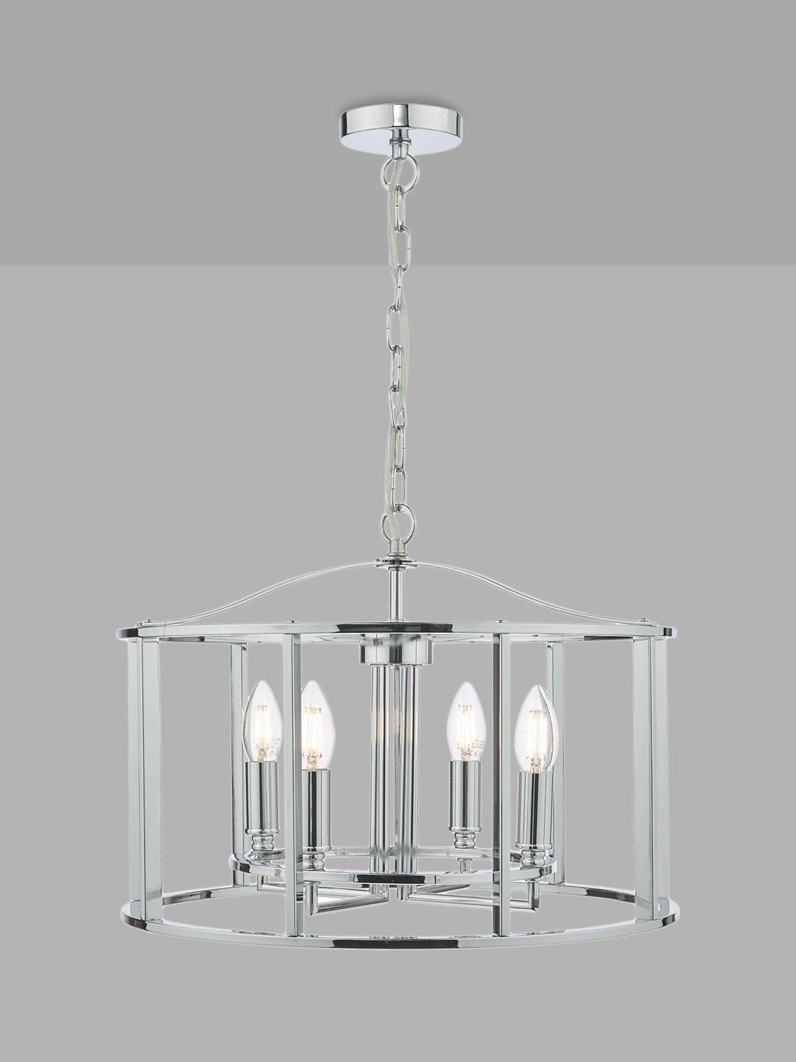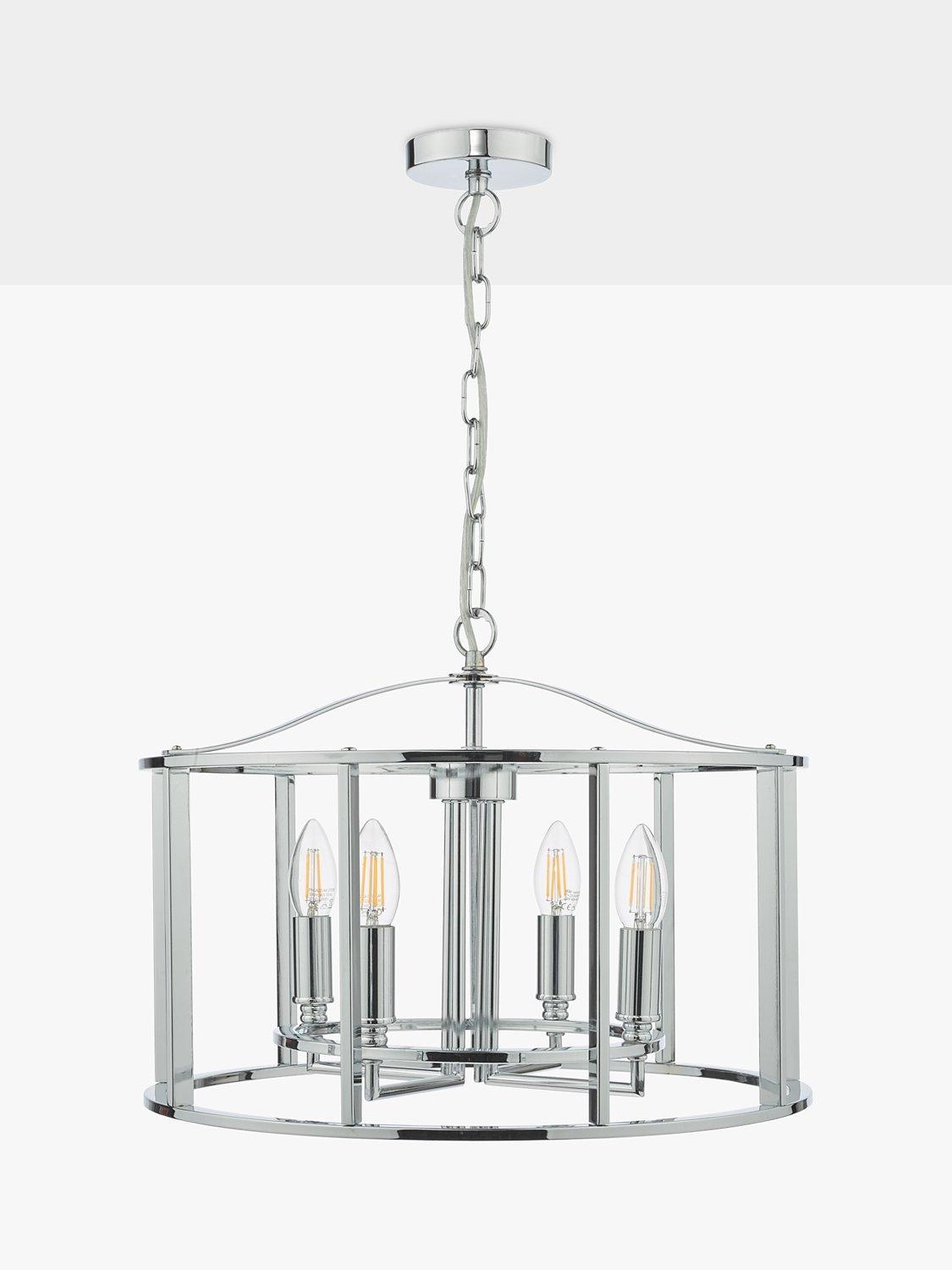 This modern ceiling light provides a warm spread of light around your room thanks to its semi-exposed design. Made from polished chrome, it's curved, cage shape houses a total of four bulbs and the chain can be height-adjusted on installation to suit your space. Also available in a larger size.