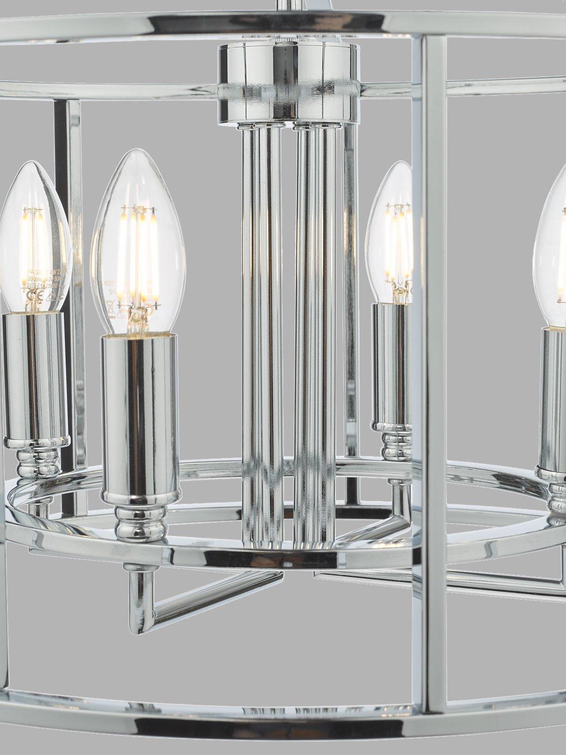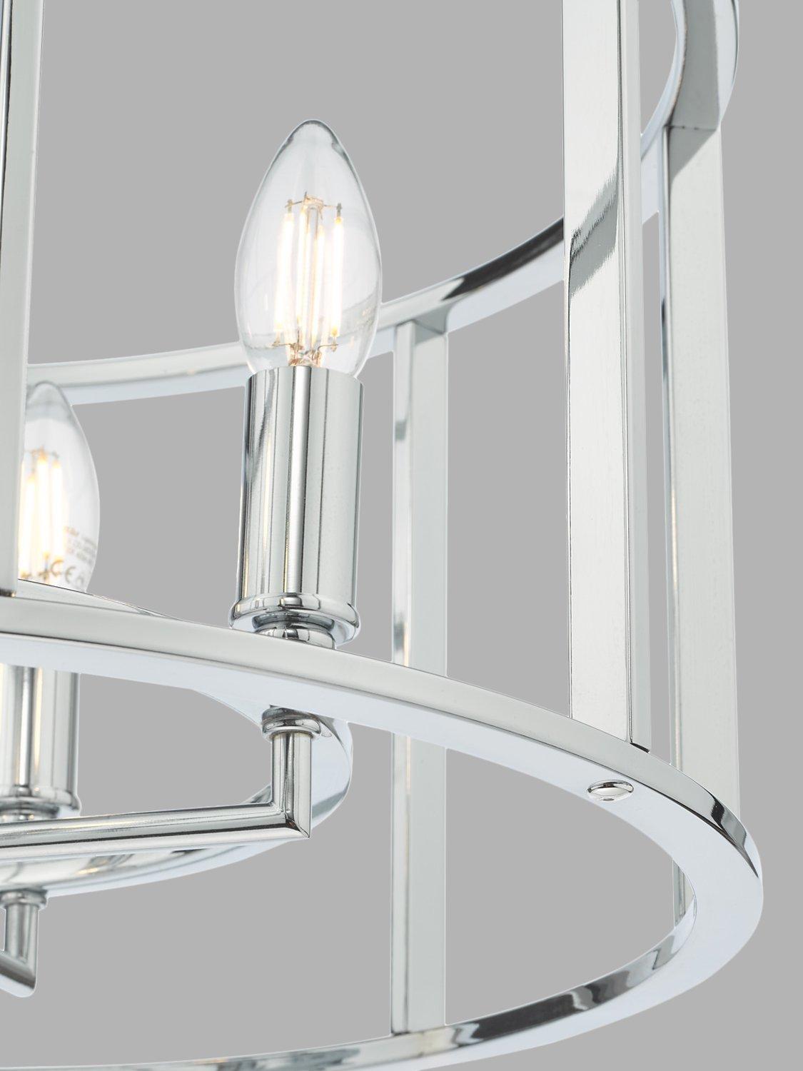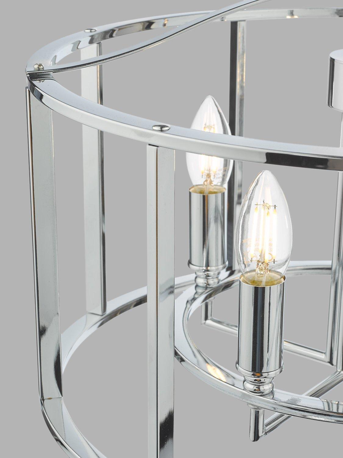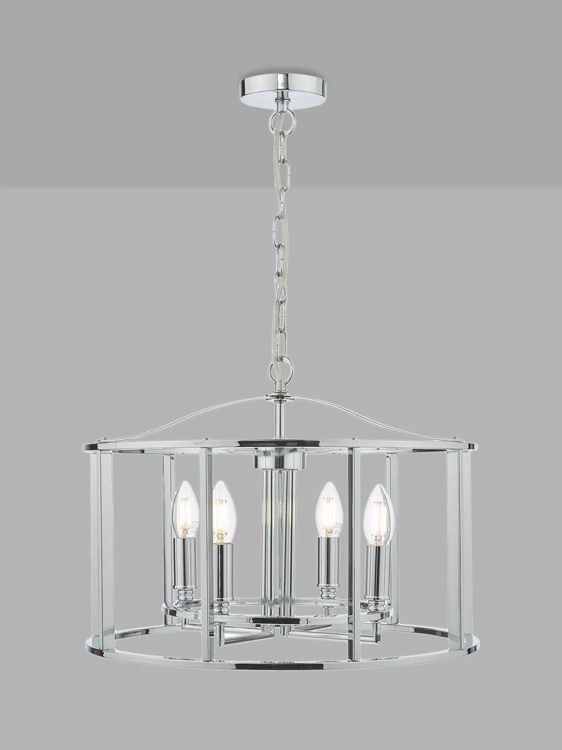 This modern ceiling light provides a warm spread of light around your room thanks to its semi-exposed design. Made from polished chrome, it's curved, cage shape houses a total of four bulbs and the chain can be height-adjusted on installation to suit your space. Also available in a larger size.
