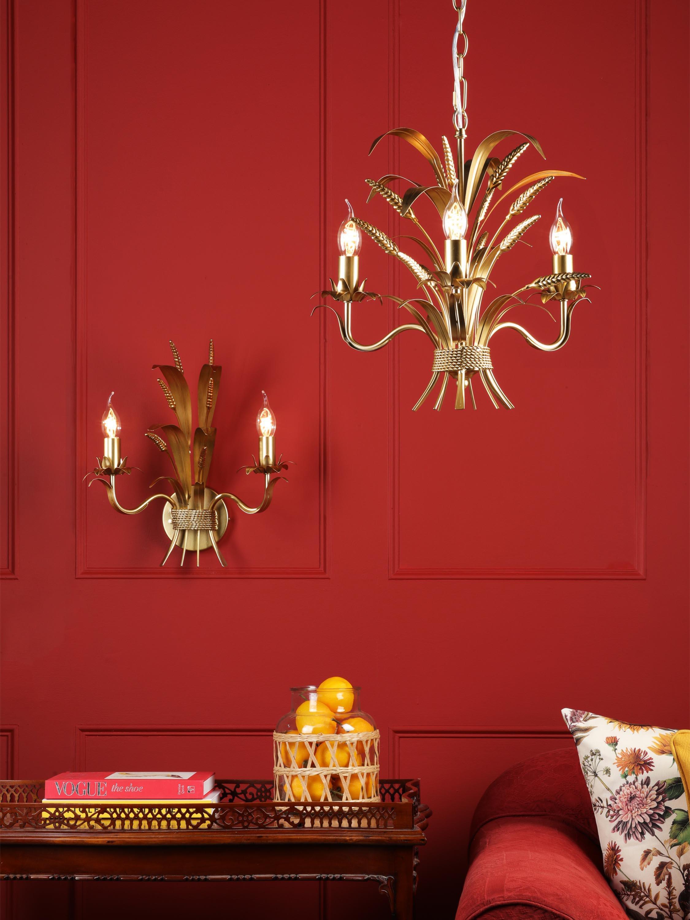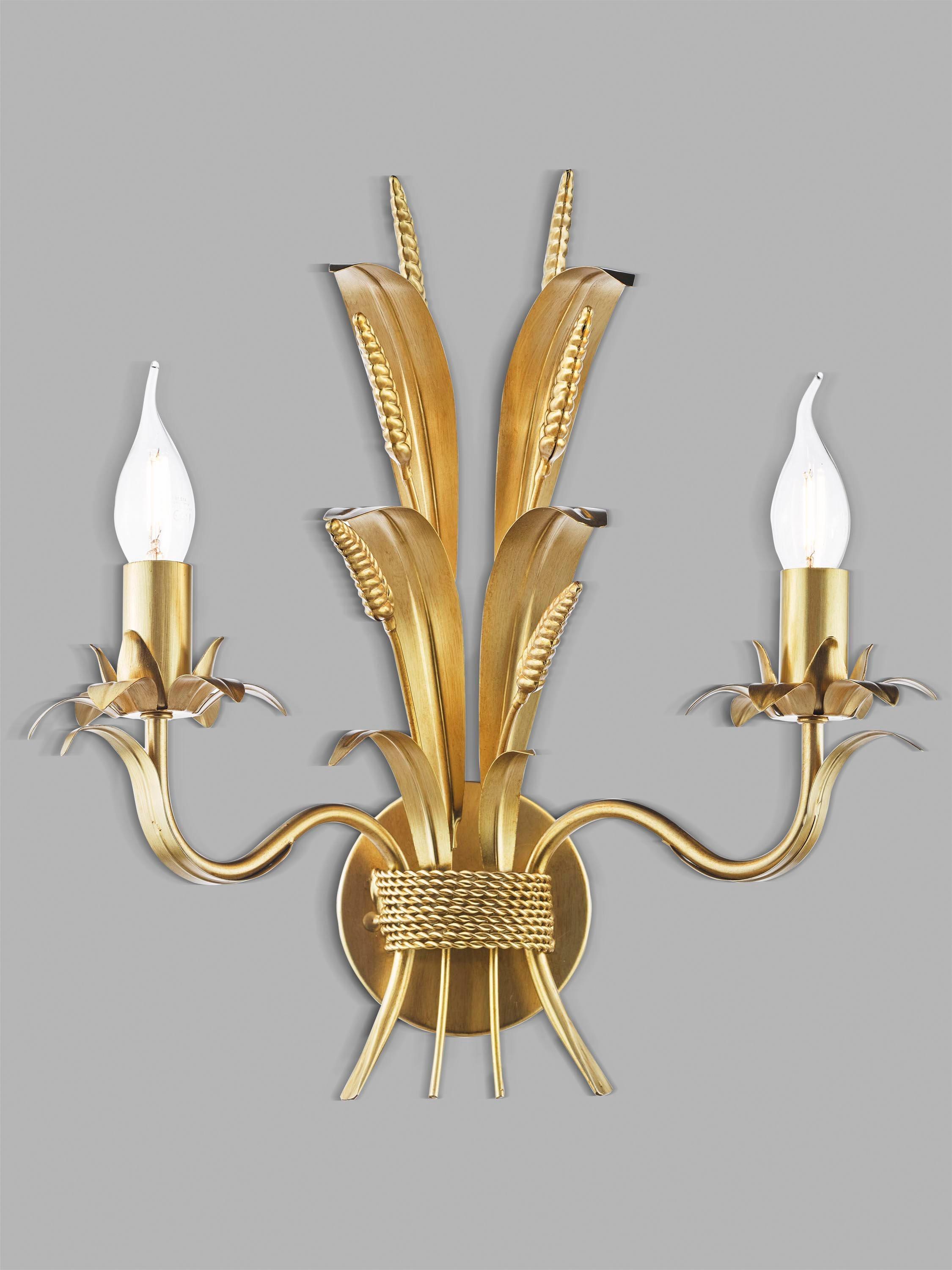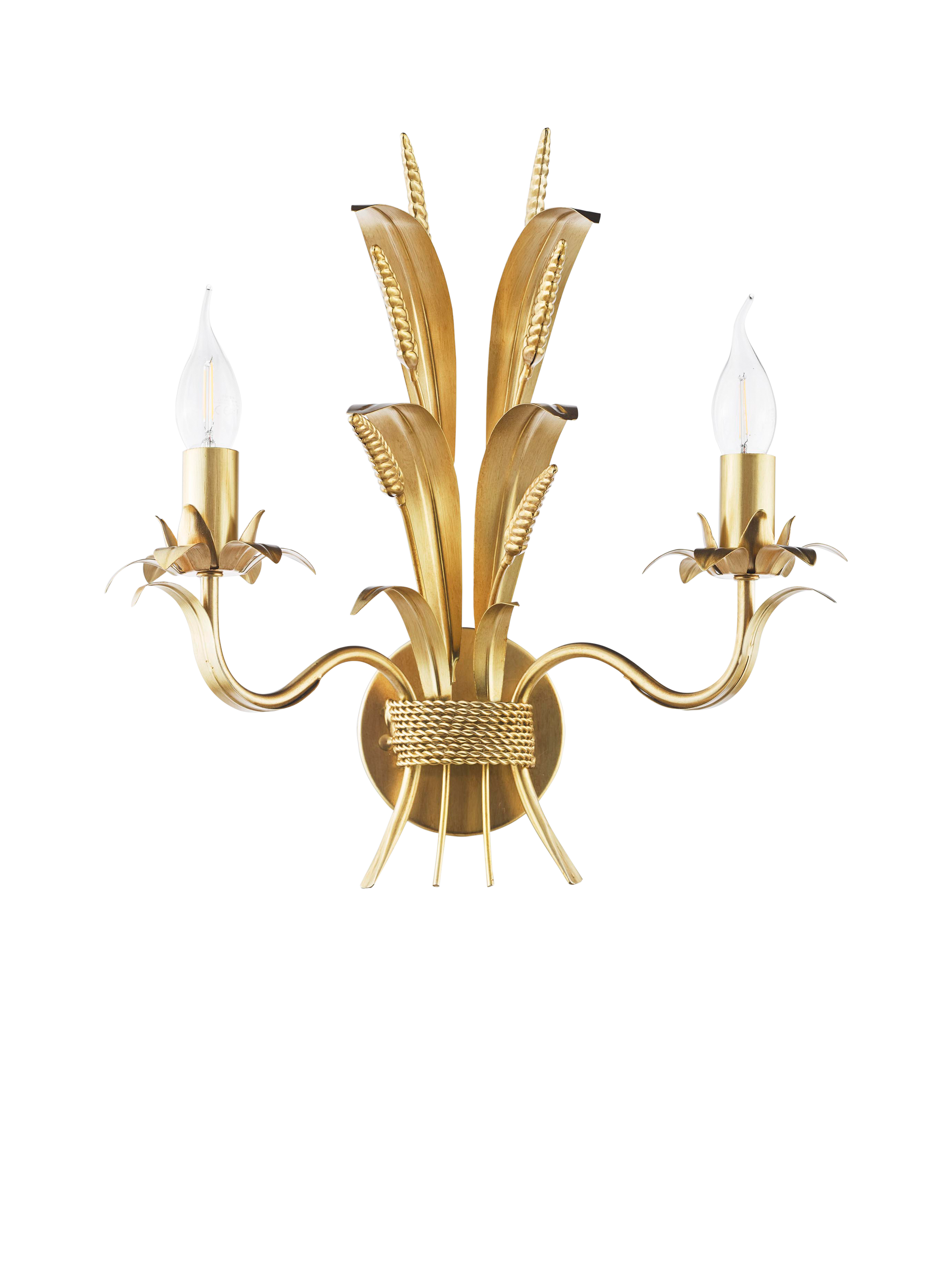 Bring a touch of Italian elegance to your home with the Phaedra 2 Lamp Wall Light. This stunning gold-toned wall light features hand-applied wheatsheafs and leaves, drawing inspiration from classic Italian toile lighting. The painted gold-effect finish adds a luxurious sheen, making it a captivating focal point in any room.