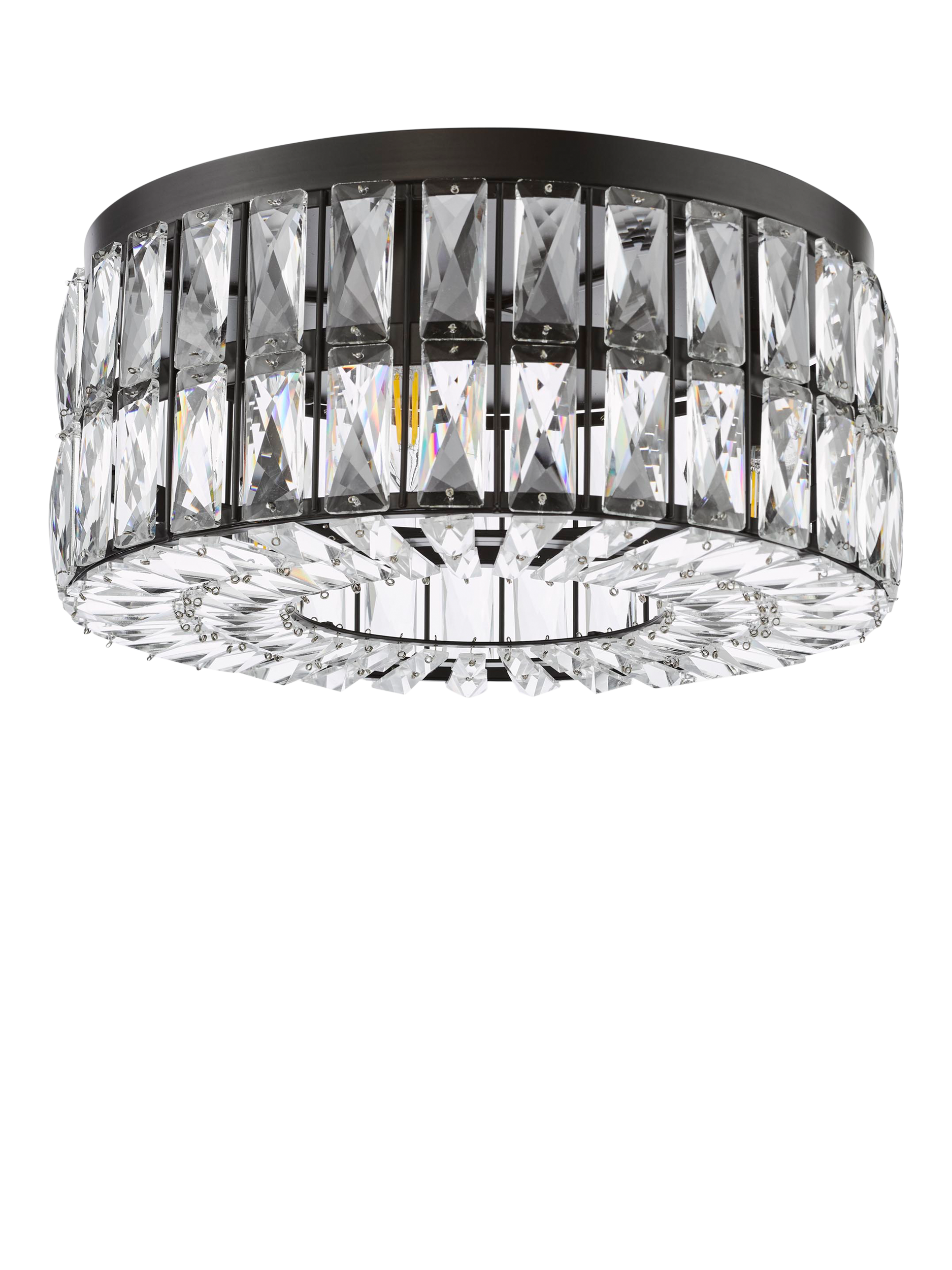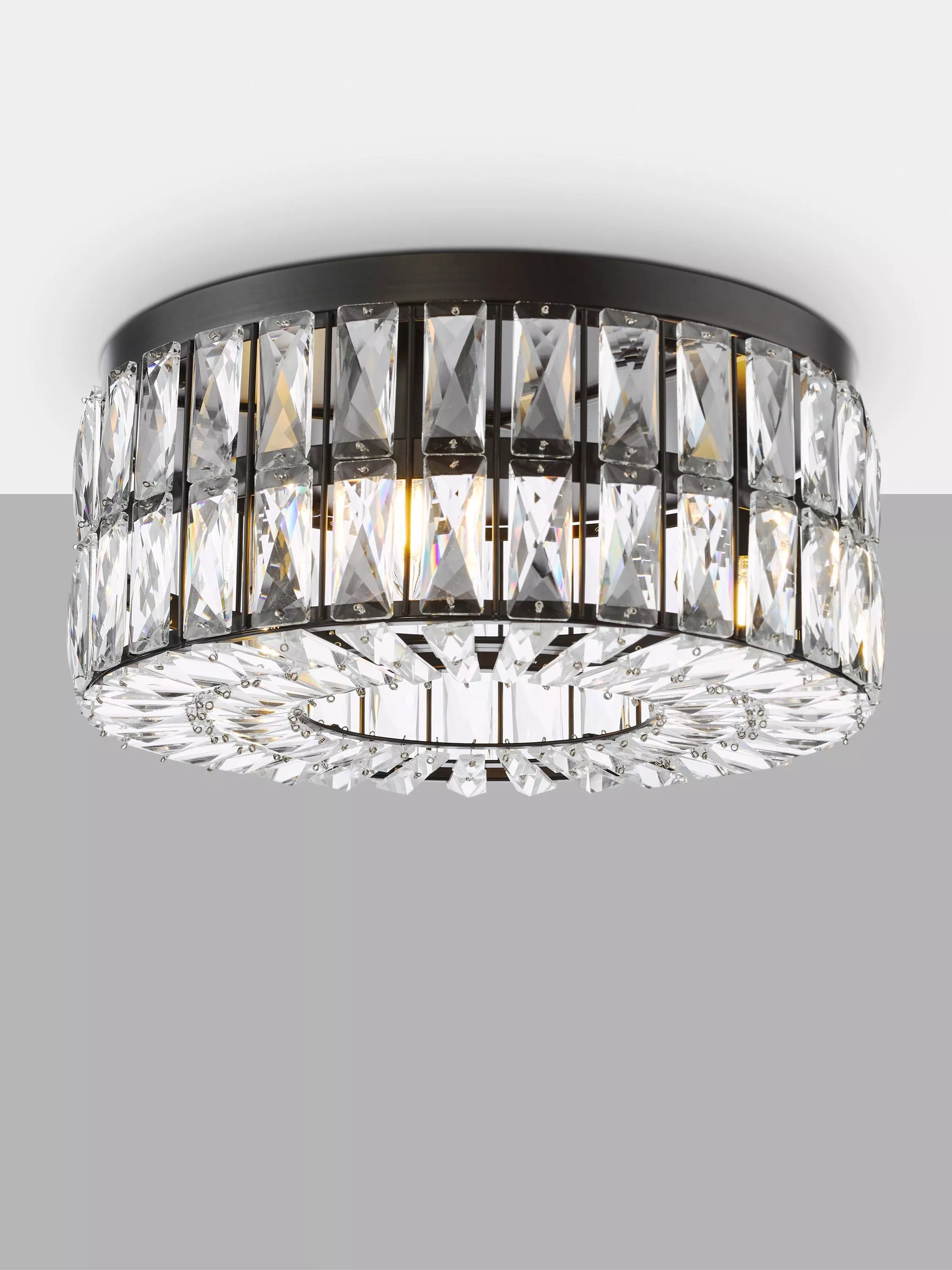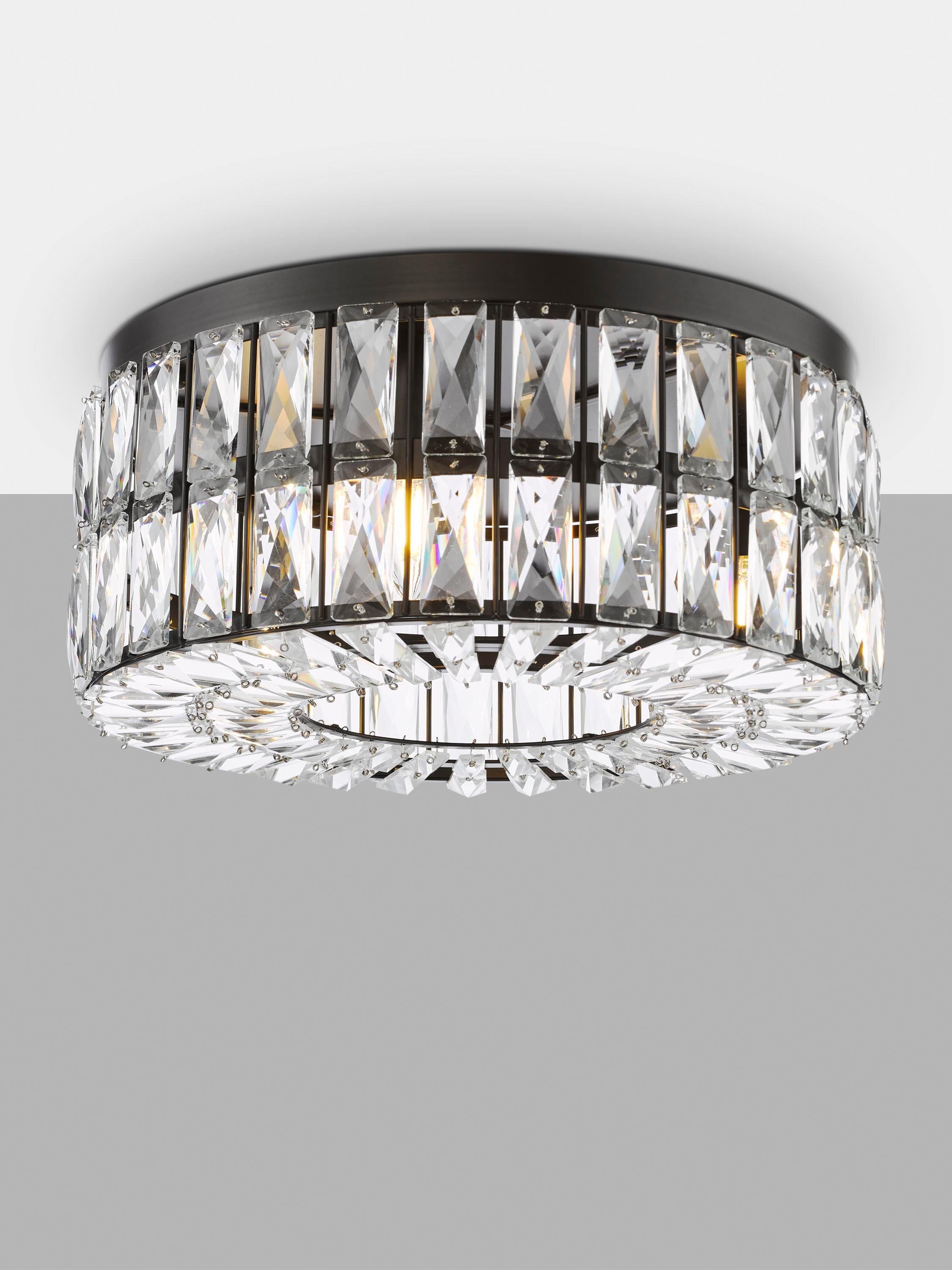 The Relena flush-mounted ceiling light is a striking fixture combining a sleek matt black finish with sparkling crystal accents, great for adding a touch of drama to rooms with height restrictions. Designed specifically as low-ceiling lighting, the Relena's flush-mount style hugs close to the ceiling, making it ideal for hallways, bedrooms or any area where space is at a premium.