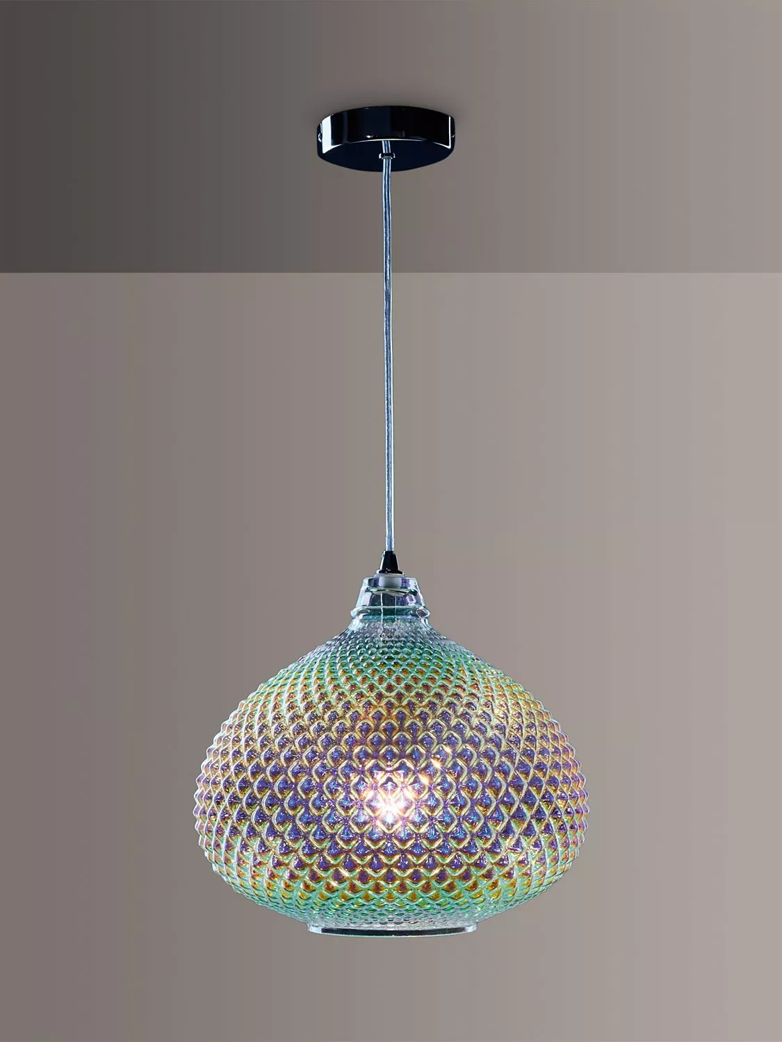 This pendant is made from textured glass with an iridescent, oil-effect finish. When switched on, it creates a striking light effect on surrounding walls and will draw the eye with its subtle accents of colour. Polished chrome hardware lends a smart touch and the cable is height-adjustable at the point of installation.