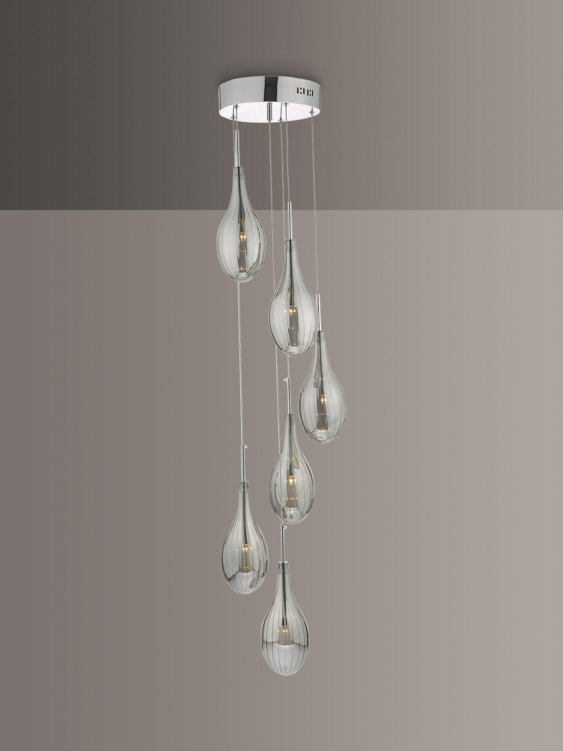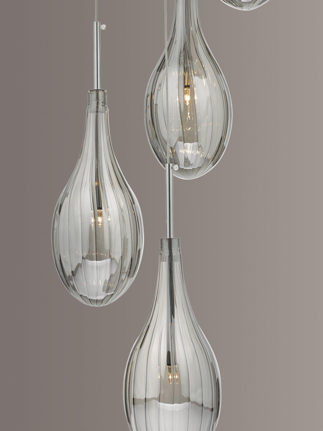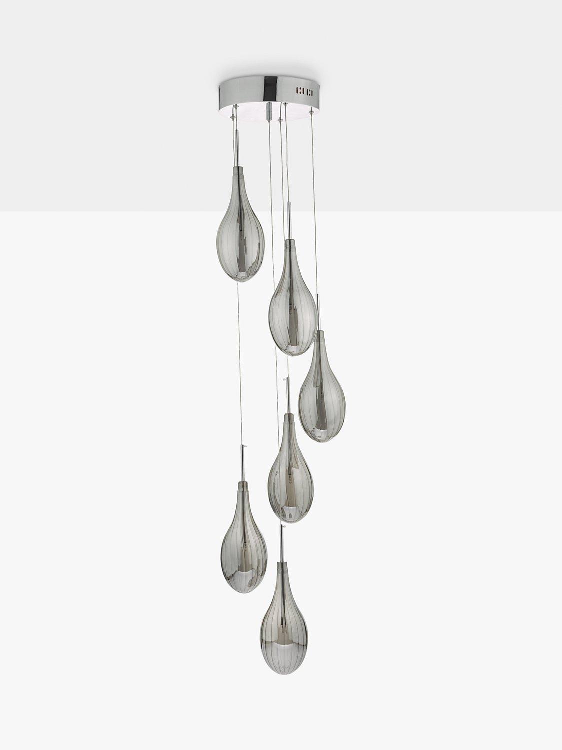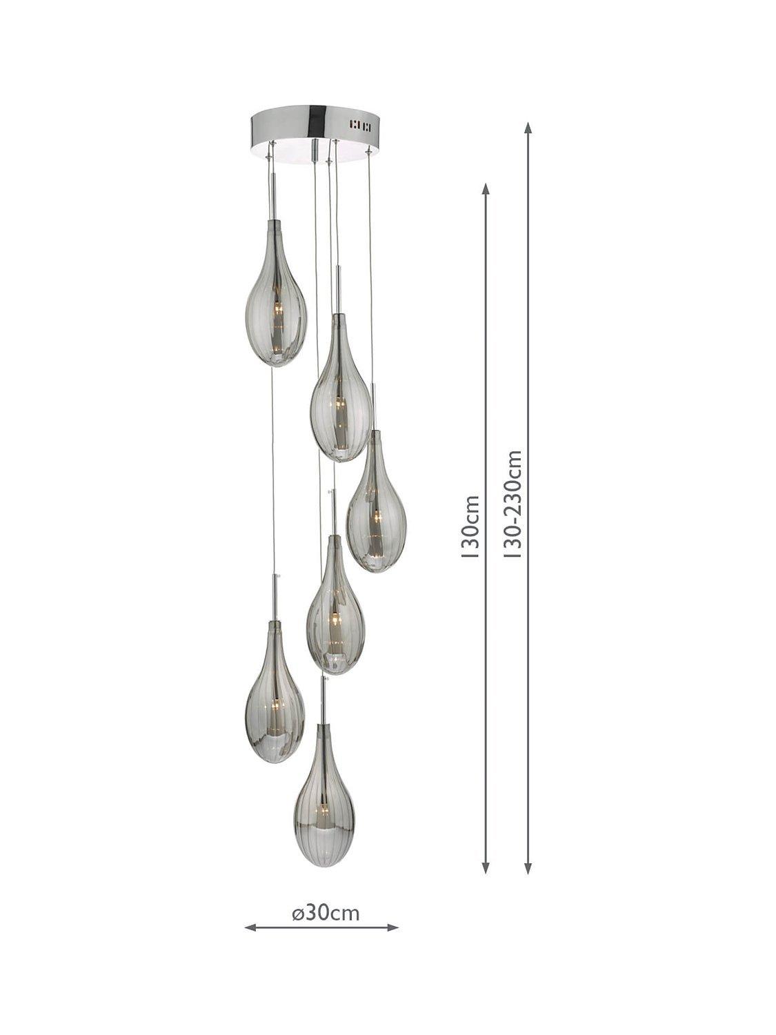 This eye-catching ceiling light features six ribbed glass shades, designed in a droplet shape with a smoked finish. With the addition of polished chrome, it's a modern choice for your home and offers a warm glow of light. Ideal for creating a focal point in your space.