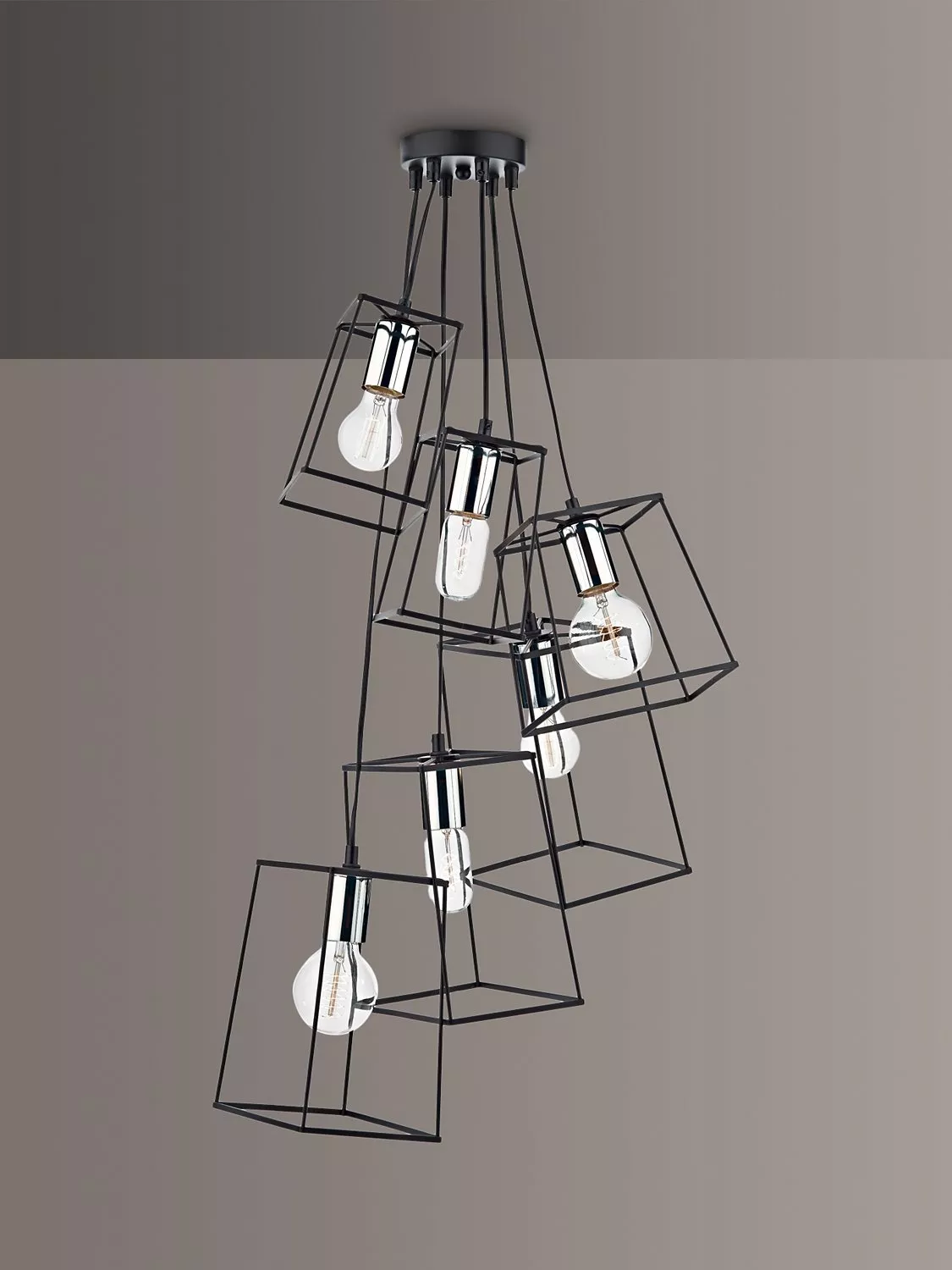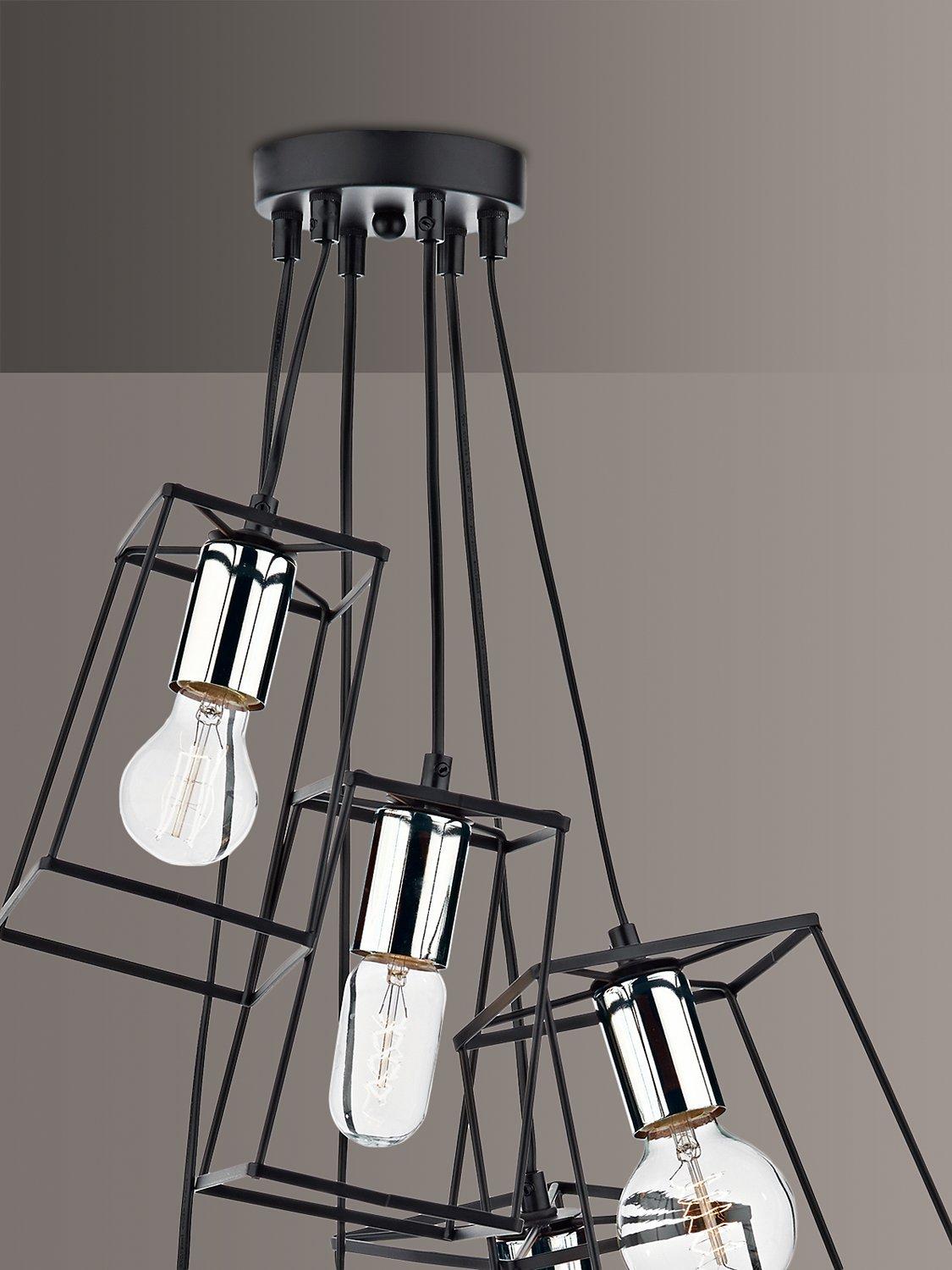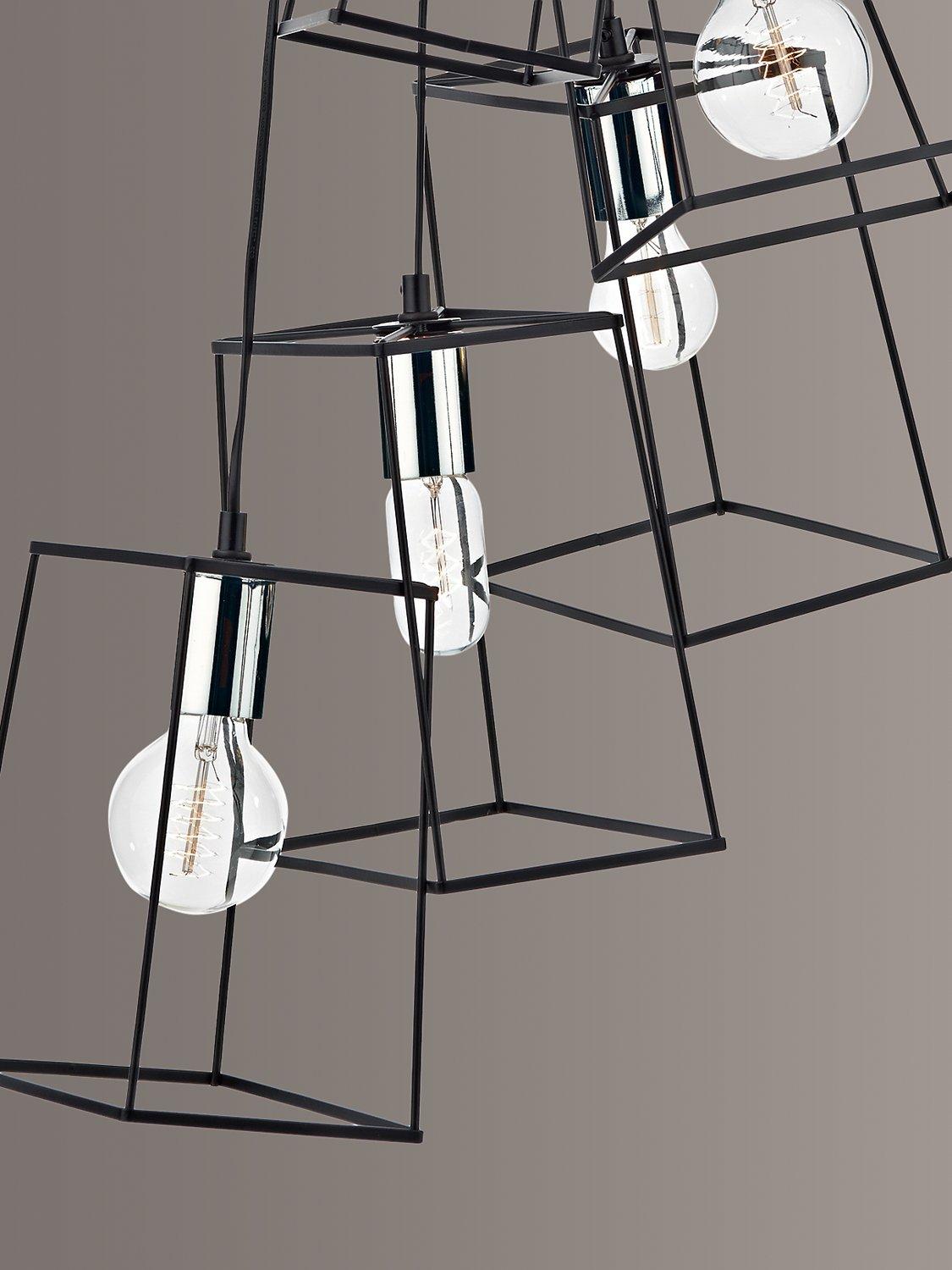 This ceiling light is made up of cascading metal frames in a matt black finish and contrasted with a polished chrome bulbholder. Perfect for framing vintage style decorative lamps. It's also height adjustable at the point of installation to a maximum of 1.3m.