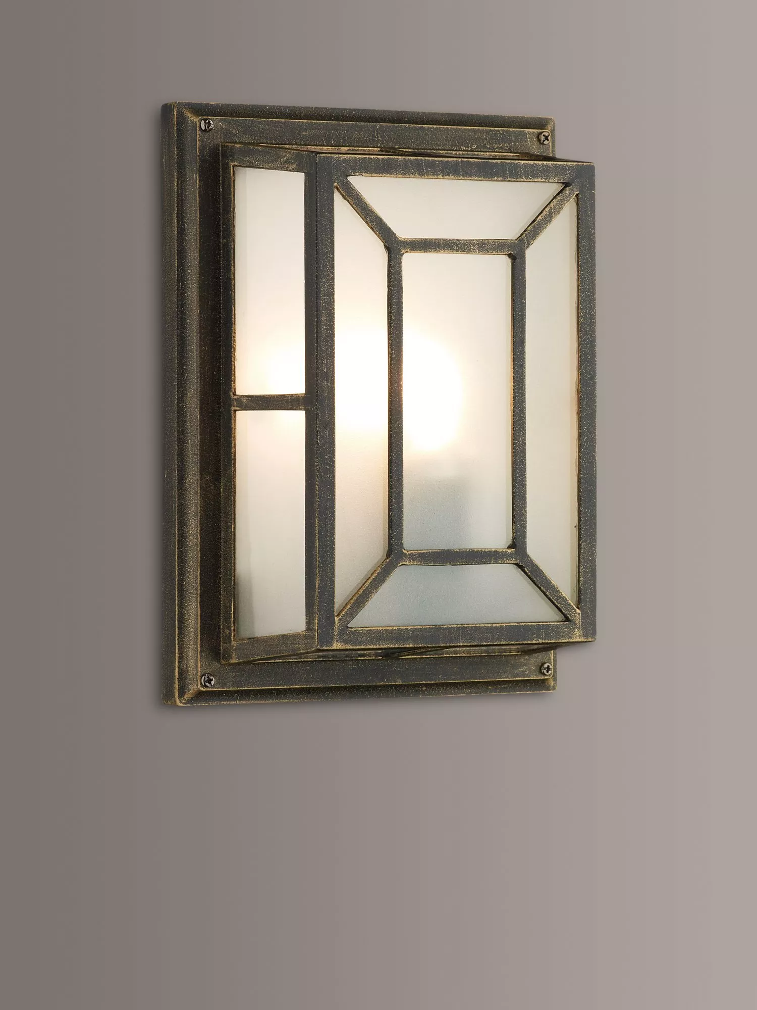 Made with frosted glass panels set within a black and gold patina metal frame, this rustic light fitting can be installed on both walls and ceilings. IP44 rated and resistant against splashing water, it's ideal for illuminating outdoor porches with a soft, yet warm glow of light.