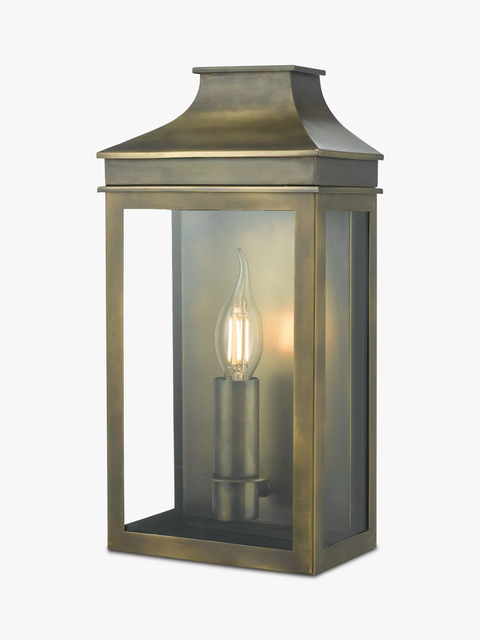 This is a versatile outdoor light with a design that offers a contemporary take on a traditional coach lantern. With an IP44 rating that ensures its durability in outdoor environments and against splashing water, it requires one bulb and provides a warm glow of light. The Weathered Brass option has a hand finished brass finish and the Black option is finished in a tough, matt black powder coat.