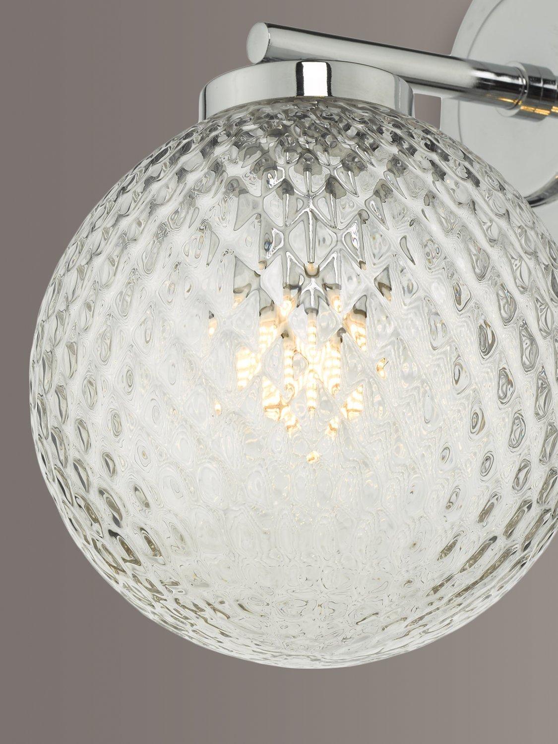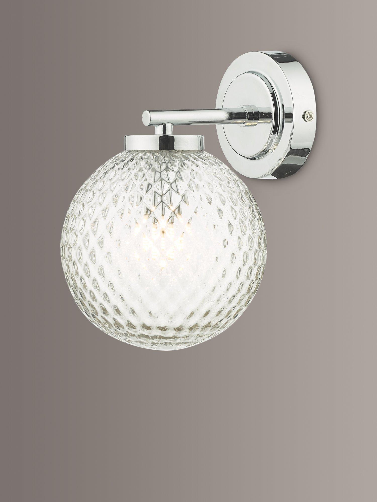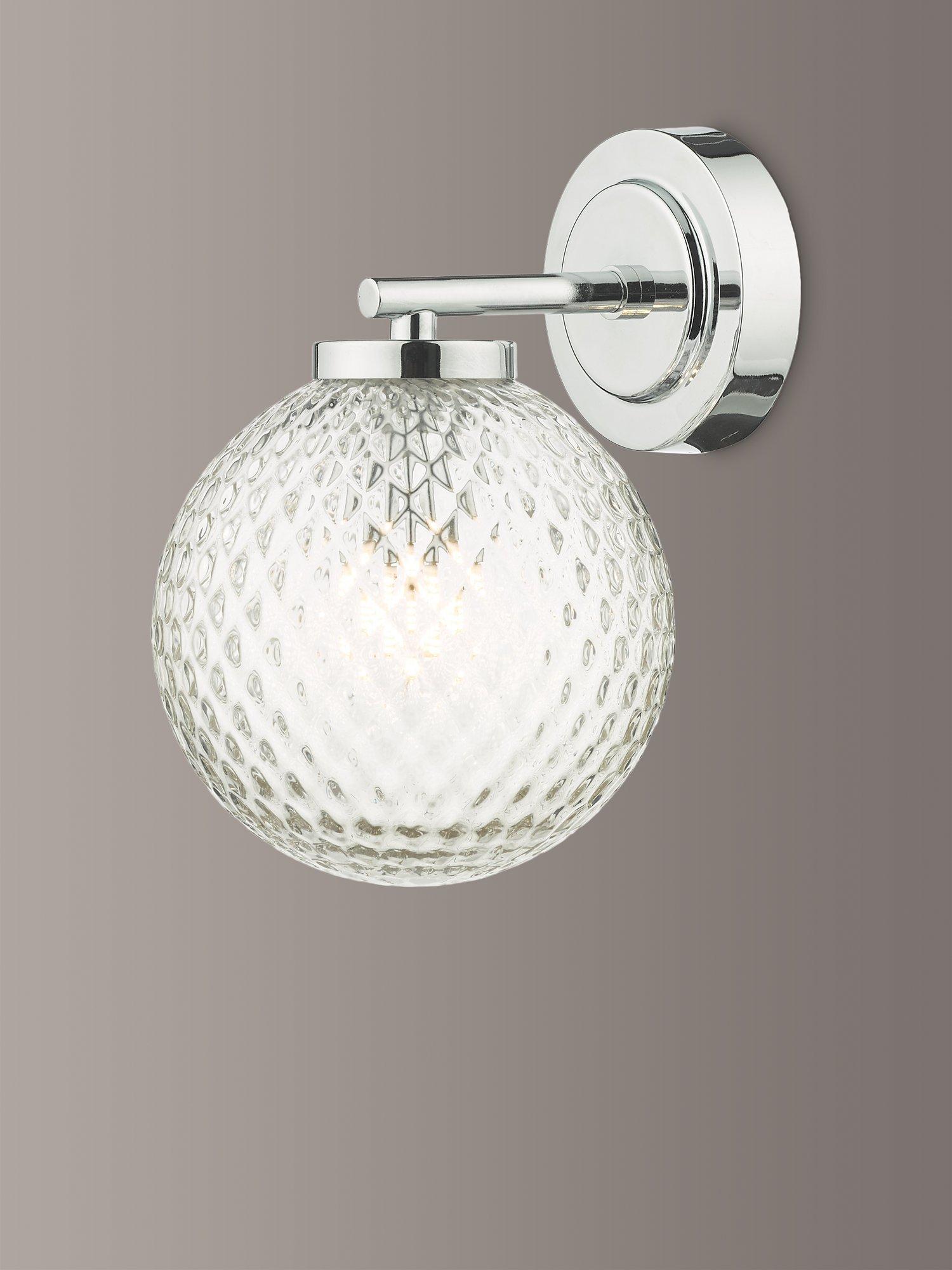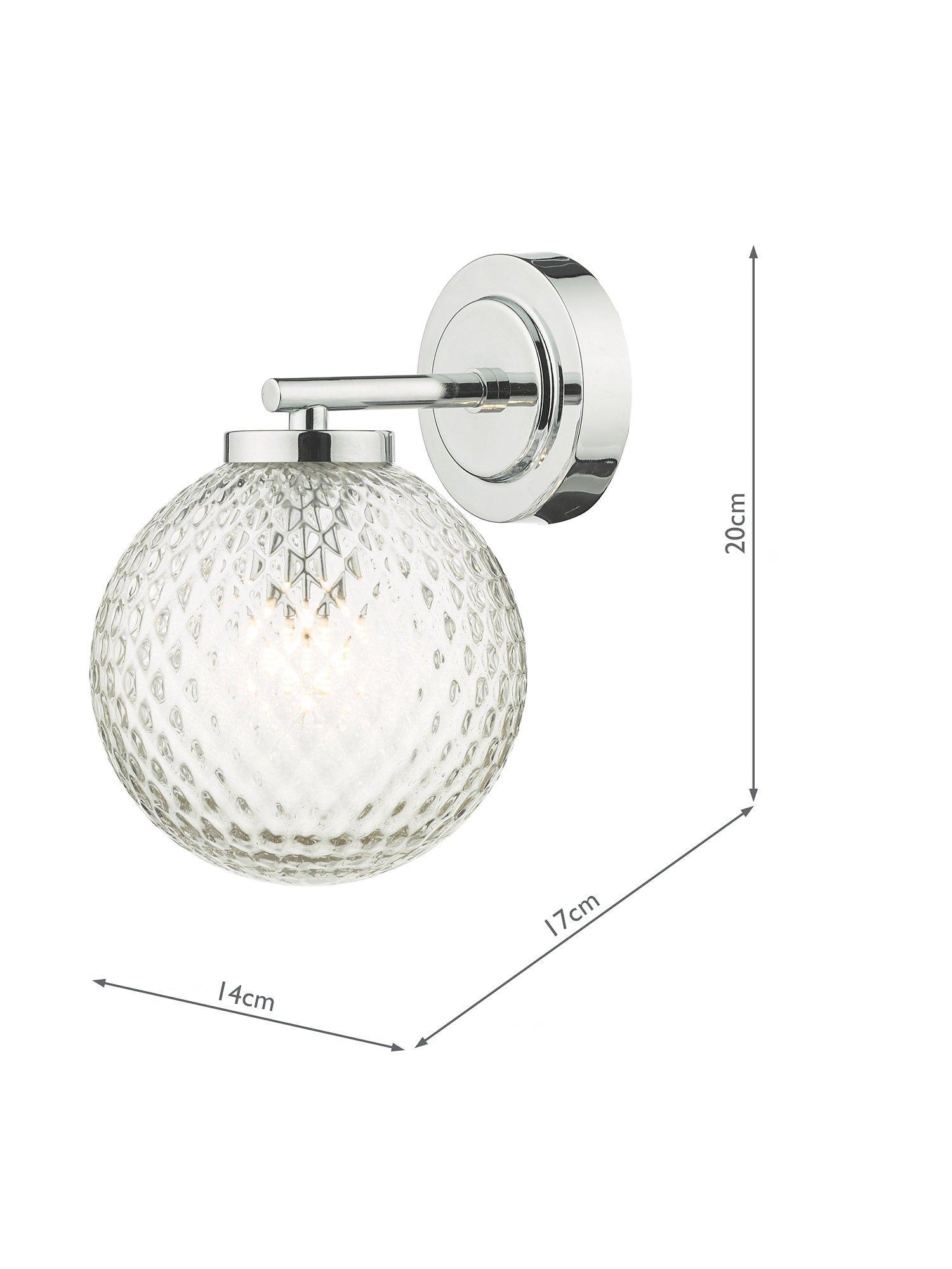 This compact wall light can be safely installed in bathrooms. It's made with a textured glass shade that enhances an eye-catching light effect when switched on, but looks equally as impressive when the light is switched off. The polished chrome wall plate adds a smart and versatile finish.
