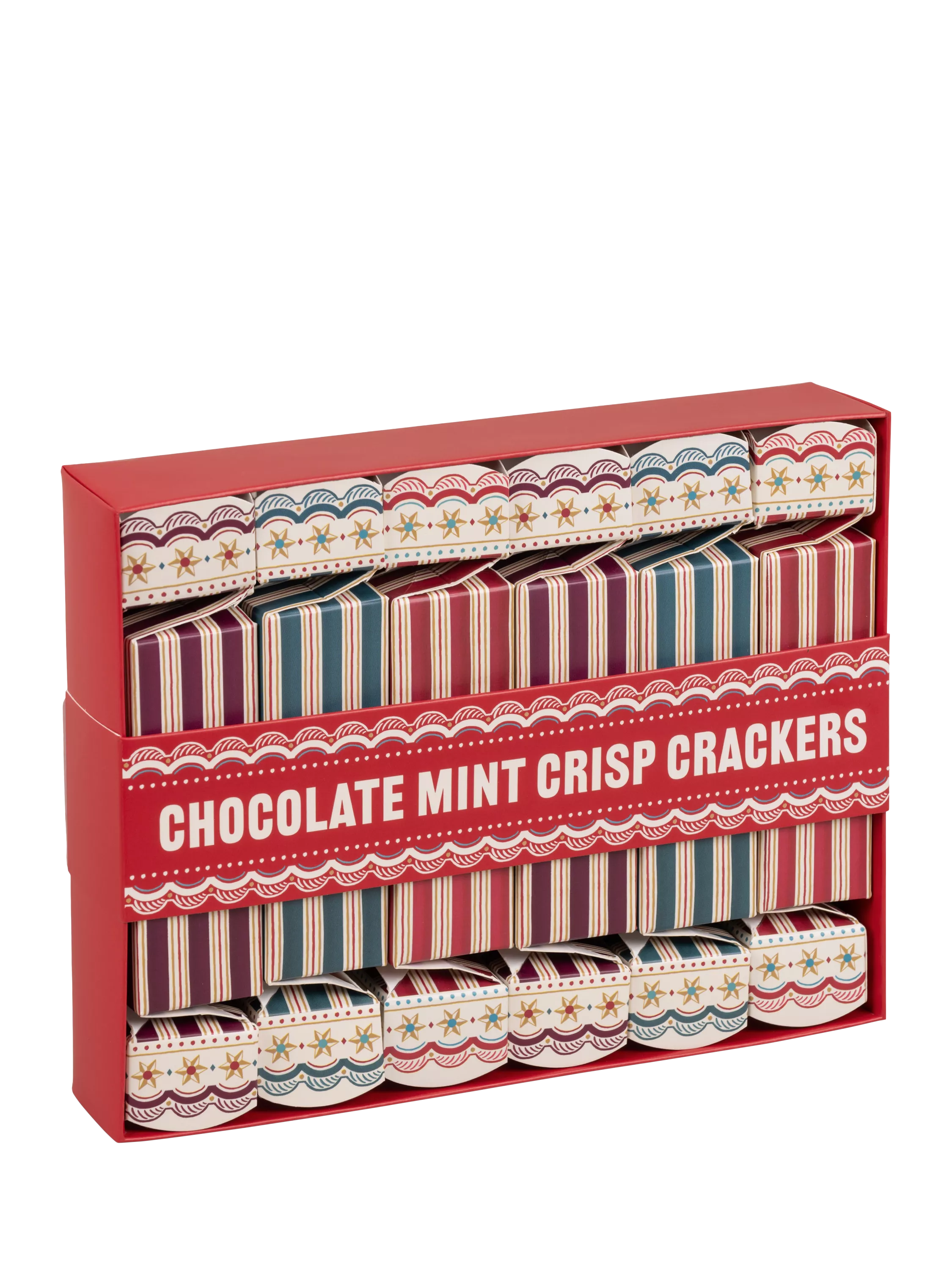 Six mini crackers each containing four dark chocolate mint crisps. These make an excellent table gift for festive meals or even a sophisticated dinner party.