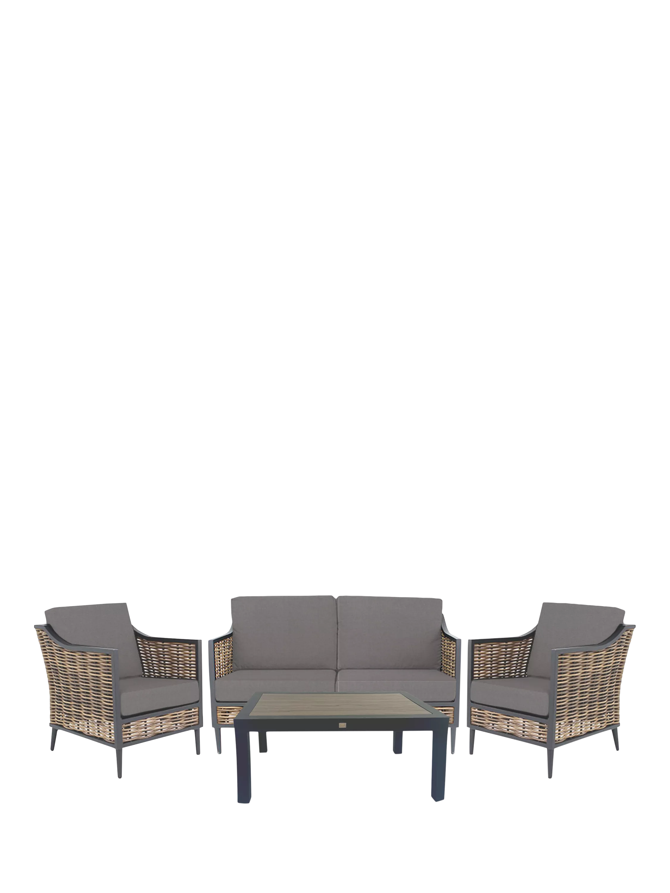 The striking Langley Lounge Set adds drama to any patio with its chunky 10mm raffia weave, bordered with powder-coated all-weather aluminium frames and topped with deep-seated cushioning.
