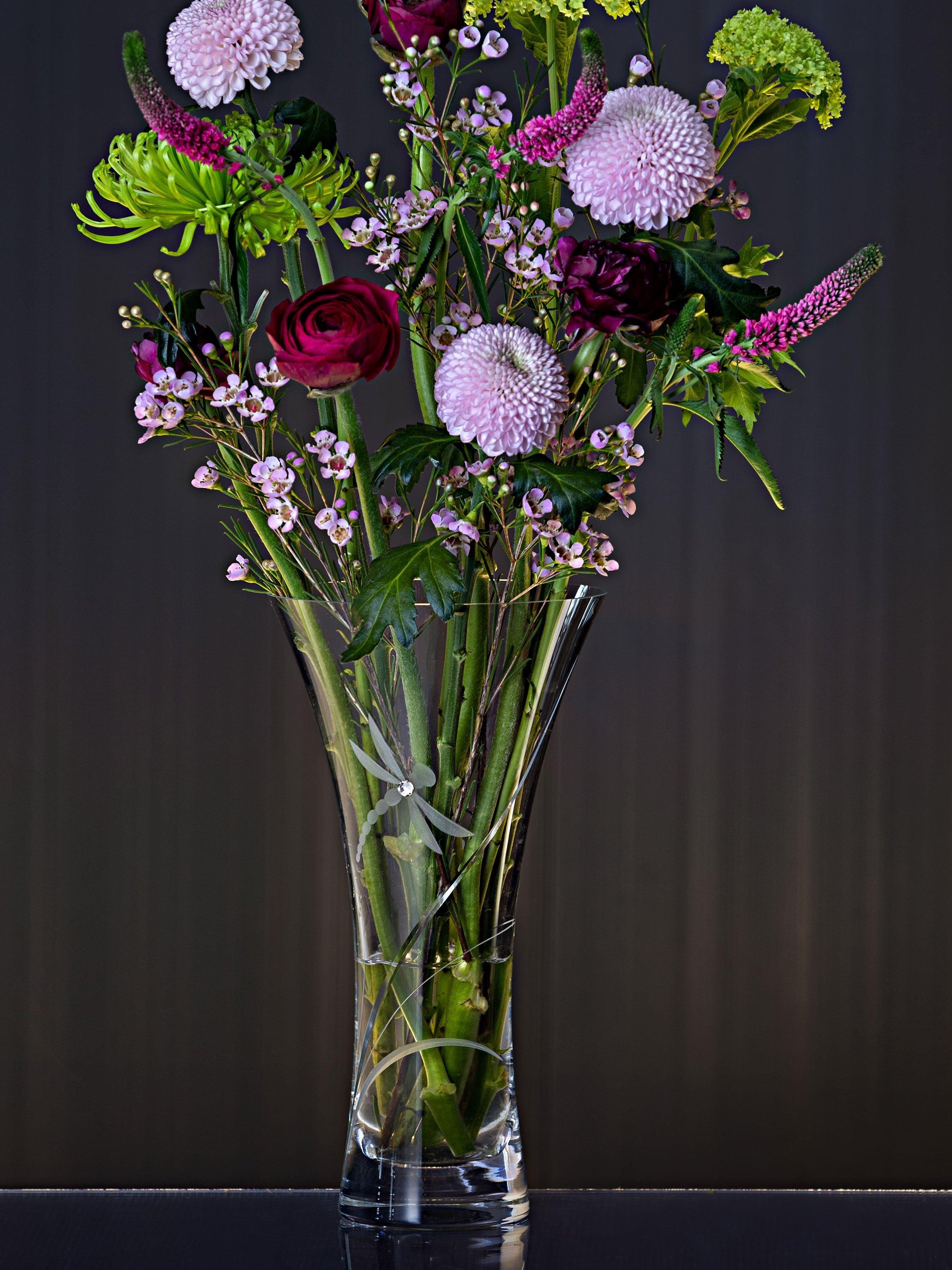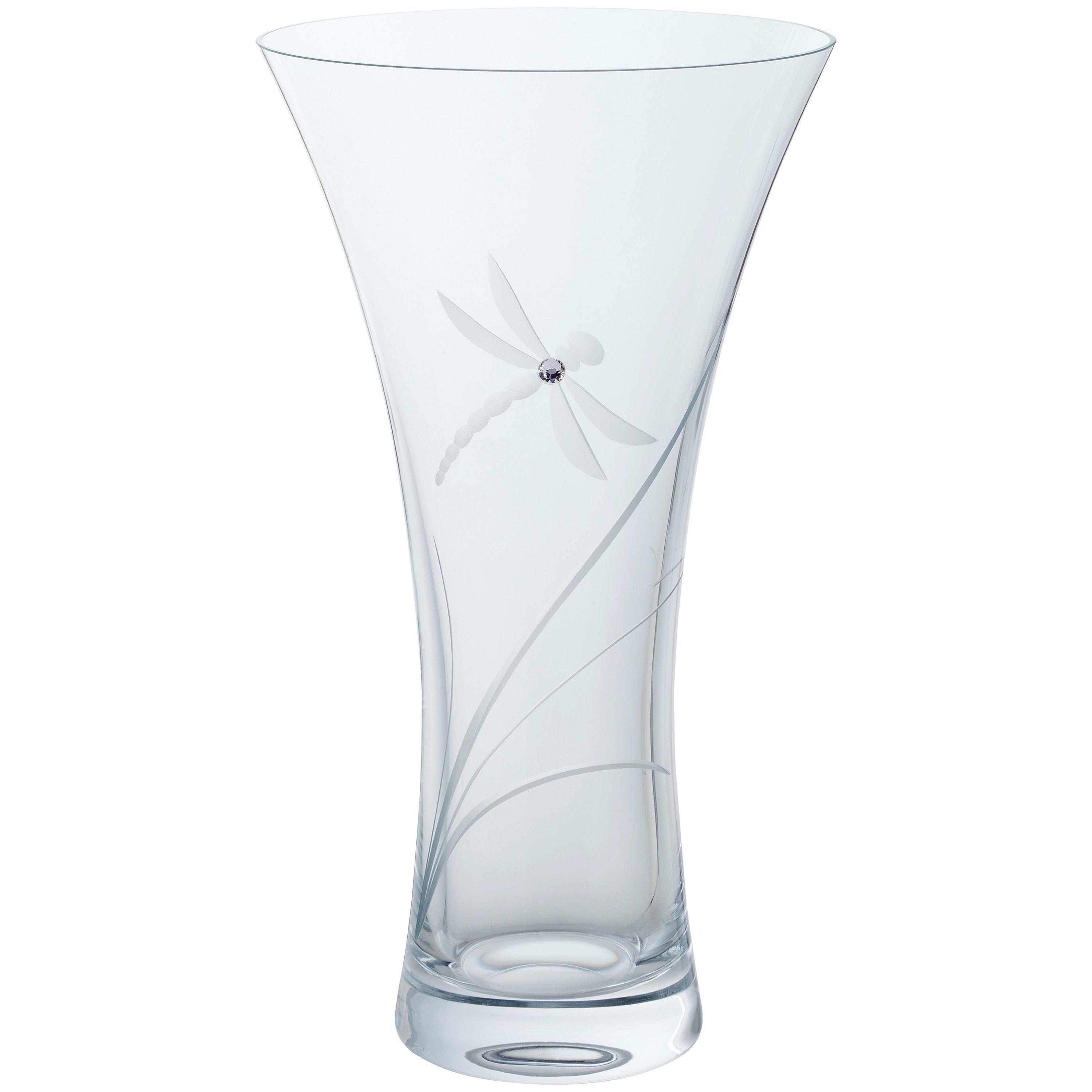 This beautiful crystal Dartington vase is hand cut and features Swarovski crystals in the shape of a dragonfly in flight. The flared shaped of the vase is perfect for showcasing fresh floral arrangements.