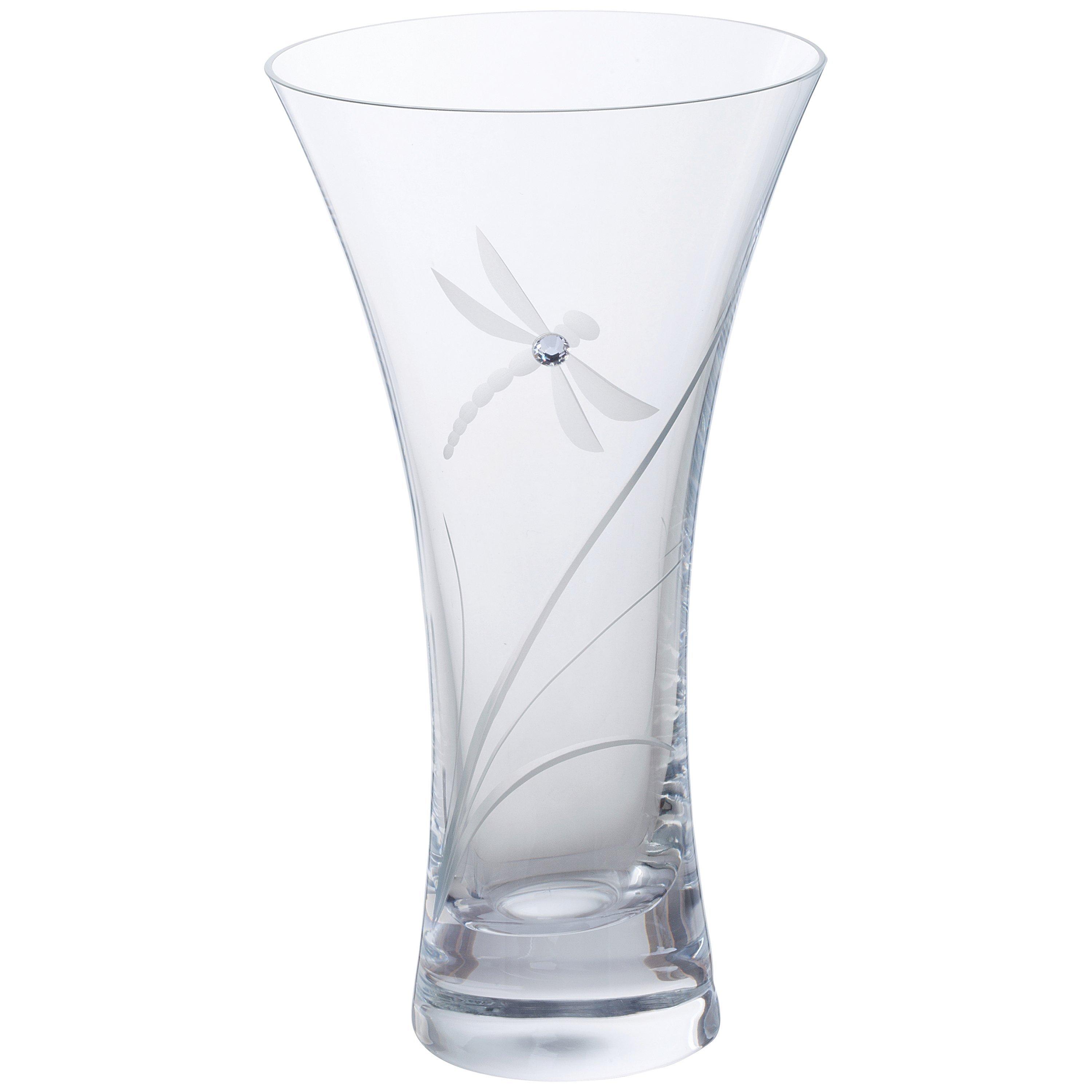 This beautiful crystal Dartington vase is hand cut and features Swarovski crystals in the shape of a dragonfly in flight. The flared shaped of the vase is perfect for showcasing fresh floral arrangements.