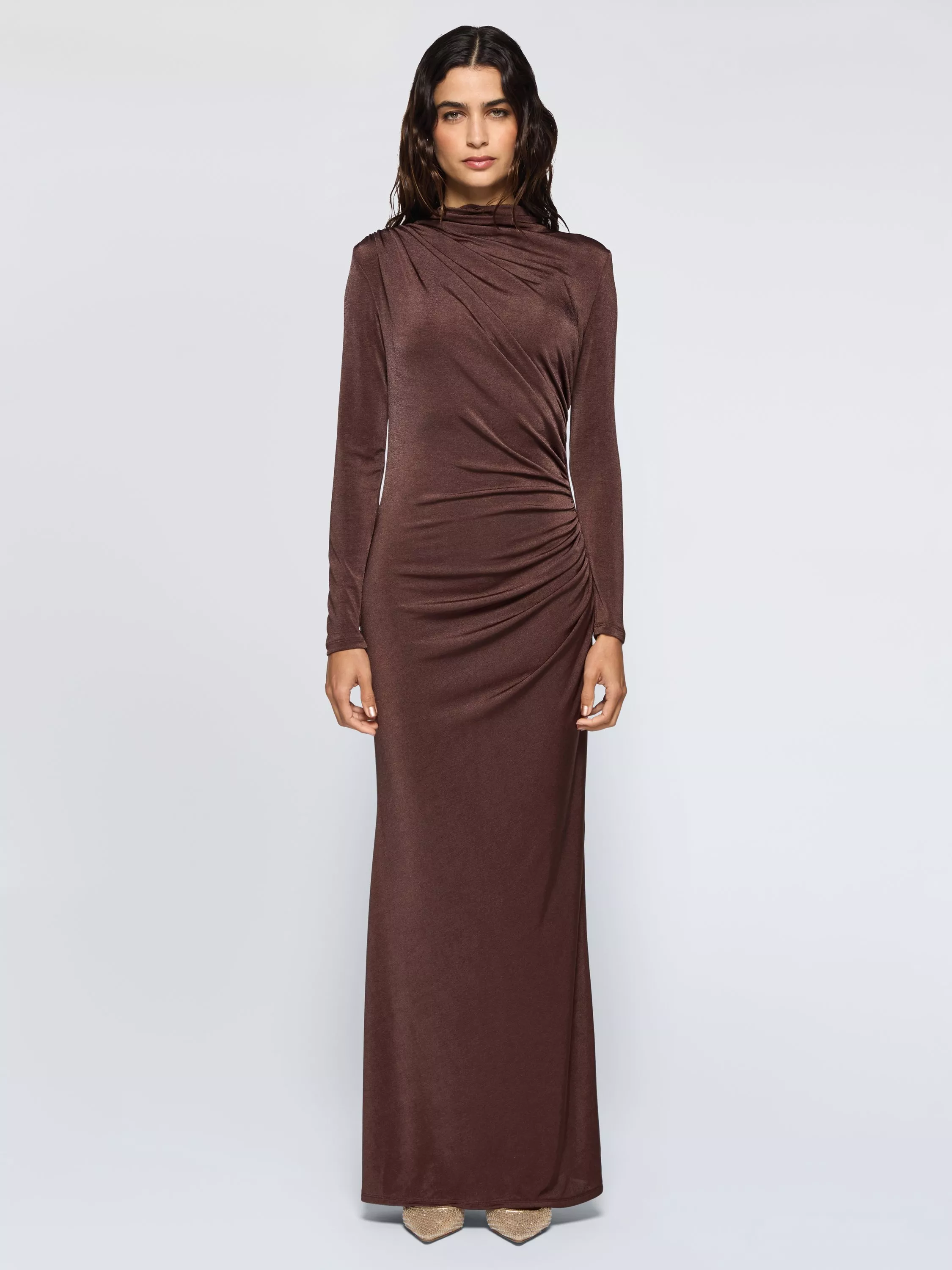 A softly draped, ruched maxi dress by DASKA. The high neck and long sleeves offer refined comfort, while slim tailoring and soft, stretchy fabric ensures ease of movement and a striking silhouette. Designed with a shimmery finish.