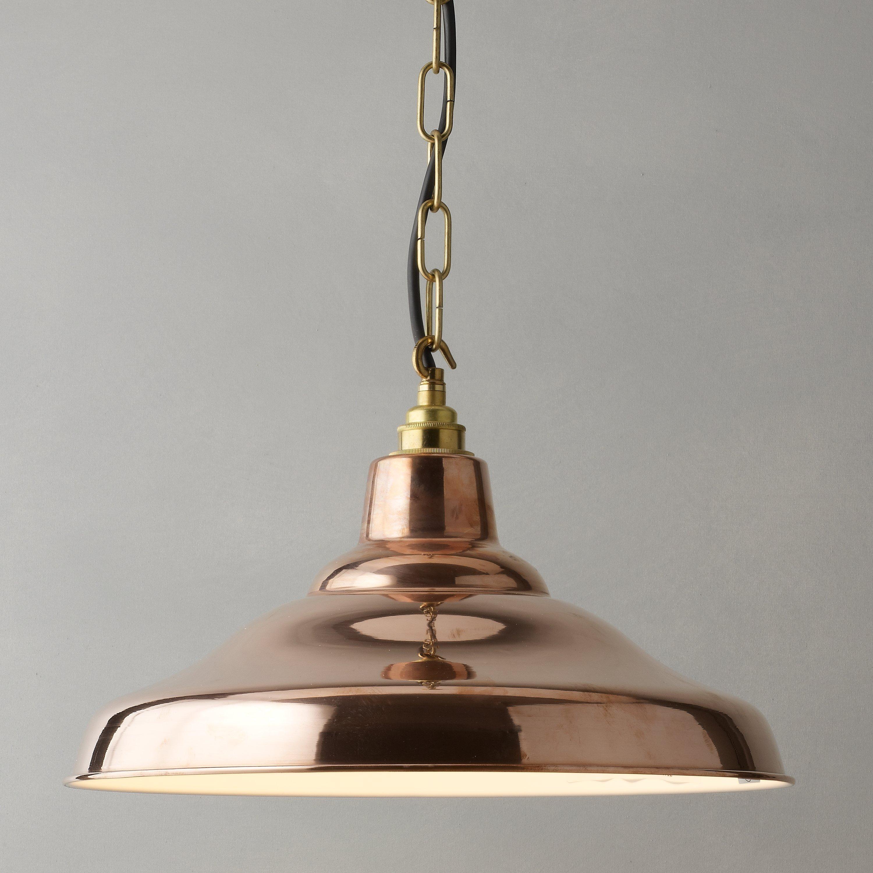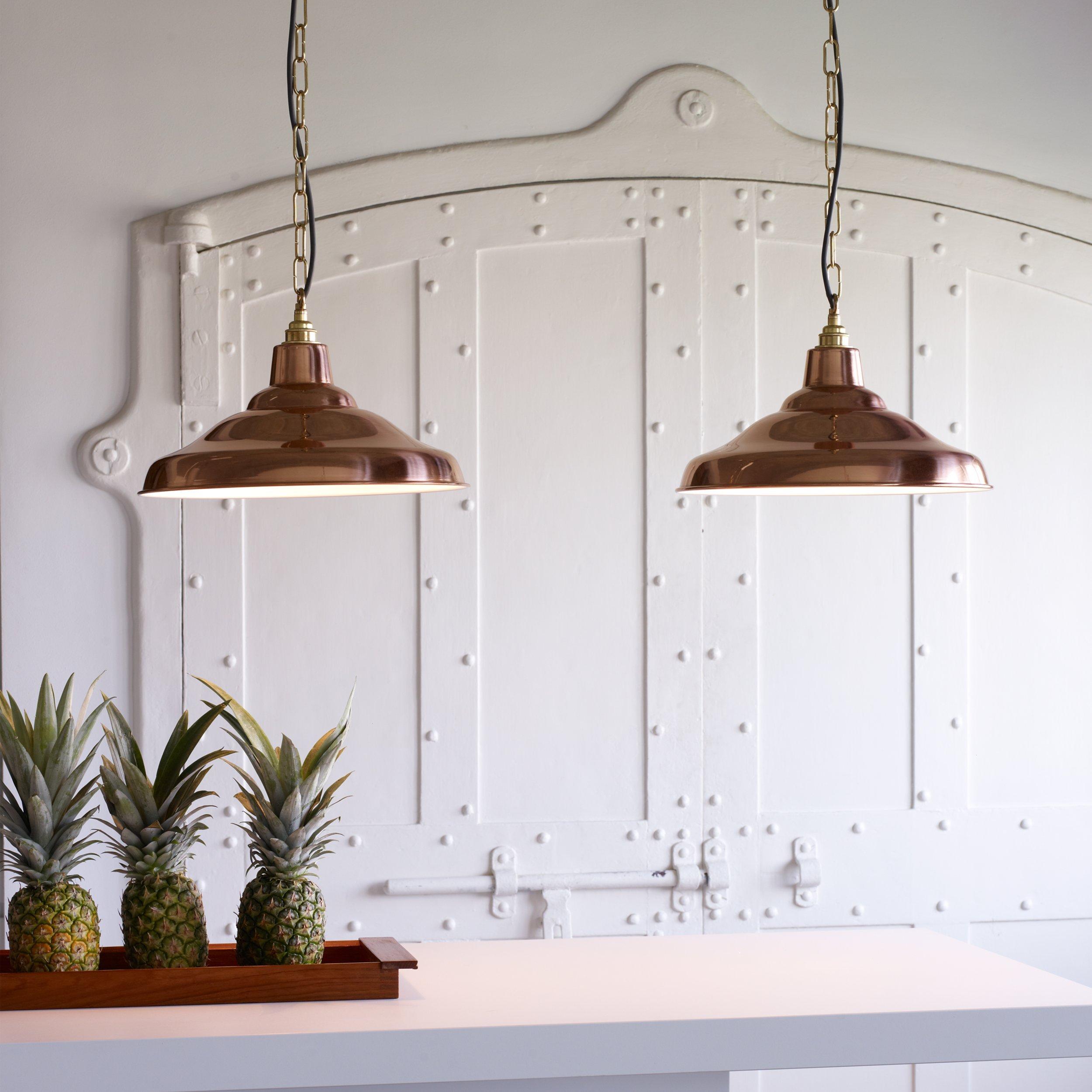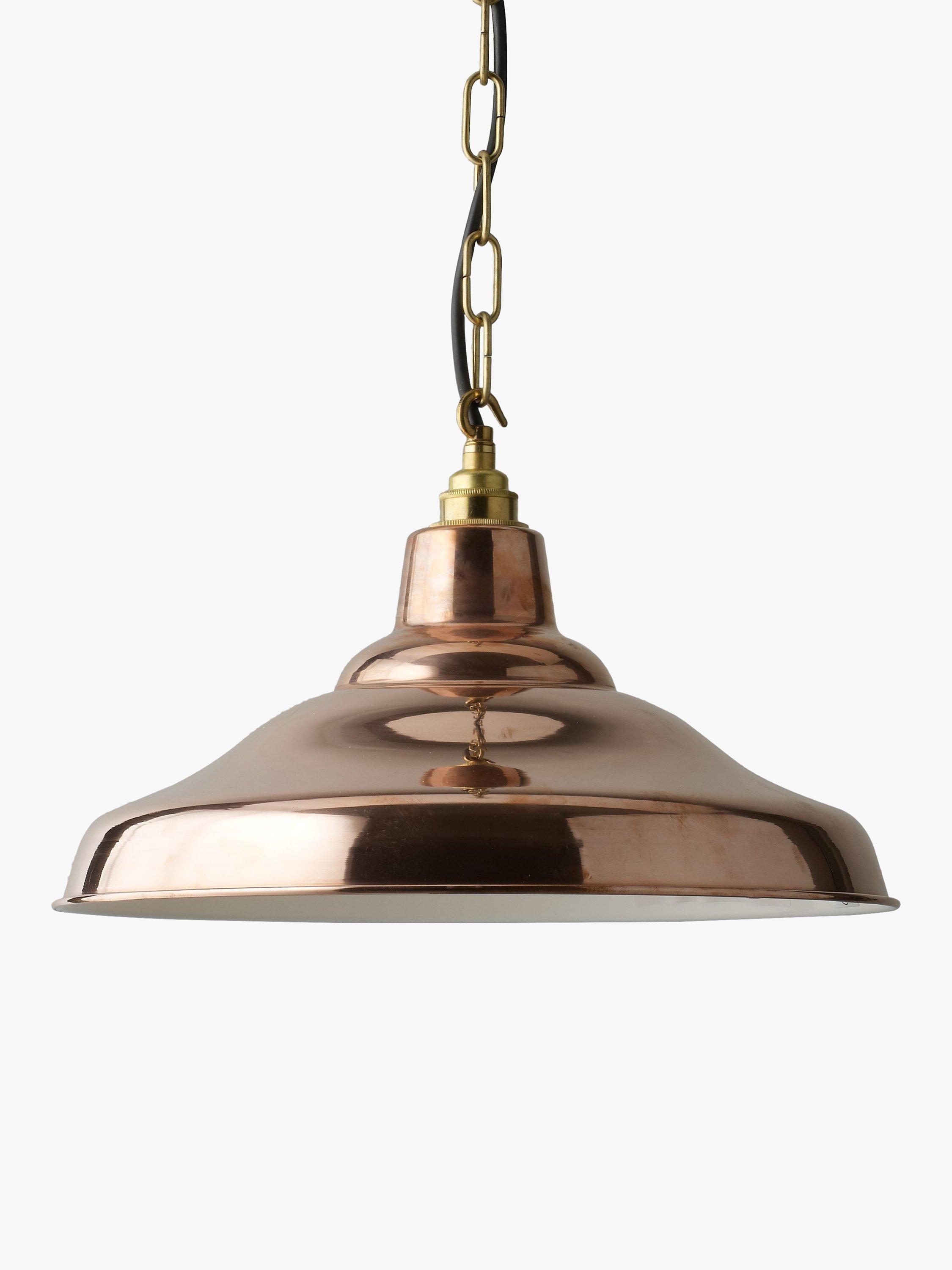Spun factory style reflector in polished copper with a white interior, supplied with 1.5m of cable, chain and ceiling hook plate.