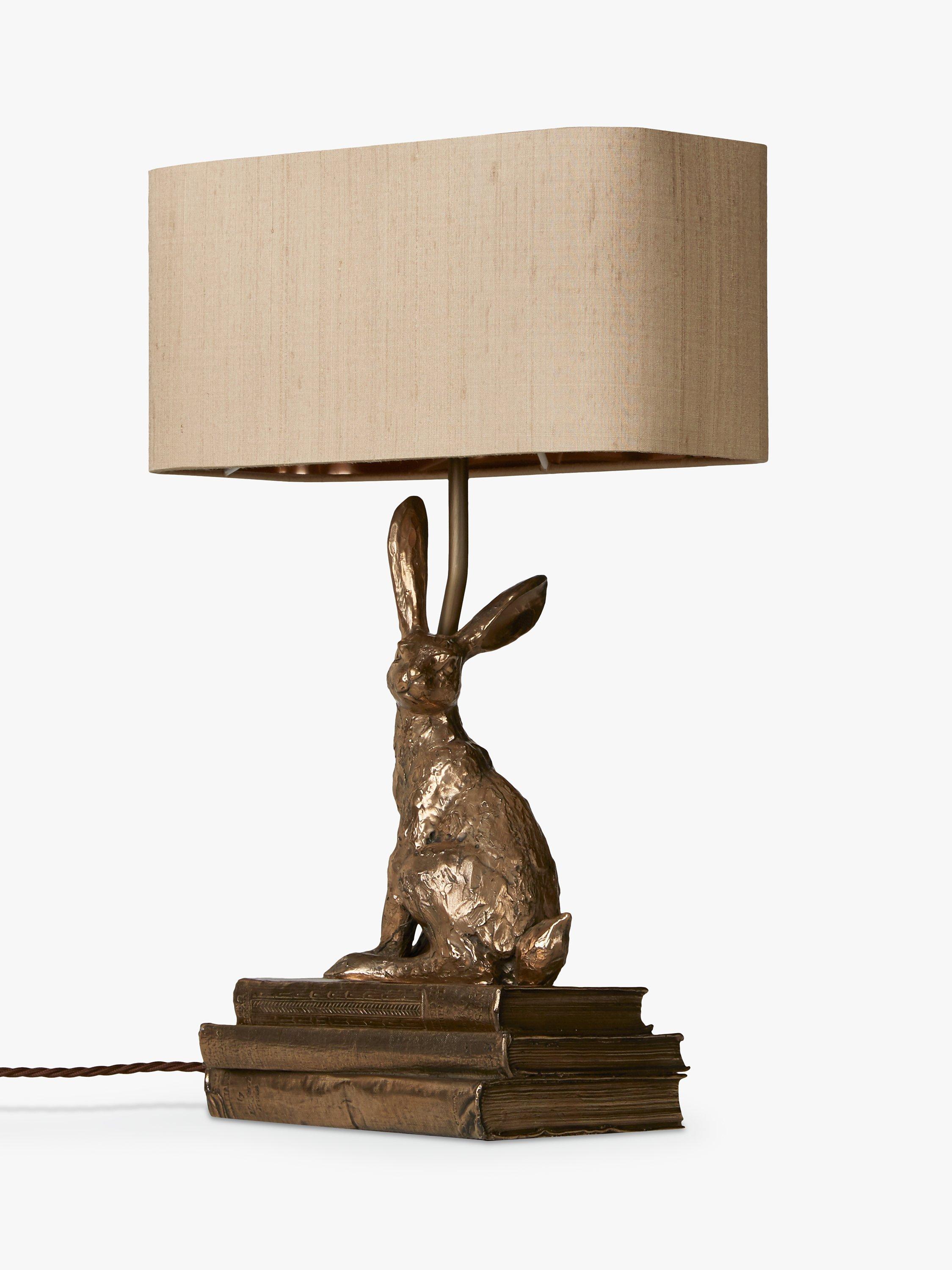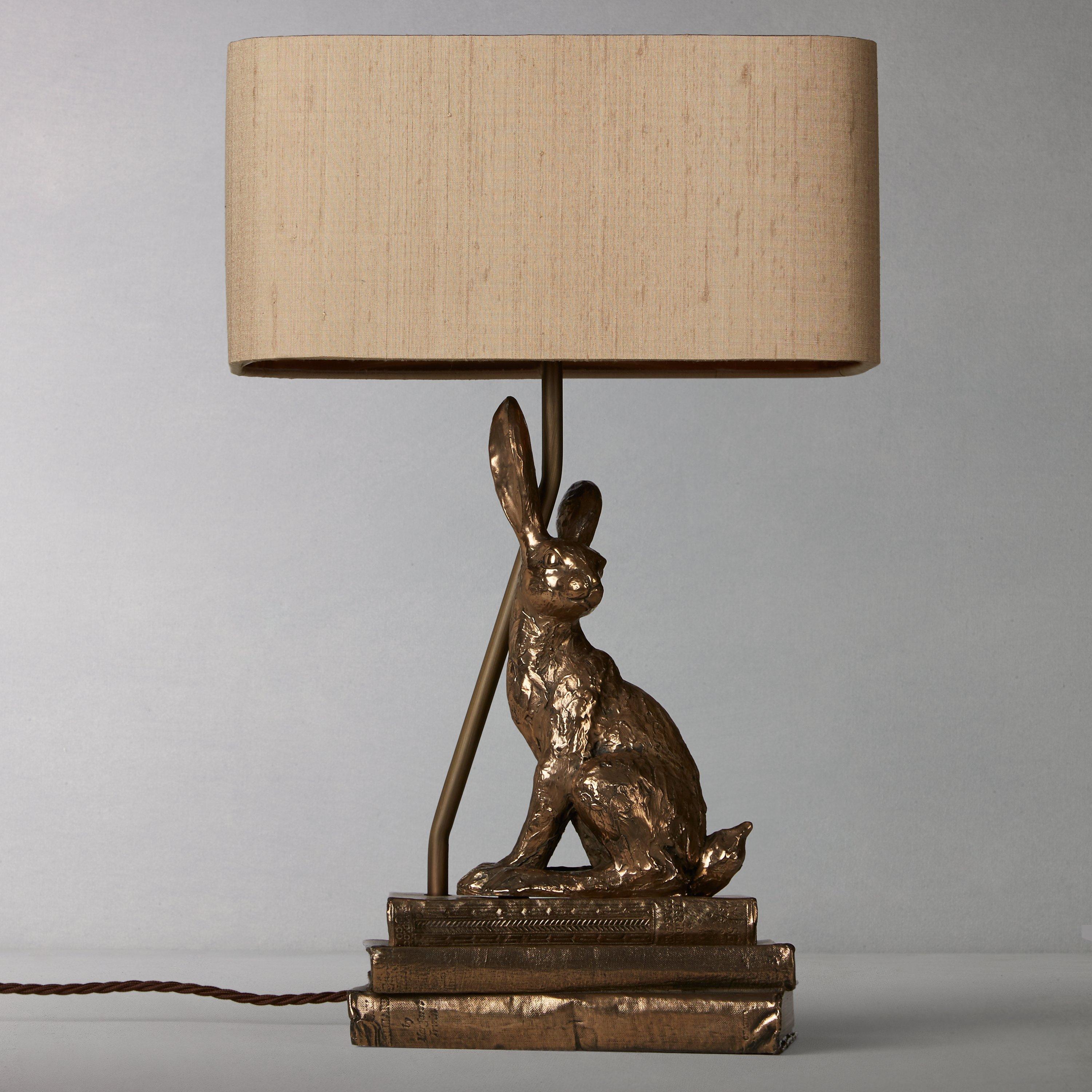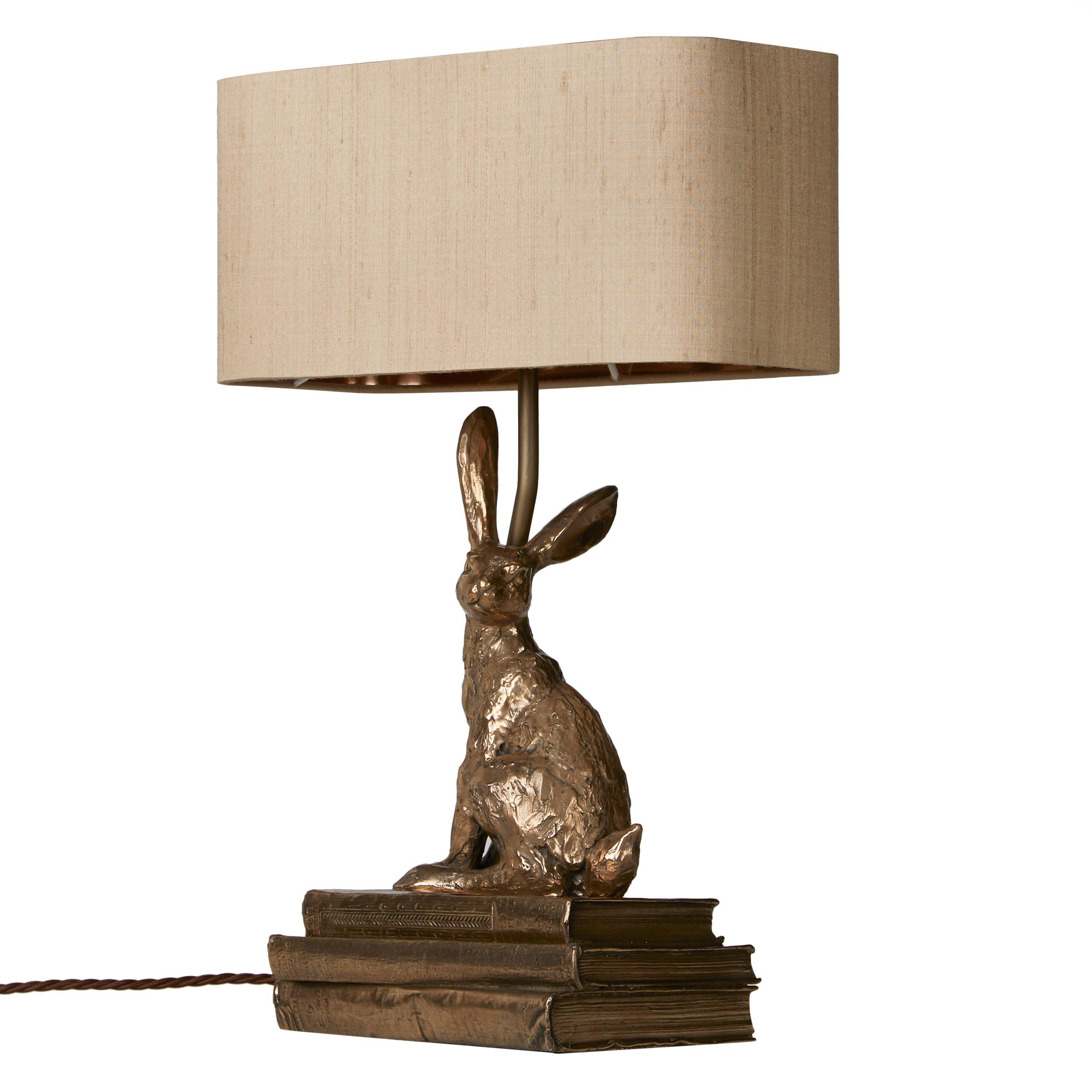 Introducing the David Hunt Hare, which is not only a charming table lamp, but simply a piece of art. The charismatic hare sits effortlessly on a set of three vintage books, beautifully finished with a luxurious Taupe silk shade. Cast in a warm bronze resin finish, the character of this table lamp will light up all design schemes and create a heart warming focal point within any chosen room.