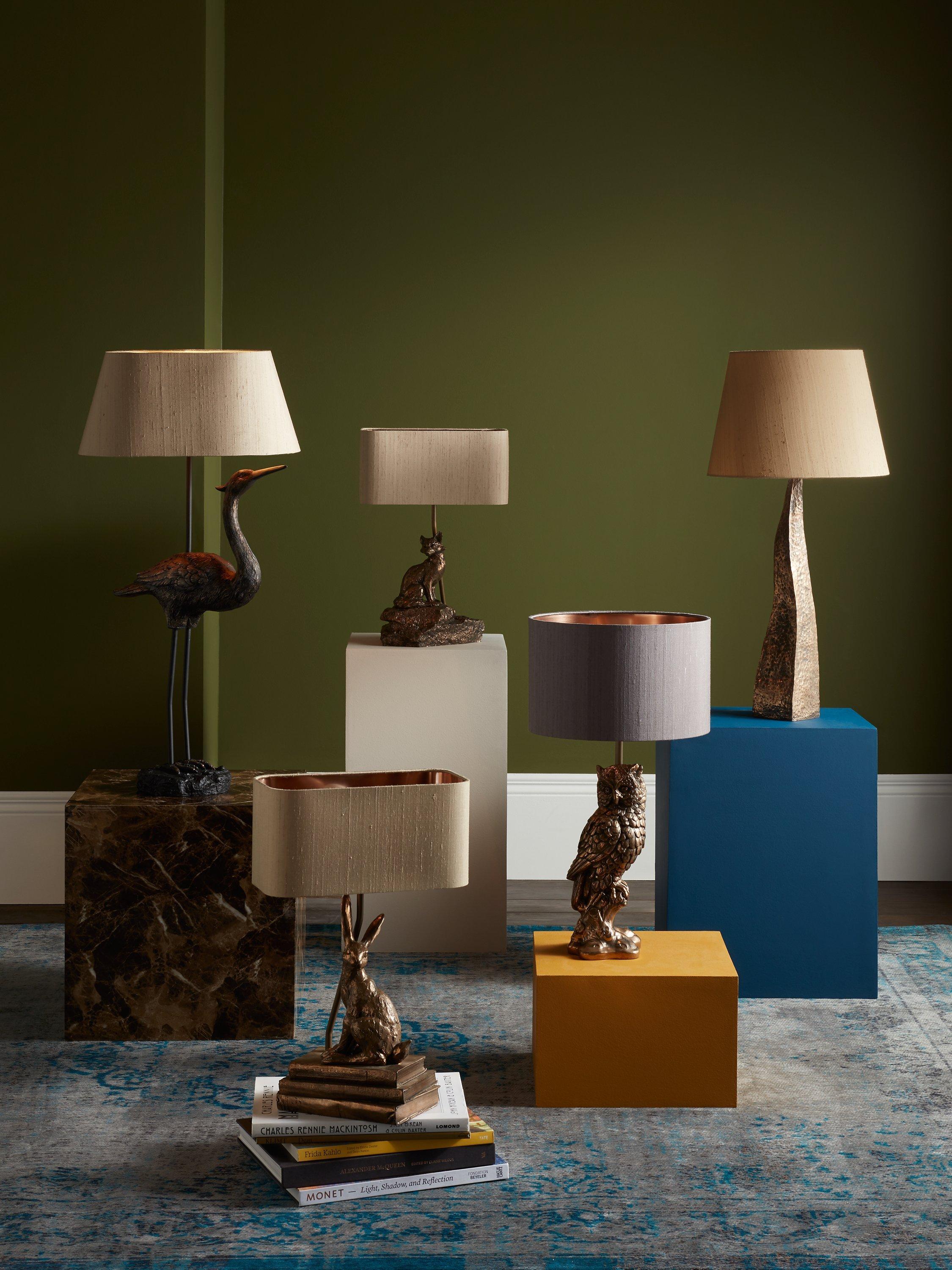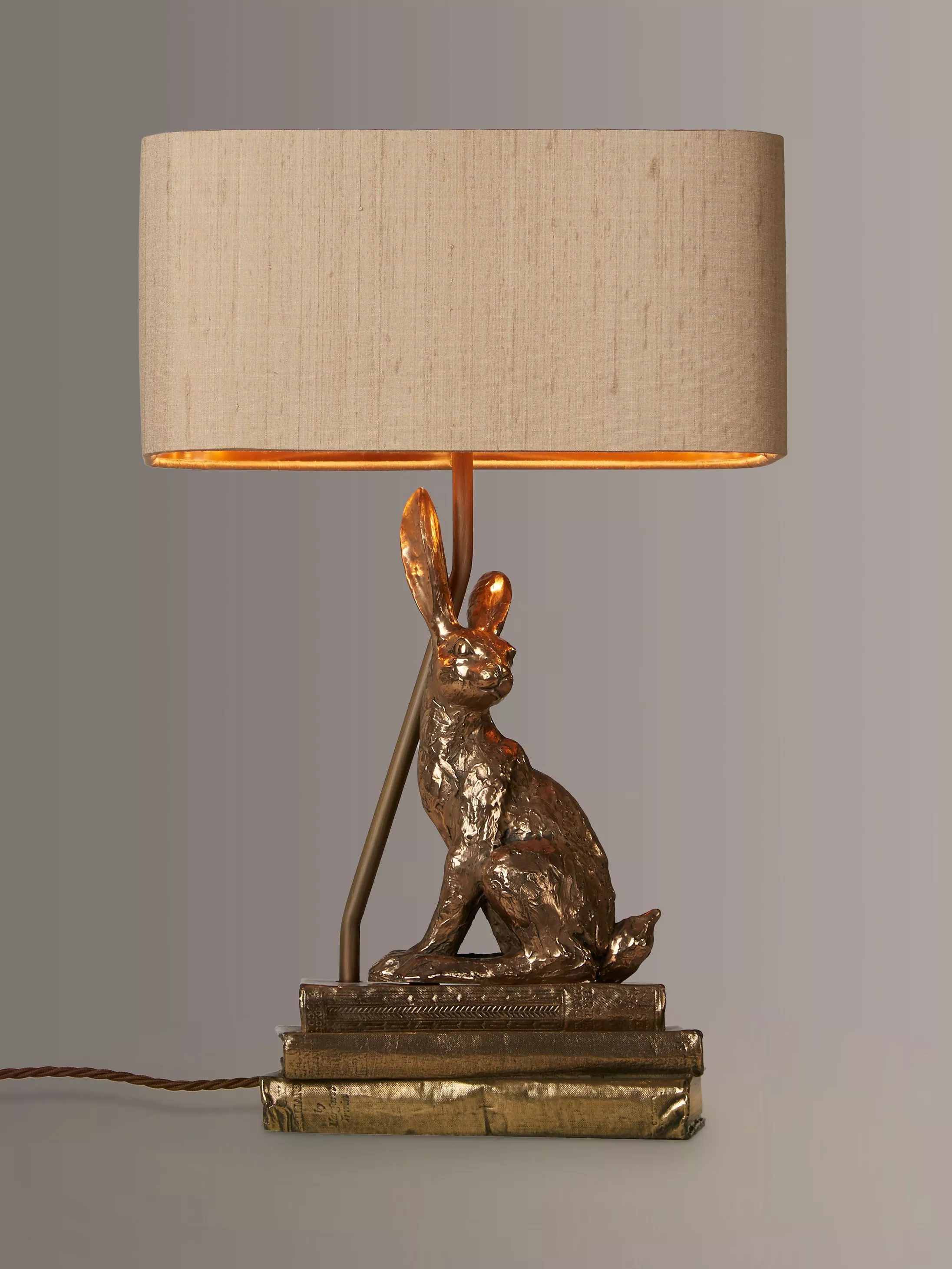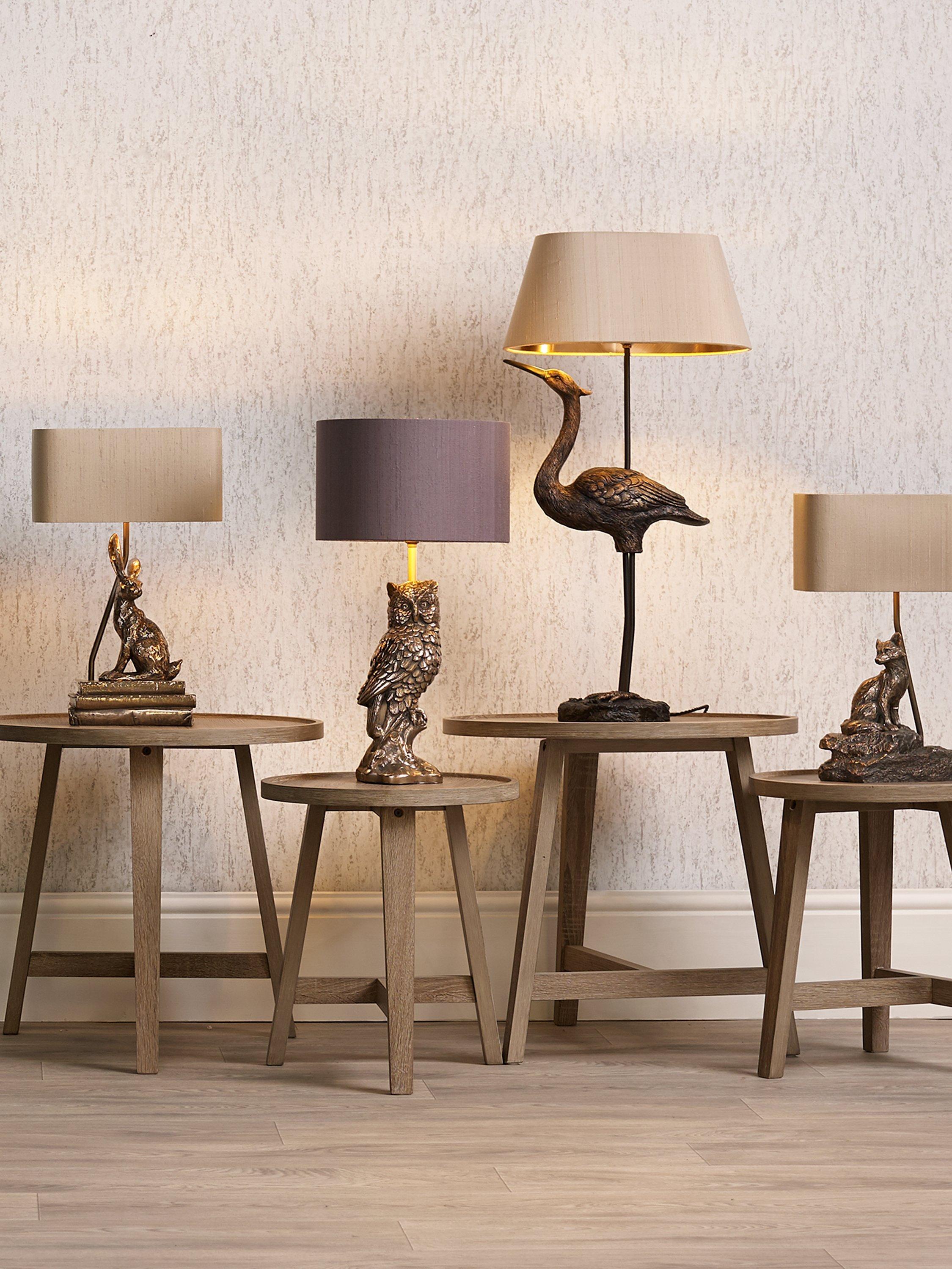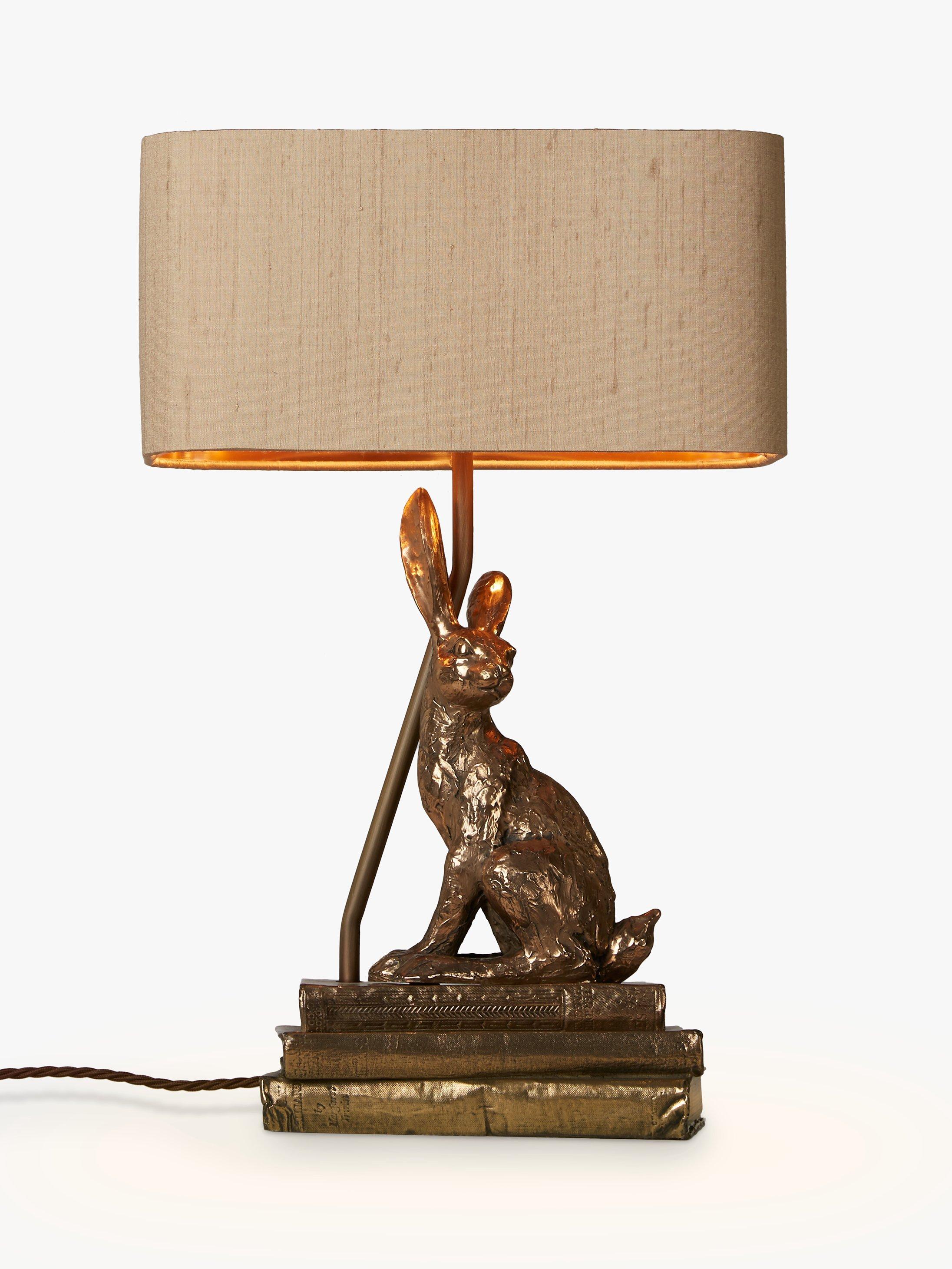 Introducing the David Hunt Hare, which is not only a charming table lamp, but simply a piece of art. The charismatic hare sits effortlessly on a set of three vintage books, beautifully finished with a luxurious Taupe silk shade. Cast in a warm bronze resin finish, the character of this table lamp will light up all design schemes and create a heart warming focal point within any chosen room.