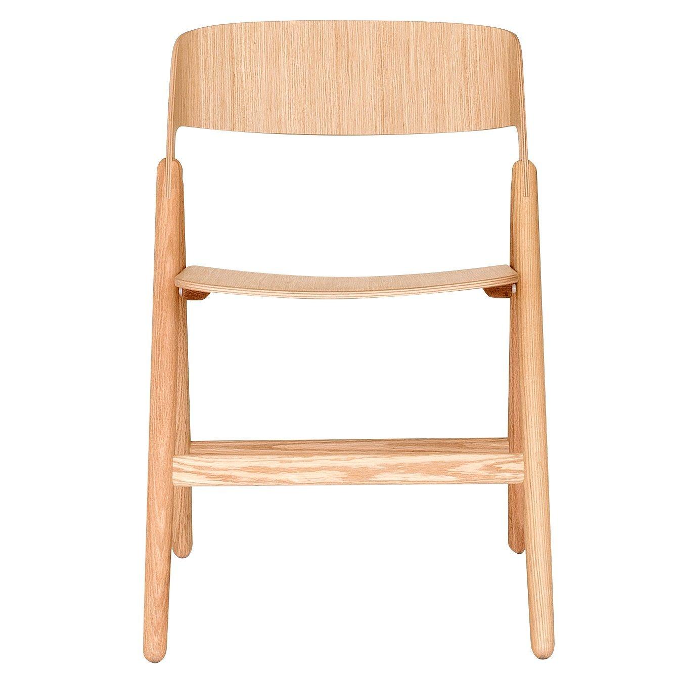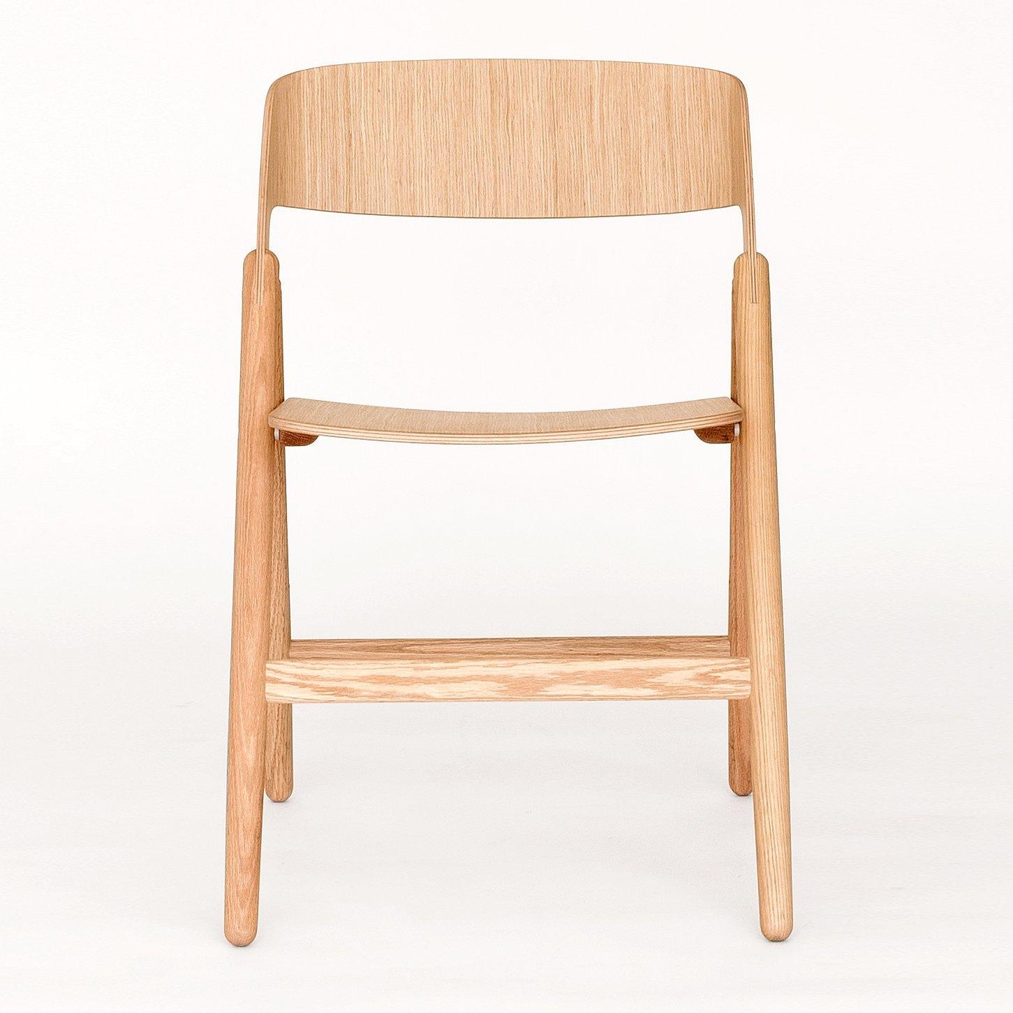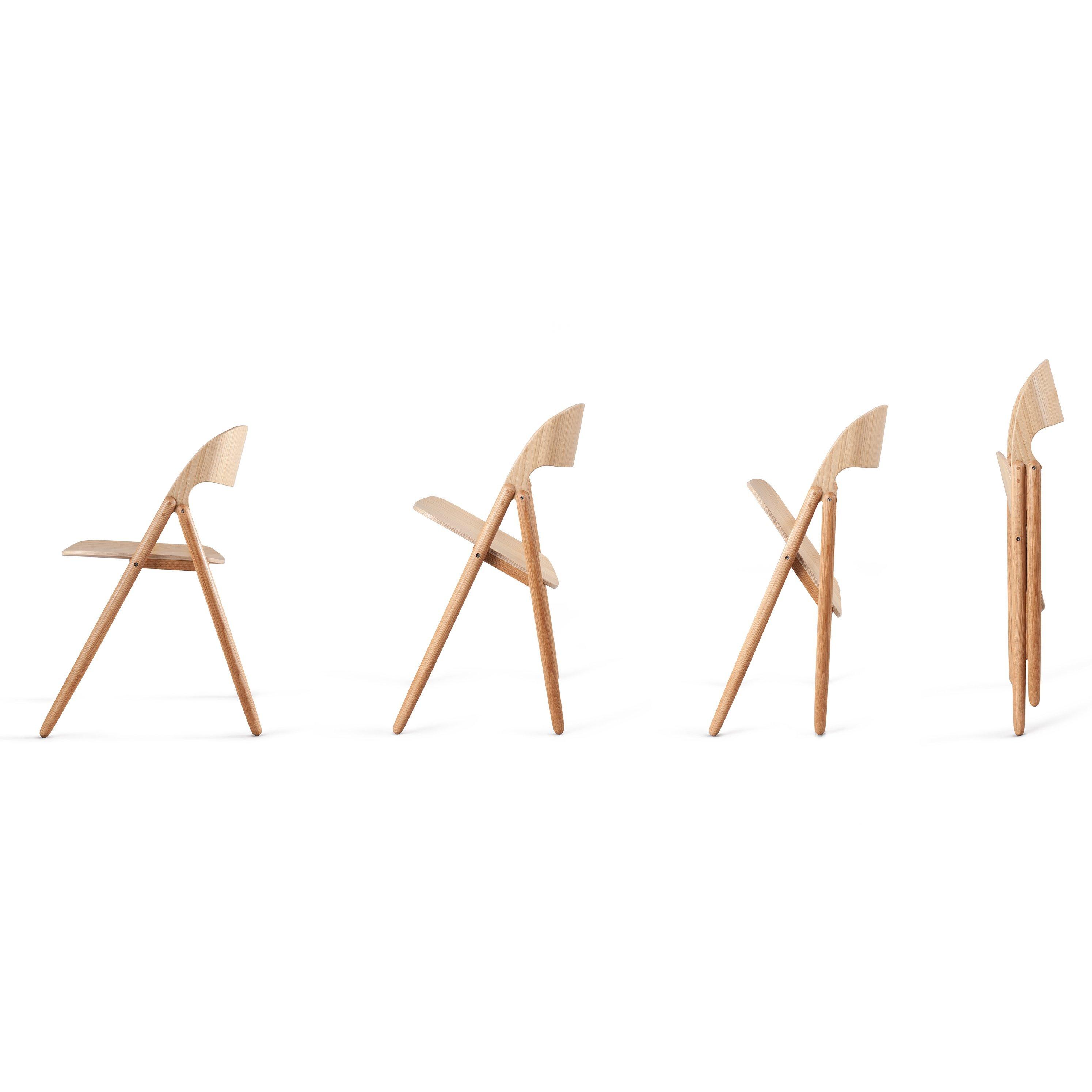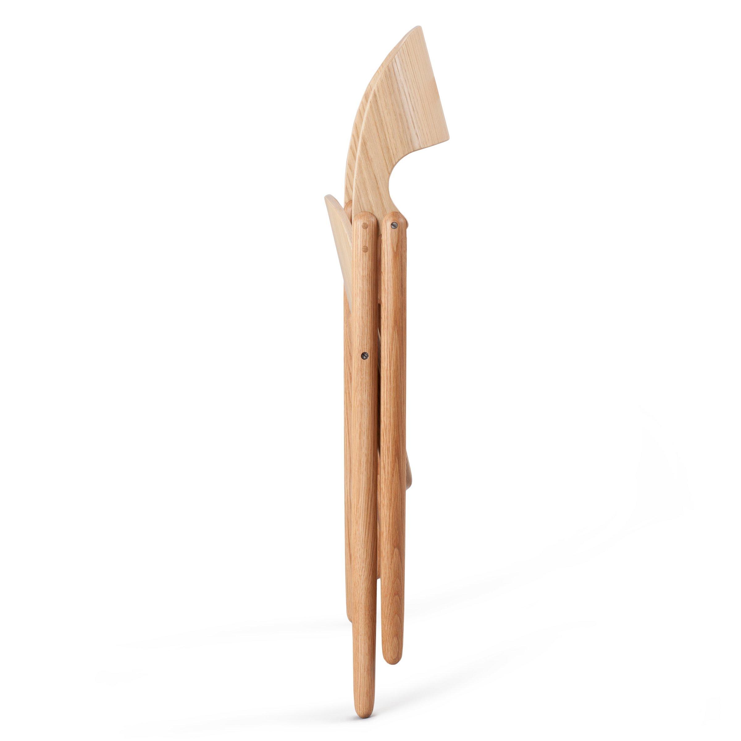 The elegant design features a smooth sweeping transition from the turned oak legs into the formed backrest, which also doubles as the mount for the pivot from where the back leg rotates. The seat and back are formed from layered birch ply and oak veneer, with an oiled finish and stainless steel fixings. The fixings contained on the underside of the chair slide along the grooves within the back legs to present a graceful silhouette with clean flowing lines, so the chair looks as good folded away for storage as it does when open and in use.