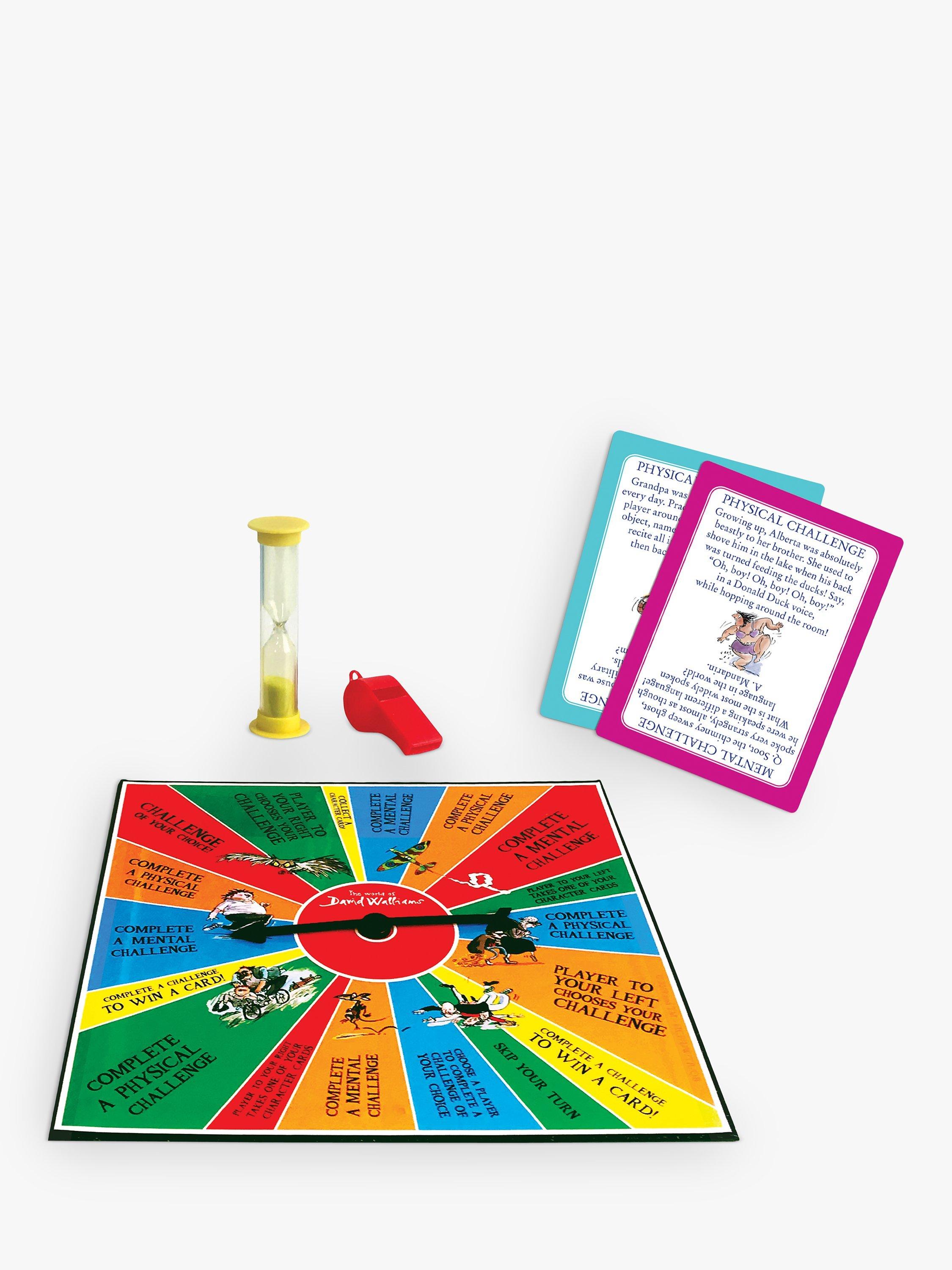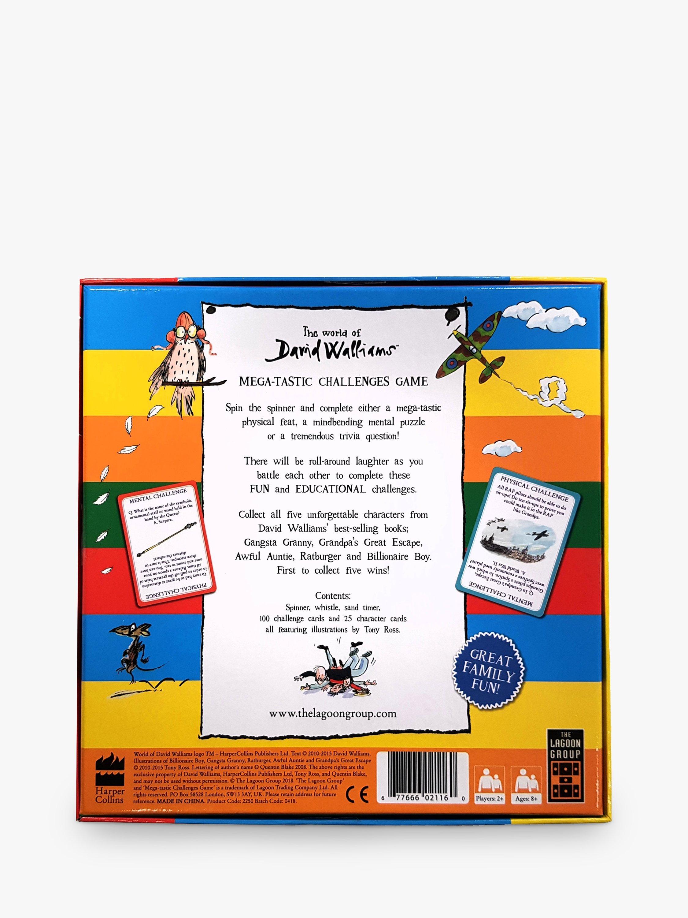 This fast-paced family game sets fun, entertaining and educational challenges. Players need to race round the board collecting five unforgettable characters from Gangsta Granny, Awful Auntie, Ratburger, Billionaire Boy and Grandpa's Great Escape. Spin the spinner and complete a mega-tastic physical feat, a mindbending puzzle or a fun trivia question against the timer. Fantastically good fun!