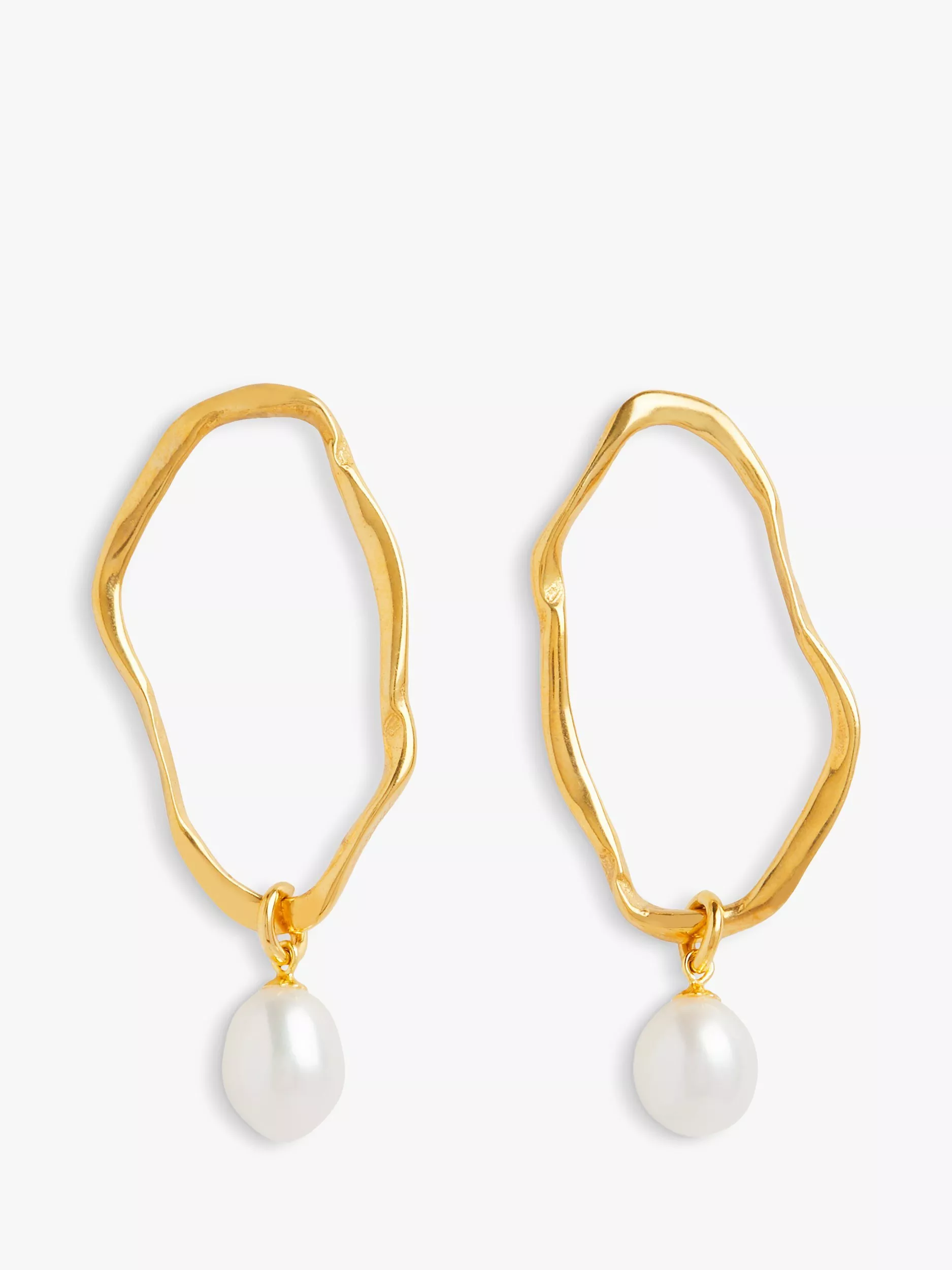 Made from gold-plated Sterling silver, each drop curves and flows like ripples on water. A lustrous white baroque pearl hangs from the bottom of each earring.