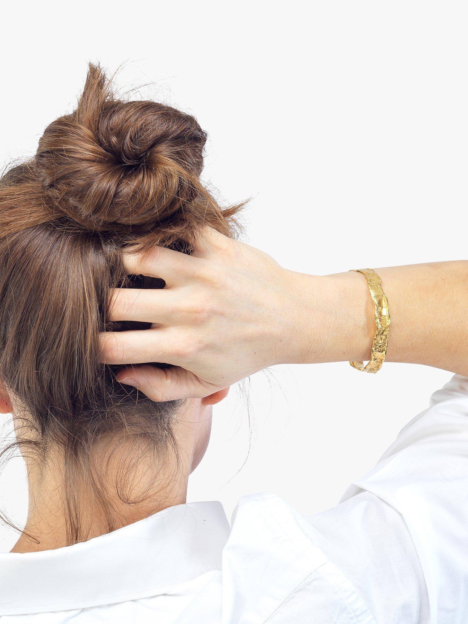 The Oceanus Bangle has a polished, textured surface with edges that curl, reminiscent of waves lapping on the shore. The polished interior ensures a smooth and comfortable fit.