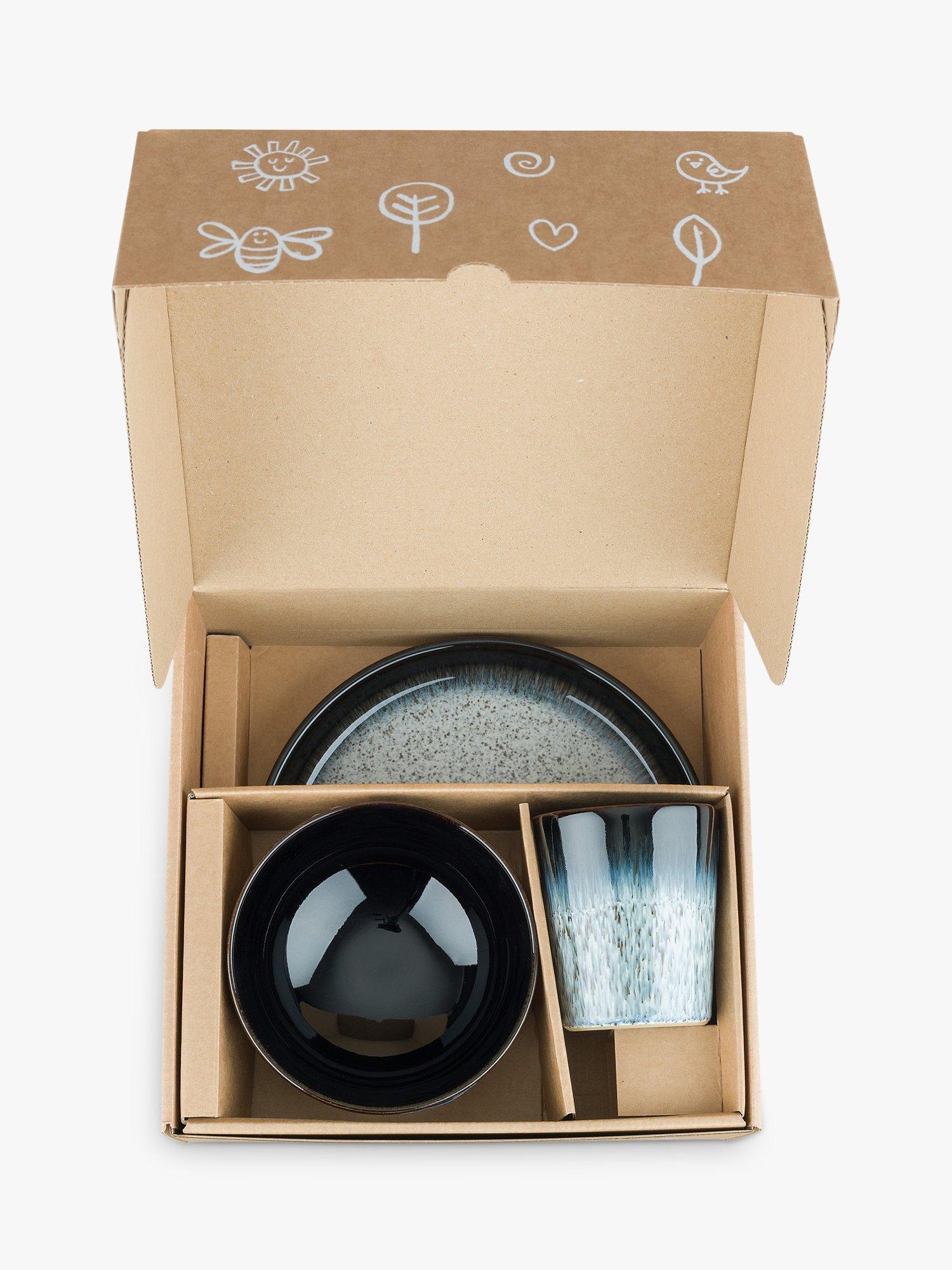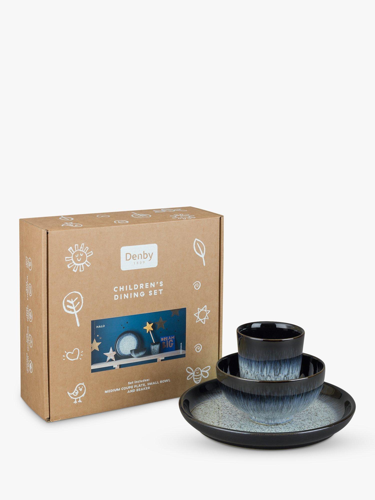 This children's Halo dining set includes one medium coupe plate, one small bowl and one beaker. The beaker can be used for milk, juice or to hold crayons. The small bowl is ideal for breakfast, as a snack pot or for small portions for adults. The small plate suits sandwiches, cake or even for mixing your paints. The set is presented in premium gift packaging.