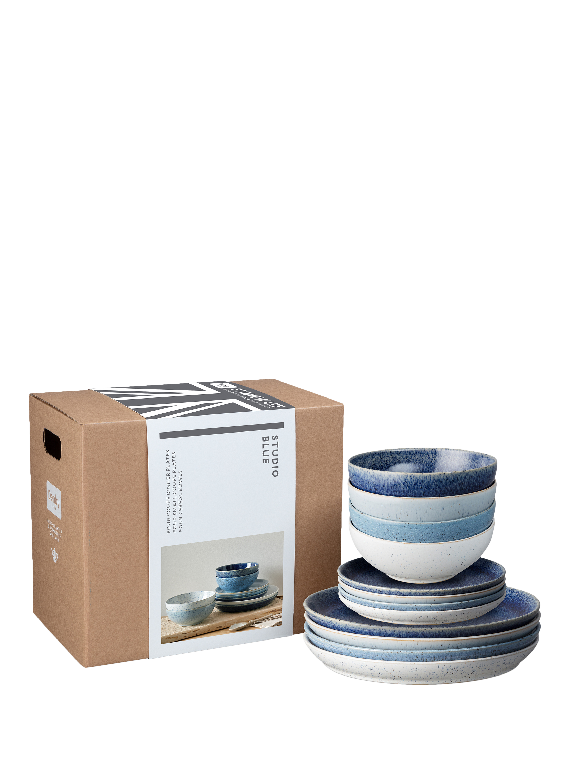 This 12-piece dinnerware set includes four dinner plates, four small plates and four cereal bowls in all four Studio Blue glazes: Chalk, Cobalt, Pebble and Flint, from the Studio Blue collection, offering a mix and match look.