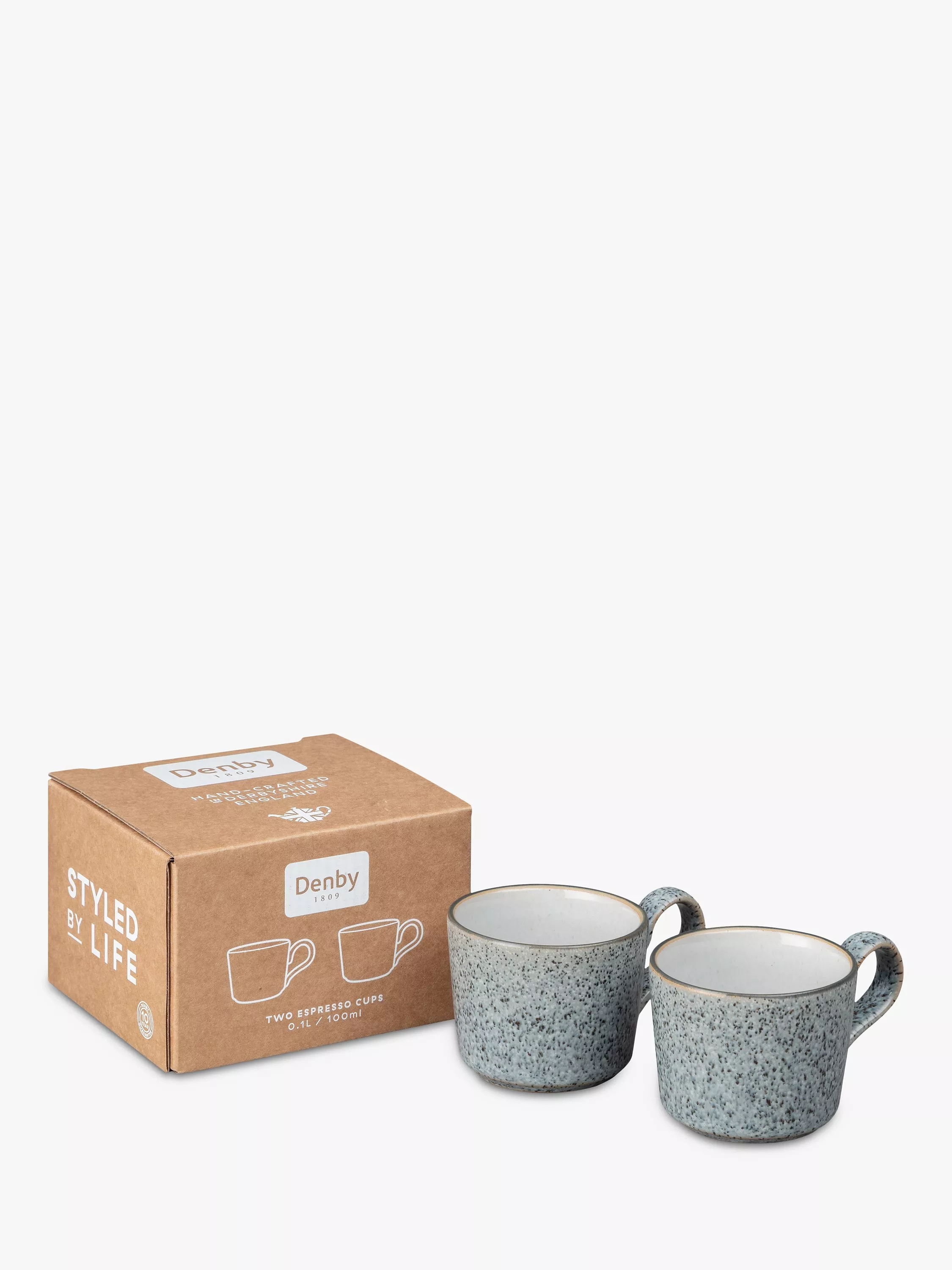A pair of gift-boxed espresso coffee cups from Denby's Studio Grey range of tableware.