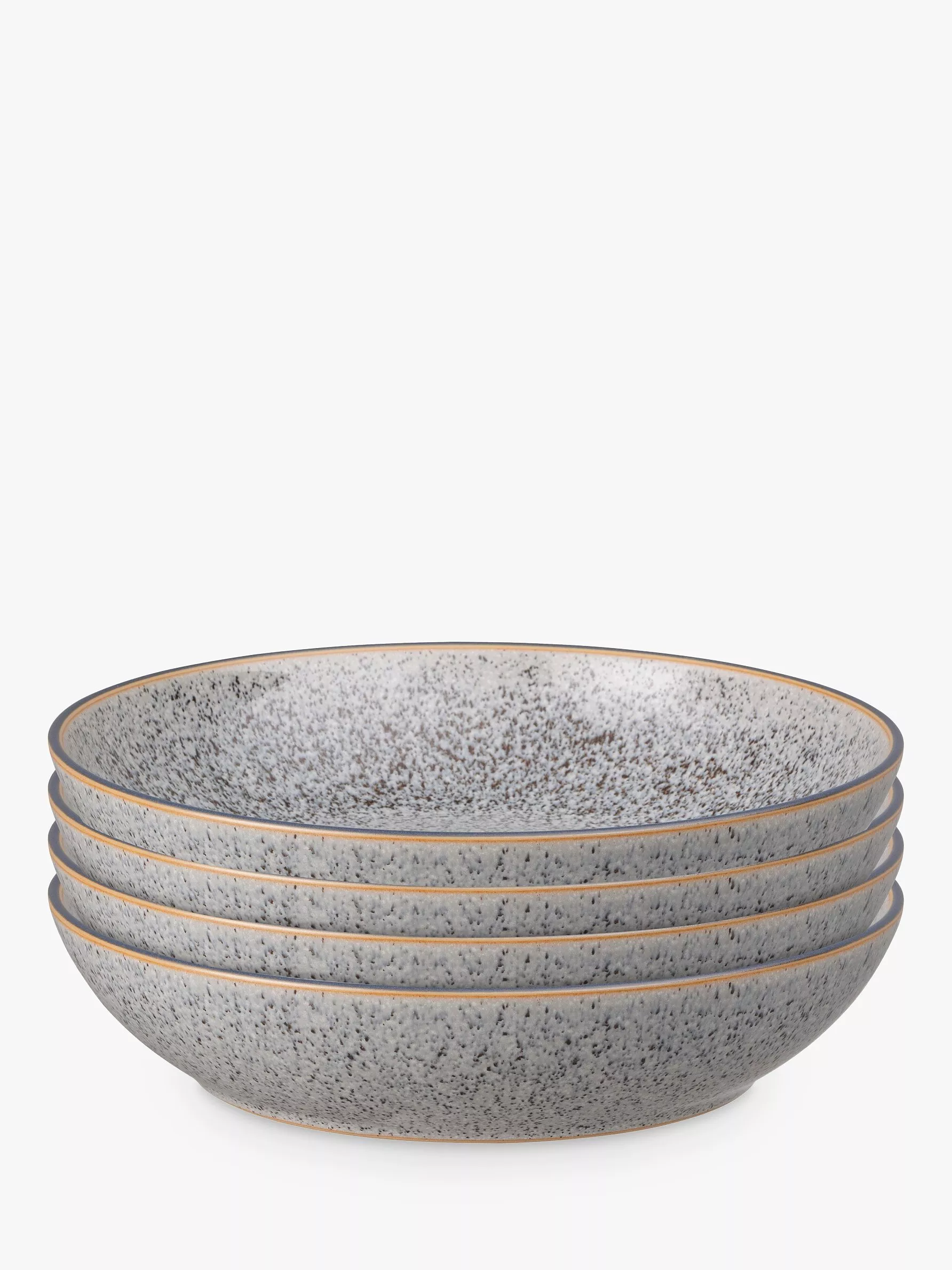 A set of four pasta bowls from Denby's Studio Grey range of tableware, known for its subtly chic flecked design, beautifully contrasted with a darker rim.