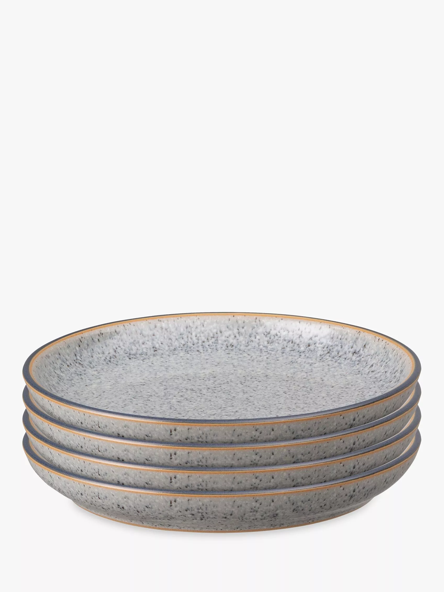 A set of four coupe plates from Denby's Studio Grey range of tableware, known for its subtly chic flecked design, beautifully contrasted with a darker rim.