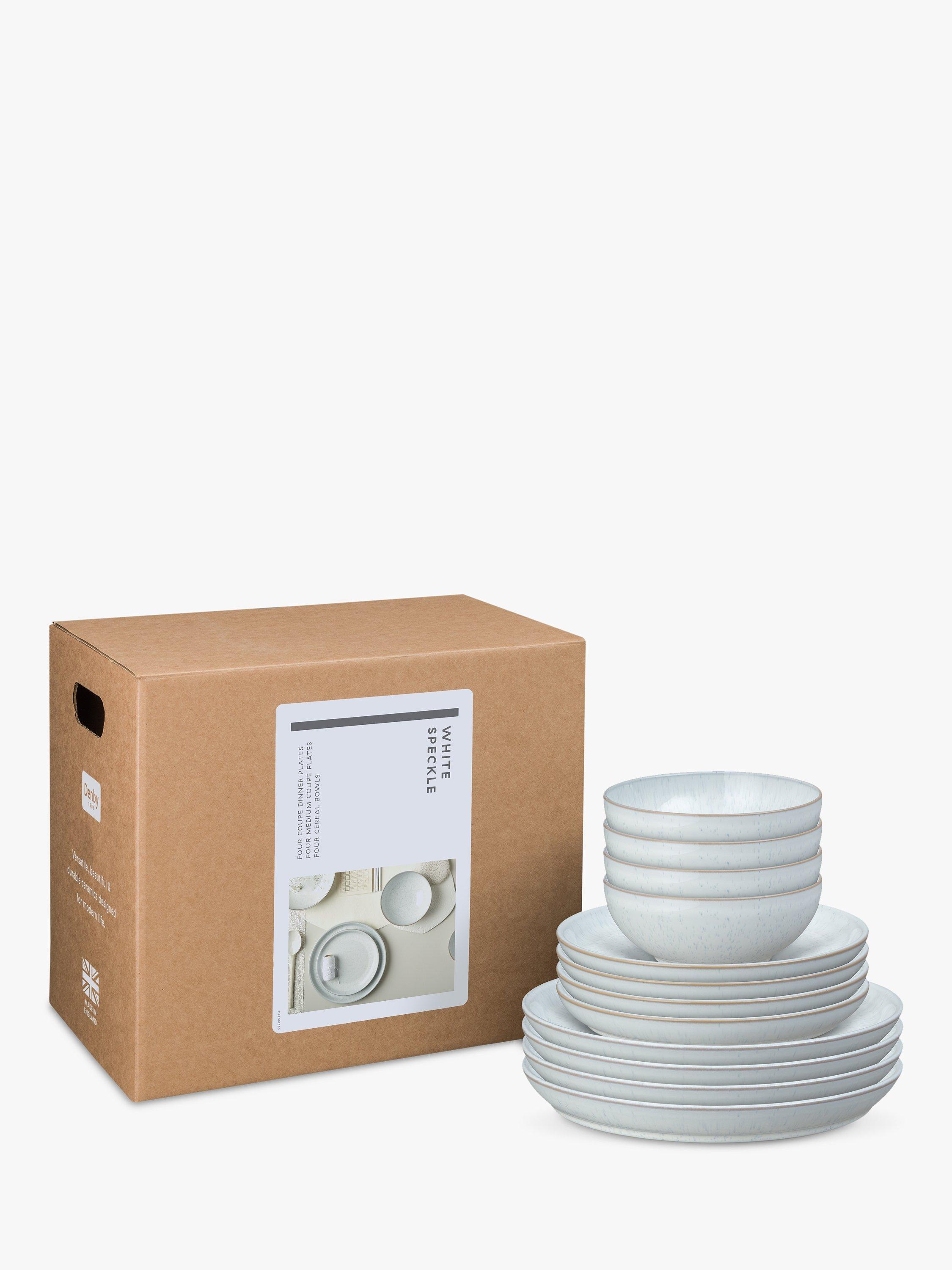 This 12-piece Denby White Speckle dinnerware set is dishwasher, microwave and freezer safe, as well as oven safe to 250°C. Included are four coupe dinner plates, four medium-sized coupe plates and four cereal bowls.