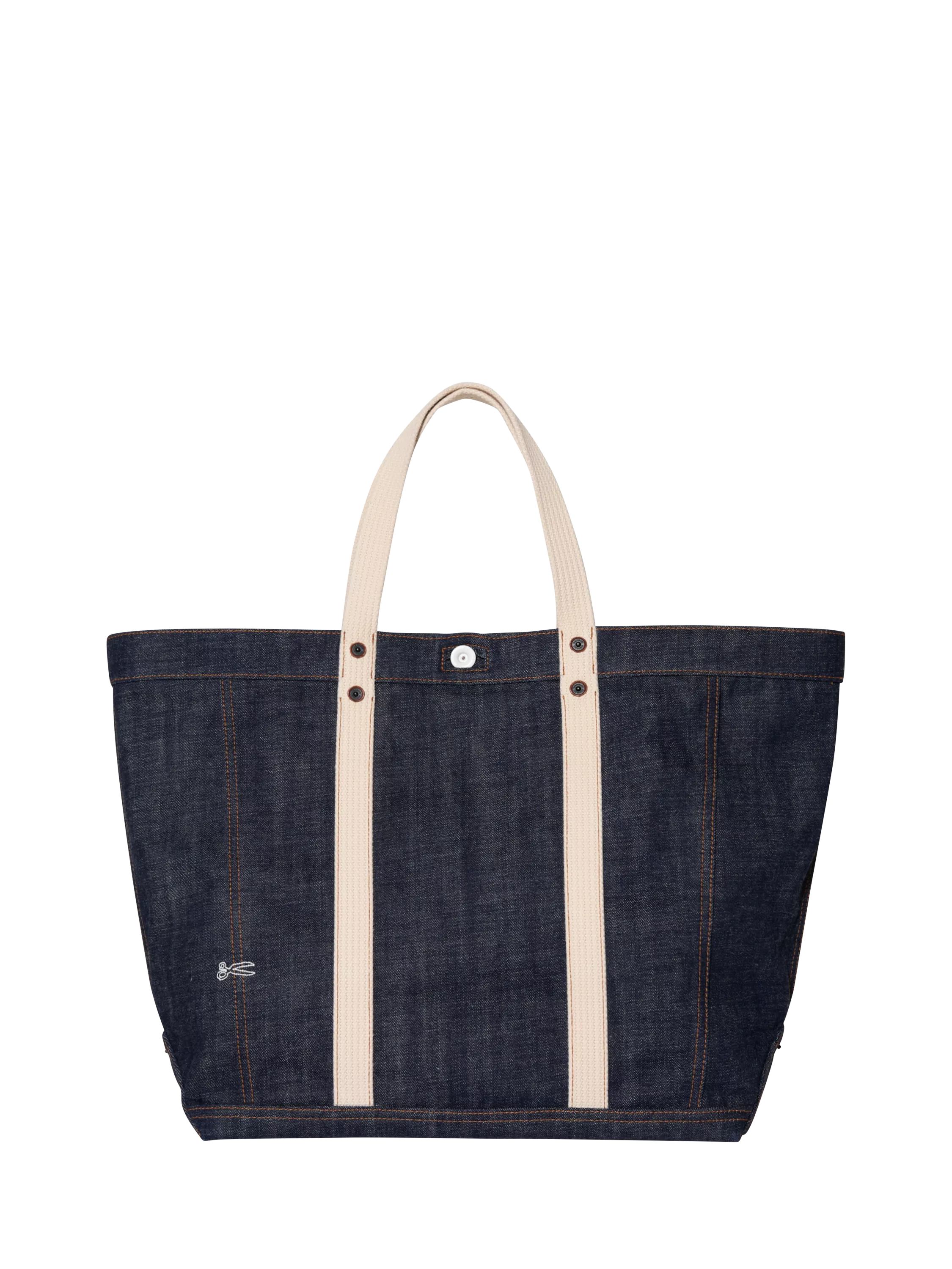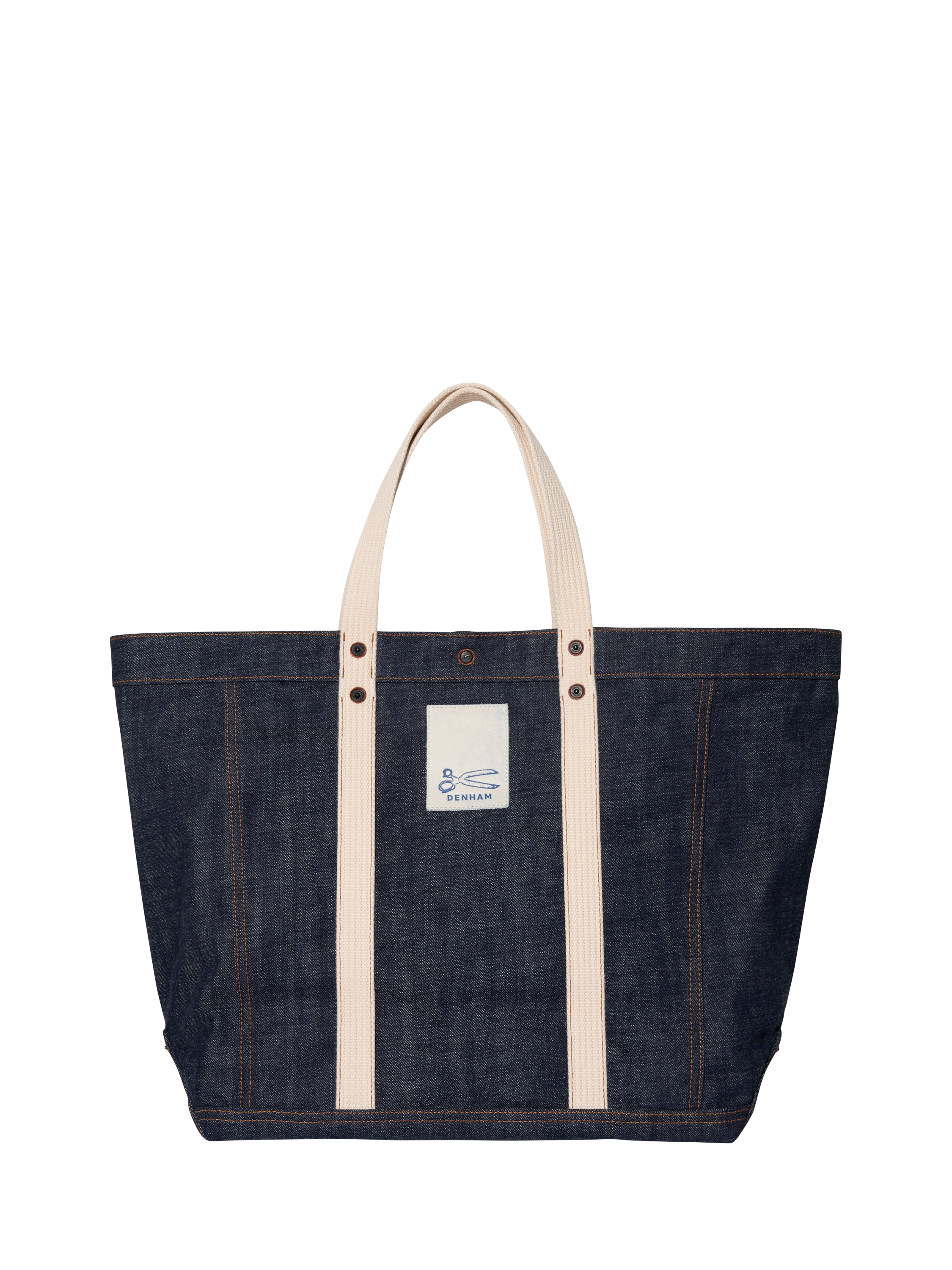 A sturdy tote bag with a clean, structured silhouette that’s ideal for everyday carry. It’s crafted from premium virgin indigo denim and features heavy cotton handles, tobacco stitching, a white button closure, and leather-backed rivets. It’s finished with an embroidered scissor logo, and DENHAM patch.