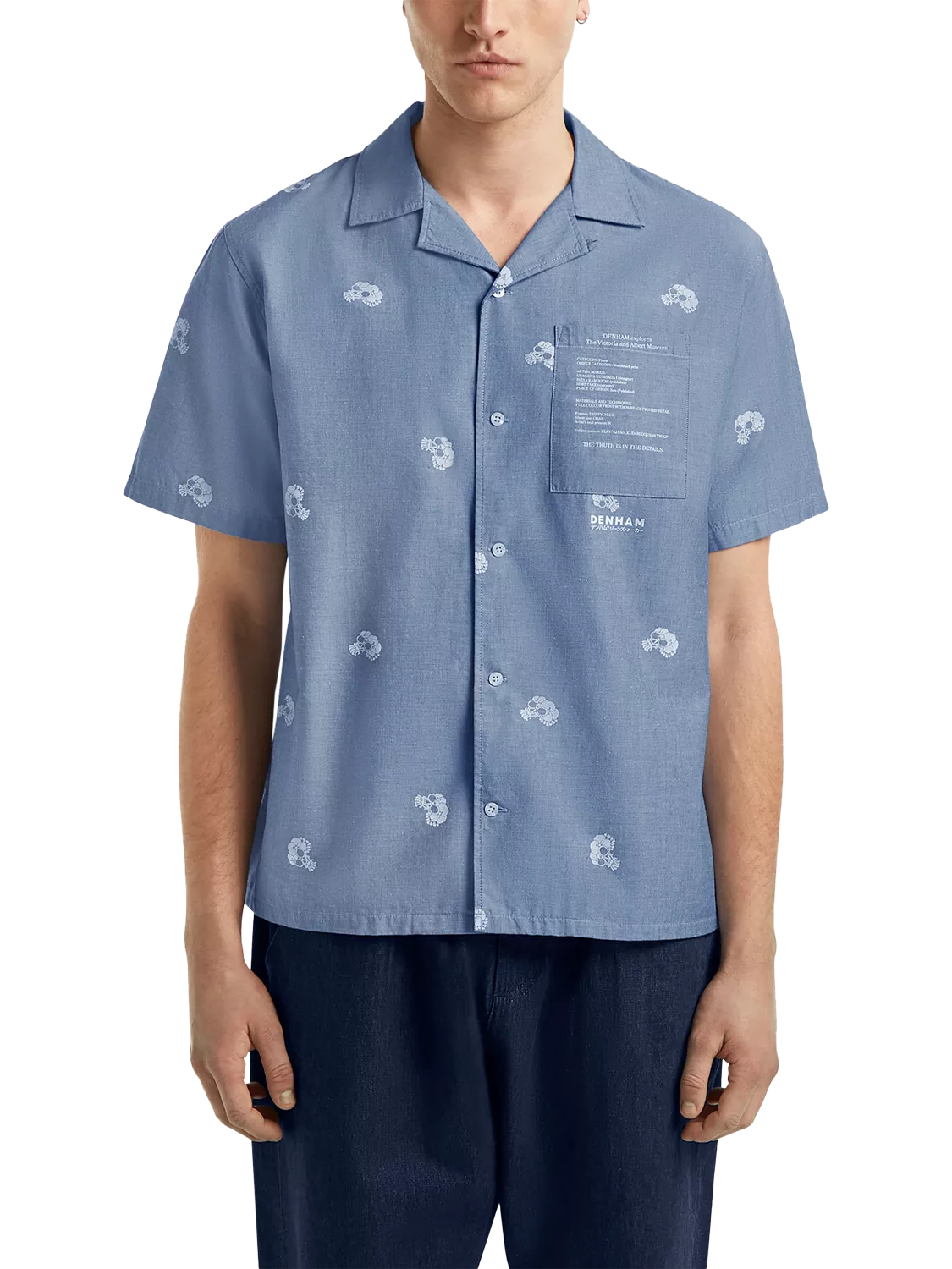 The DVA Noggin shirt is designed in collaboration with the Victoria and Albert Museum. This lightweight cotton chambray shirt features an all-over Ukiyo-e skull print, a camp collar, button-front closure, and a printed patch with historical details.