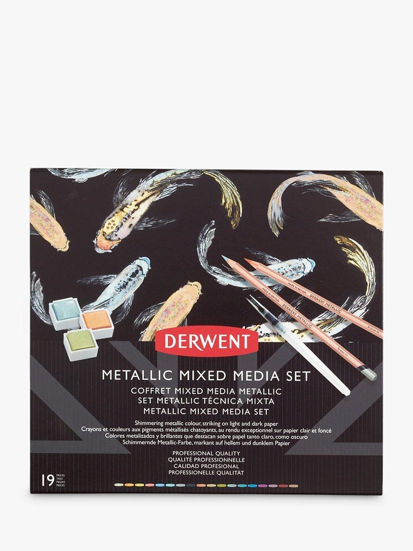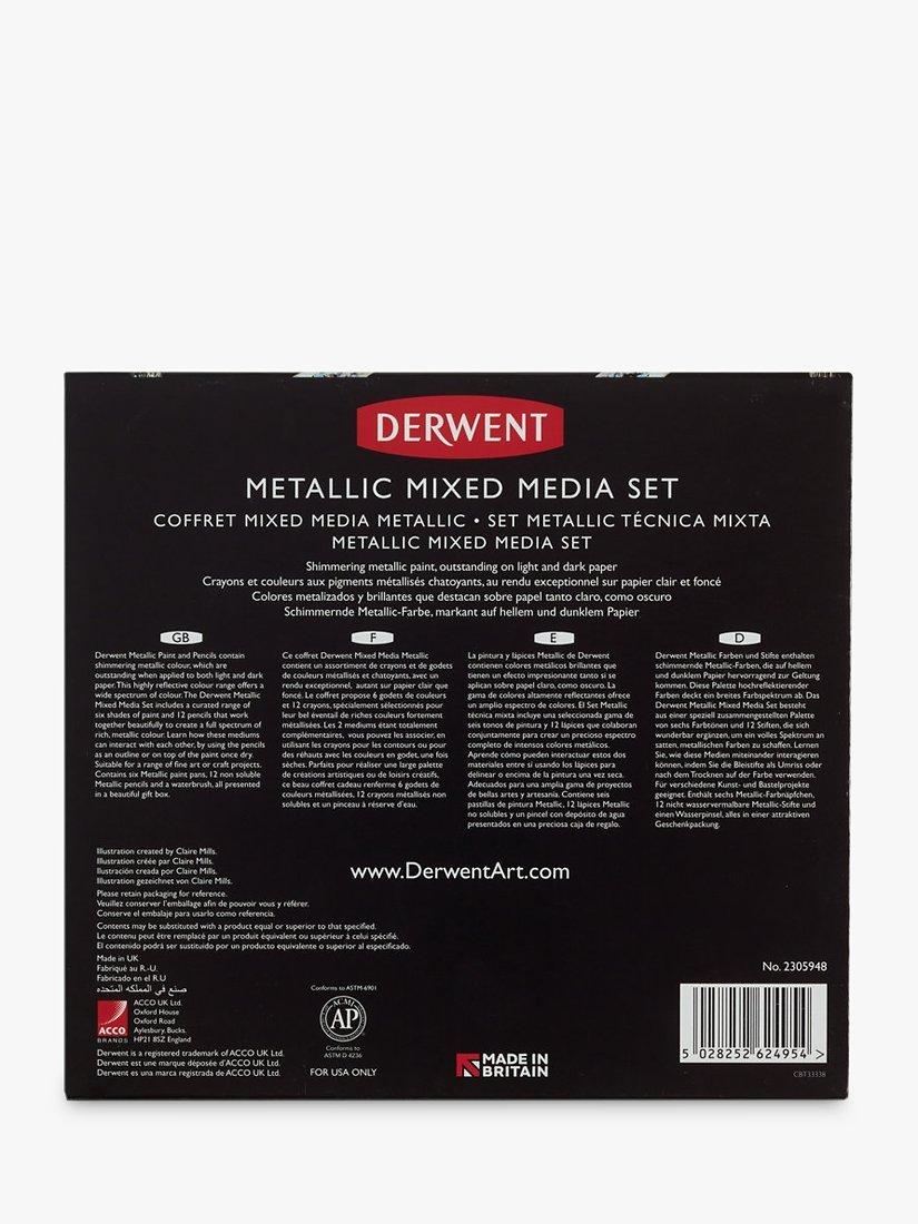 Derwent Metallic Paint and Pencils contain shimmering metallic colour, which are outstanding when applied to both light and dark paper. This highly reflective colour range offers a wide spectrum of colour. The Derwent Metallic Mixed Media Set includes a curated range of six shades of paint and 12 pencils that work together beautifully to create a full spectrum of rich, metallic colour. Learn how these mediums can interact with each other, by using the pencils as an outline or on top of the paint once dry. Suitable for a range of fine art or craft projects.