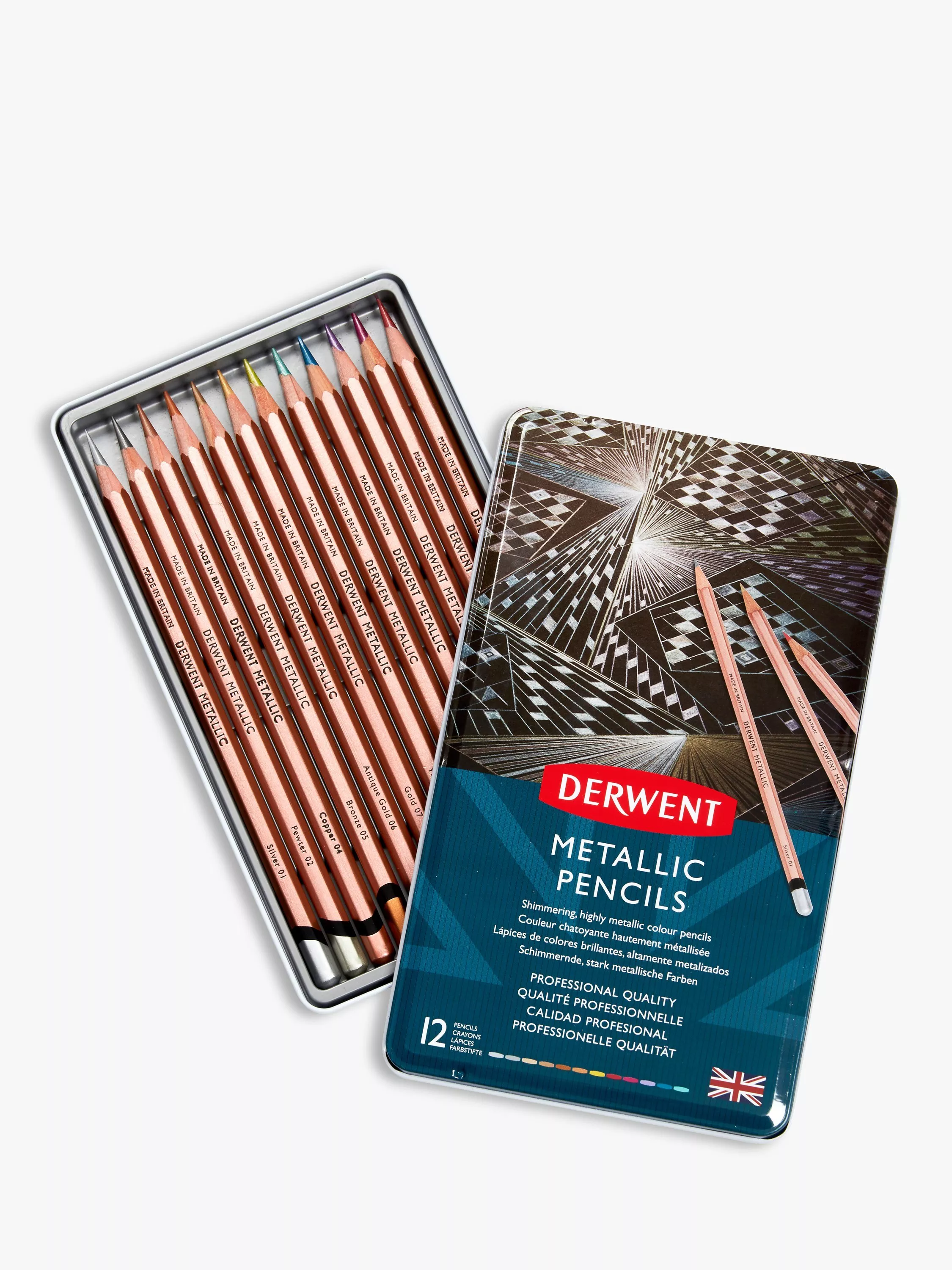 A pack of 12 shimmering, highly metallic pencils that blend beautifully together to create vivid and striking metallic effects, particularly on dark paper.