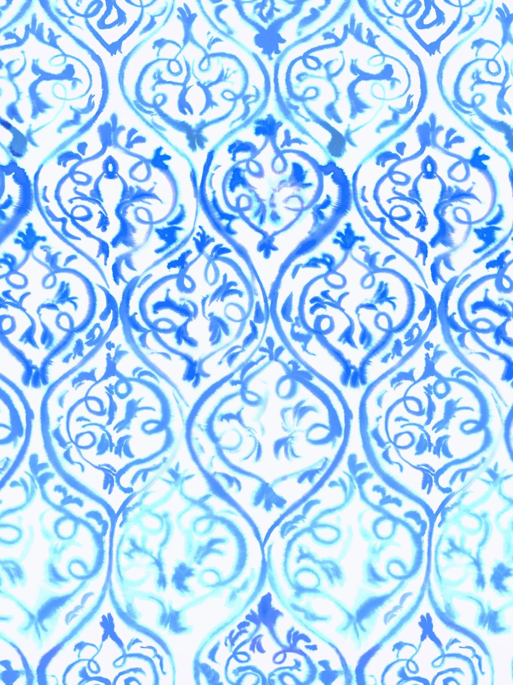 Dramatic inky scrolls in dramatic scale set in an arabesque pattern. Watercolour toned, shaded colour in contrast to the white ground.