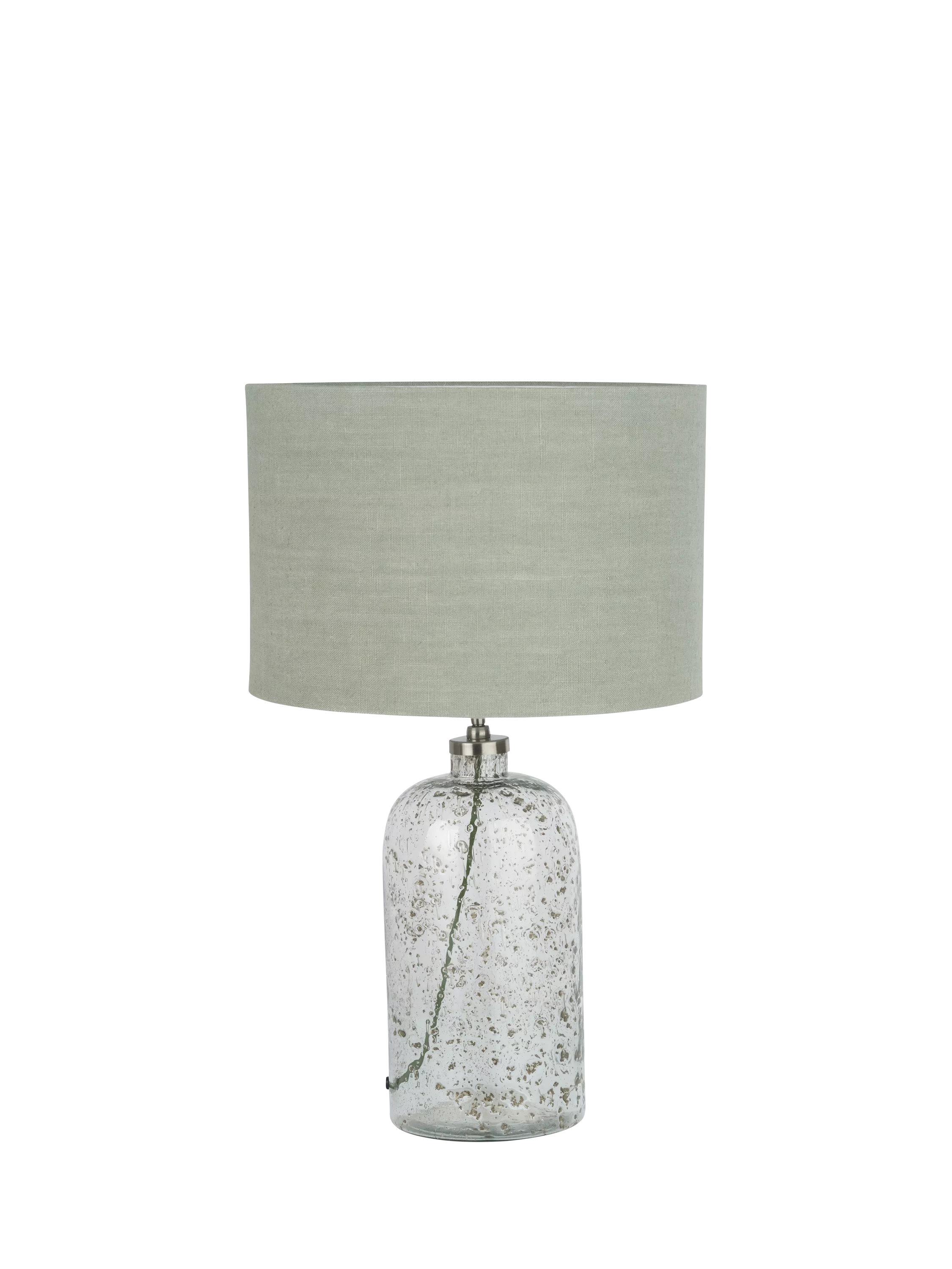 Made in collaboration with Designers Guild, this striking bubble glass table lamp has been handmade by skilled artisans in India. The bubbles are inherent in the glass and have been coloured to imitate a mercury-style finish. This stunningly simple bottle-shaped lamp base is paired with a fabric flex and an open weave jute linen, cylinder shade.