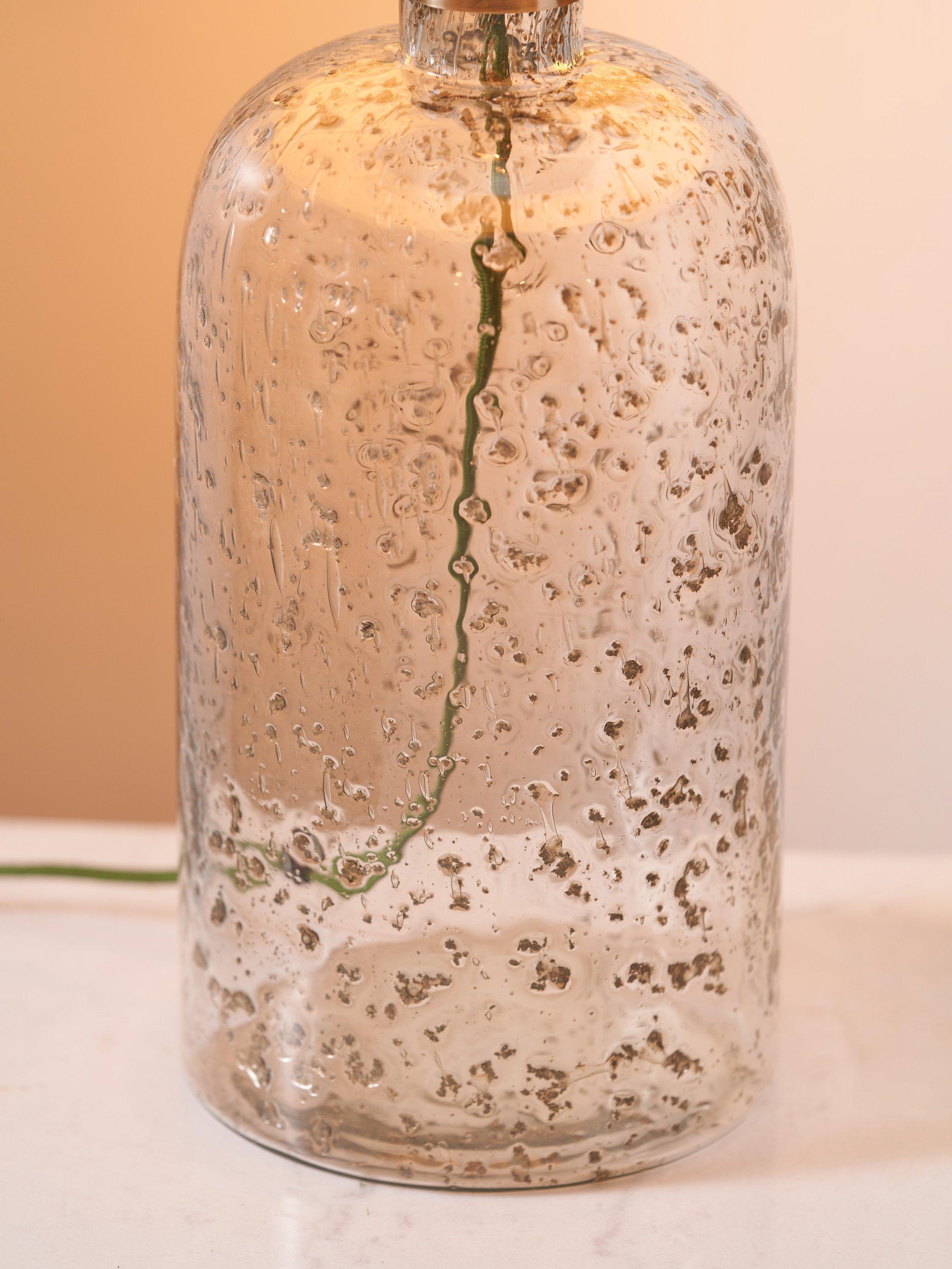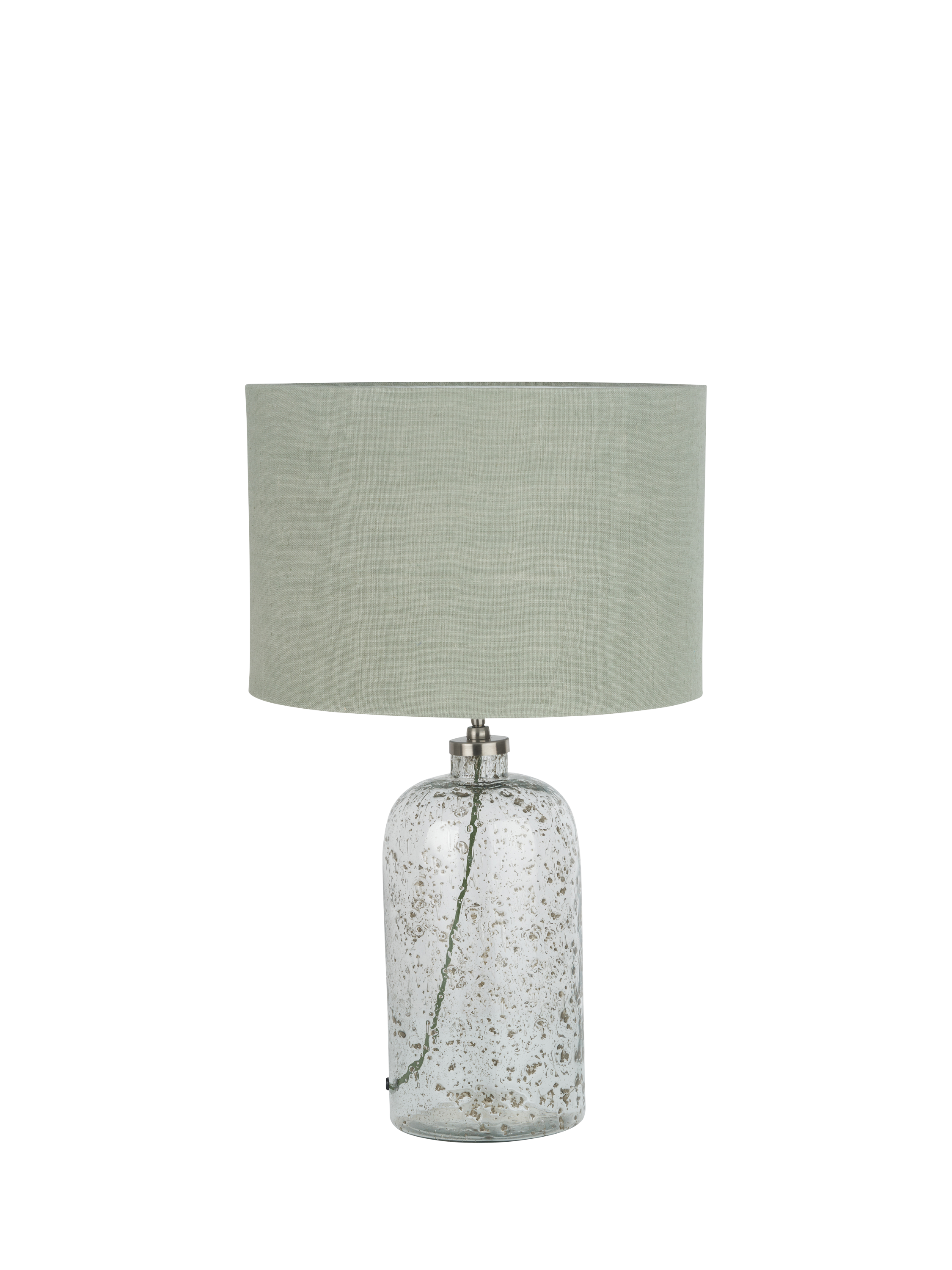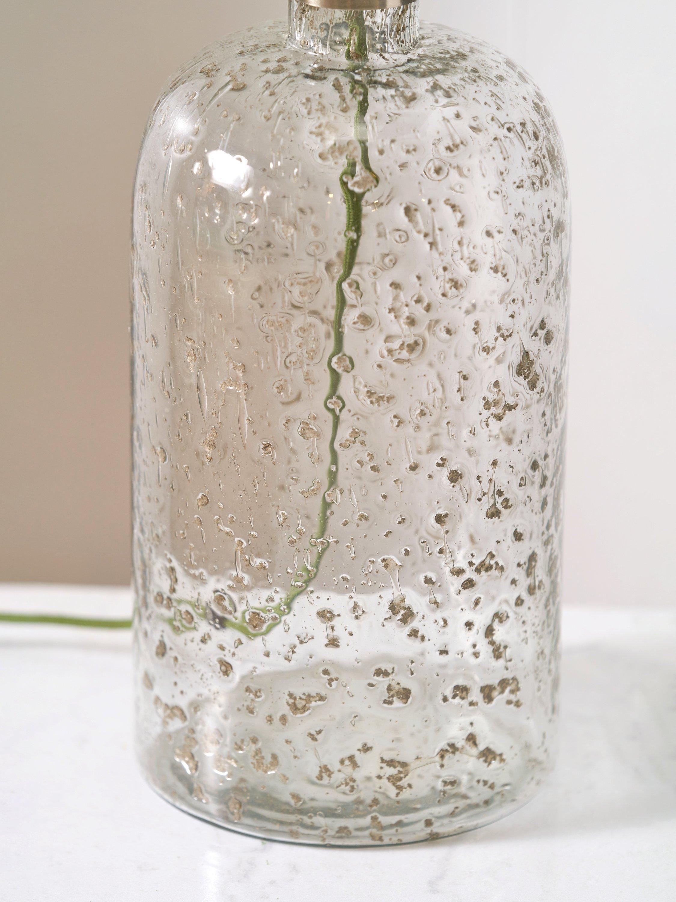Made in collaboration with Designers Guild, this striking bubble glass table lamp has been handmade by skilled artisans in India. The bubbles are inherent in the glass and have been coloured to imitate a mercury-style finish. This stunningly simple bottle-shaped lamp base is paired with a fabric flex and an open weave jute linen, cylinder shade.