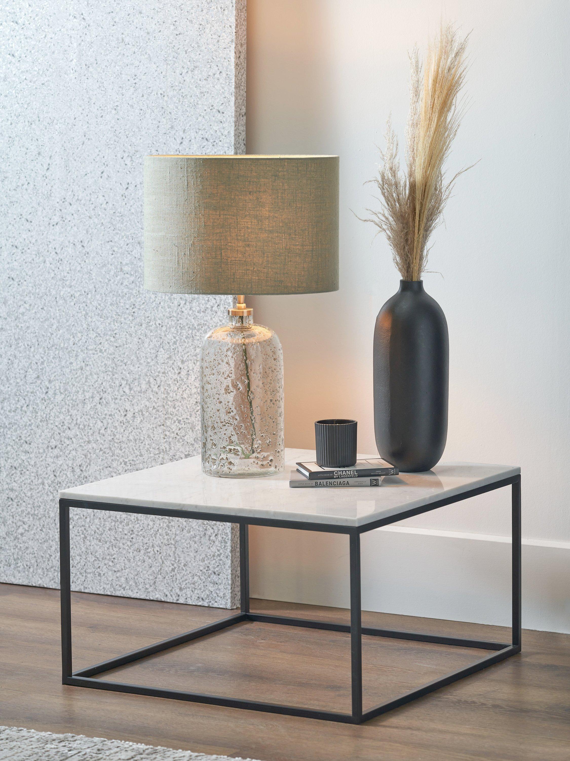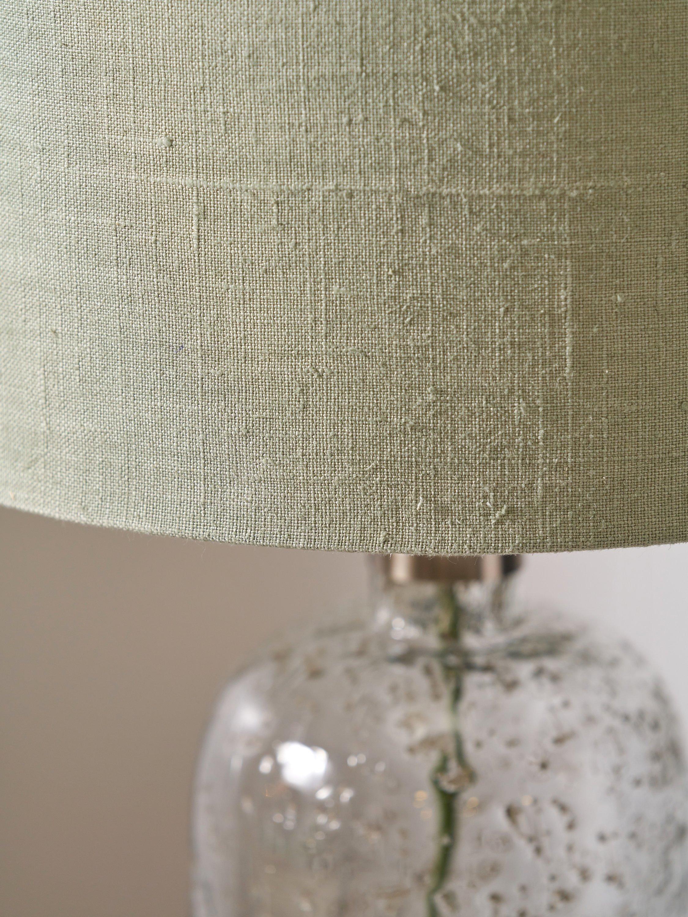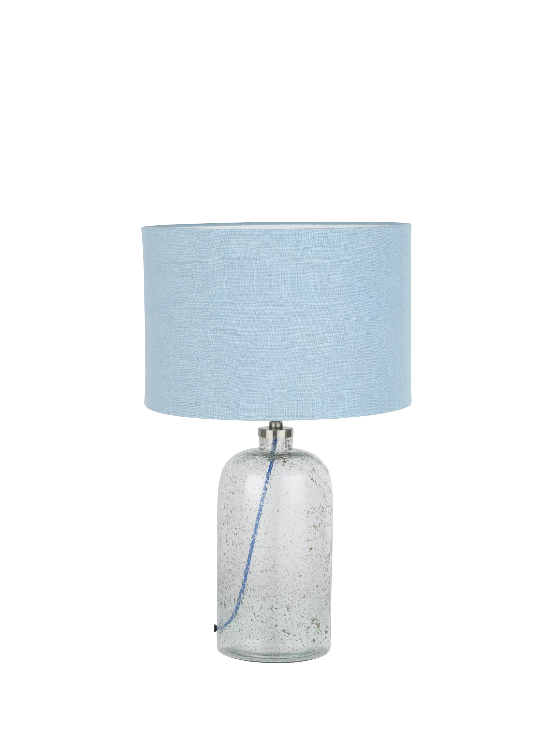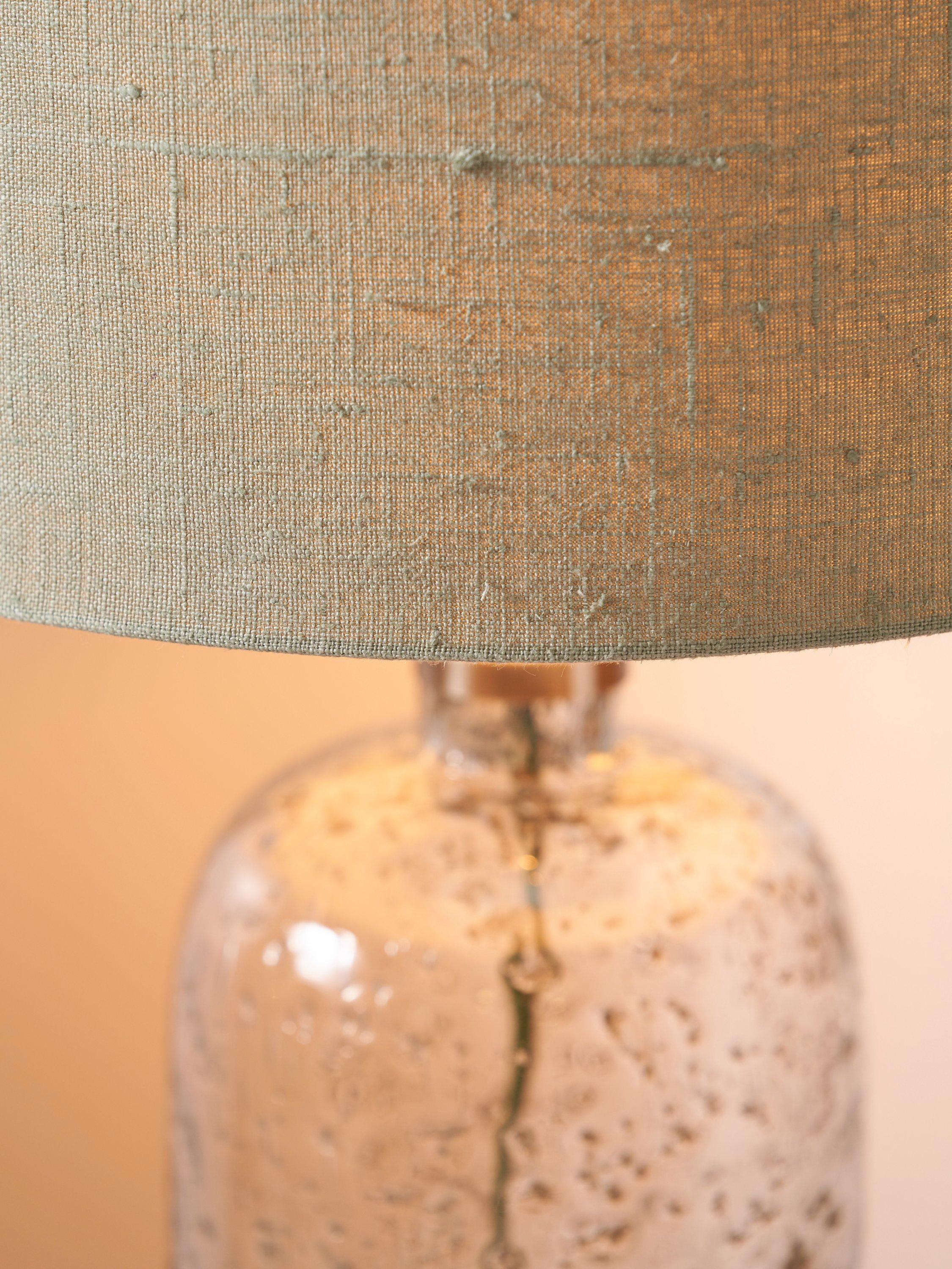 Made in collaboration with Designers Guild, this striking bubble glass table lamp has been handmade by skilled artisans in India. The bubbles are inherent in the glass and have been coloured to imitate a mercury-style finish. This stunningly simple bottle-shaped lamp base is paired with a fabric flex and an open weave jute linen, cylinder shade.