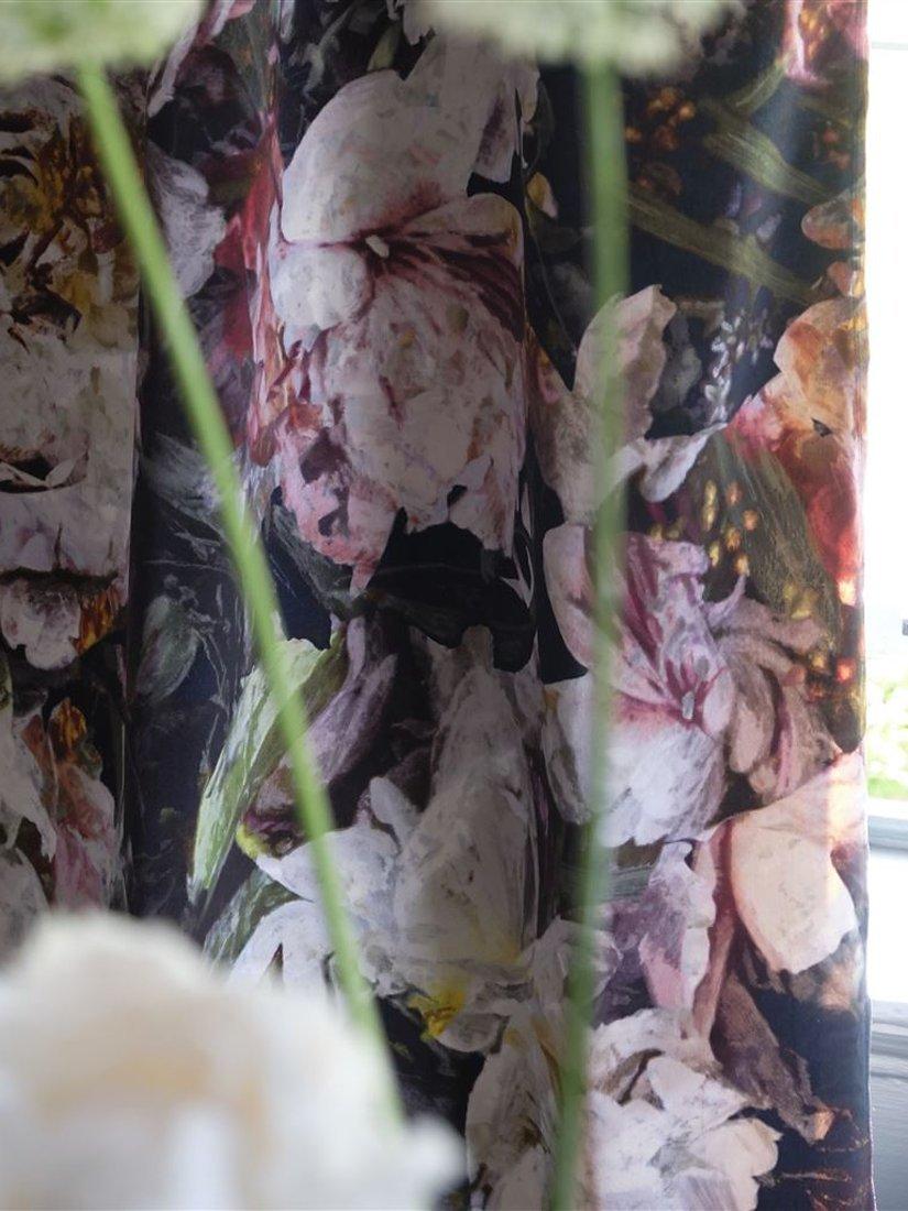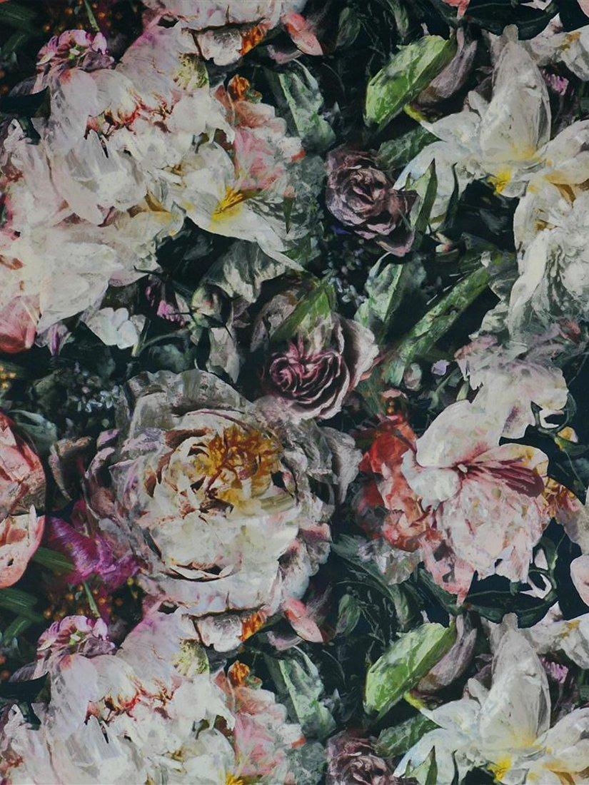 An immersive and sublime scene of hand painted, moonlit flowers in rich, compelling tones. Digitally printed on a sumptuous cotton velvet for depth of expression.