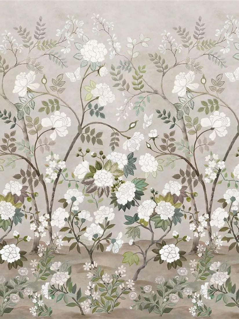 A dramatic large-scale scenic wallpaper design featuring an elegantly drawn tree of blossom and leaves with fine detailing. In two sophisticated colourways this floral wallpaper scene is digitally printed onto a smooth non-woven ground.