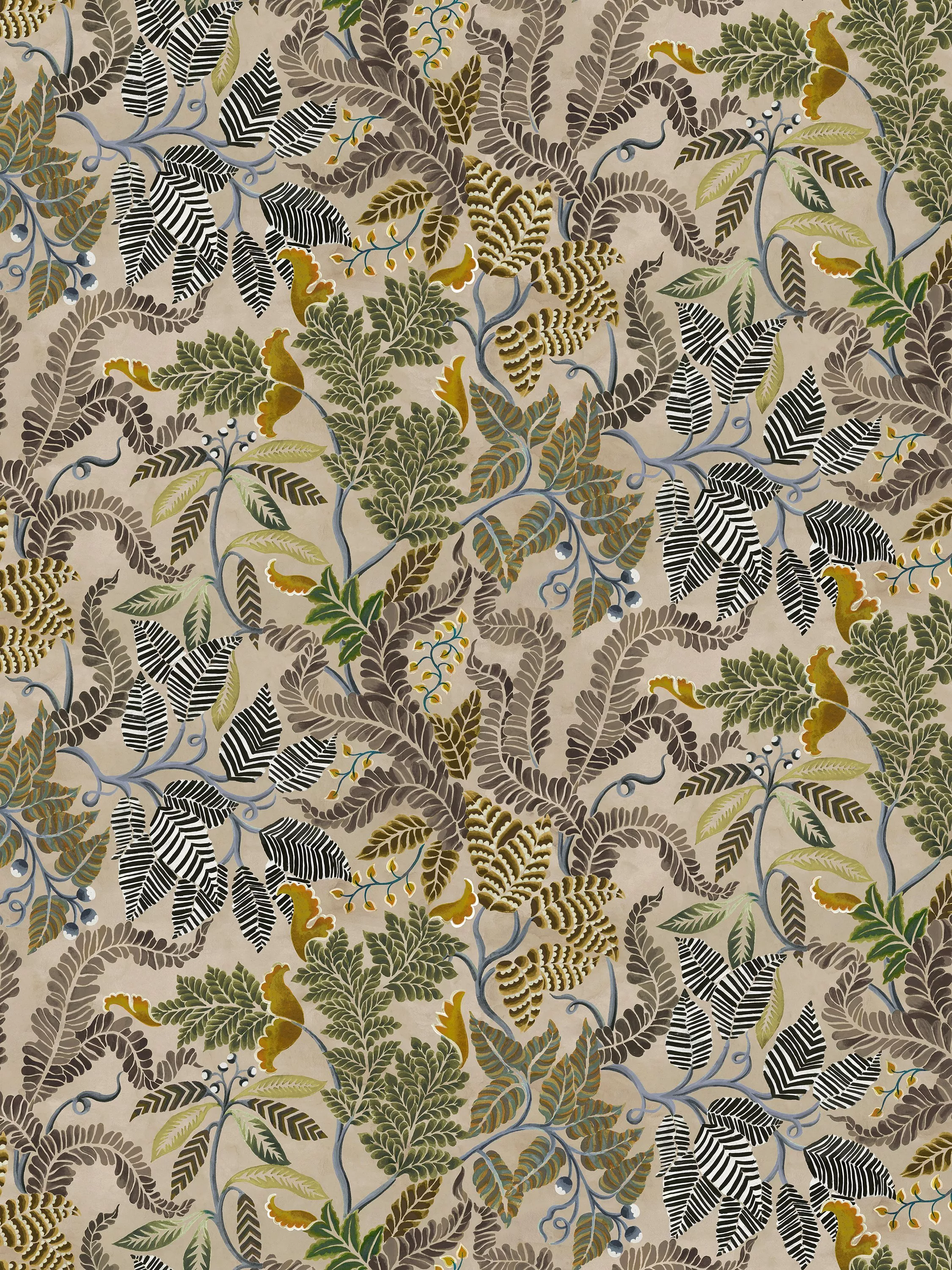 Fougere is a stylised rendering of ferns and foliage digitally printed onto a washable fine textured, slubbed cotton. Variegated and striped leaves are intricately painted on a softly coloured ground.