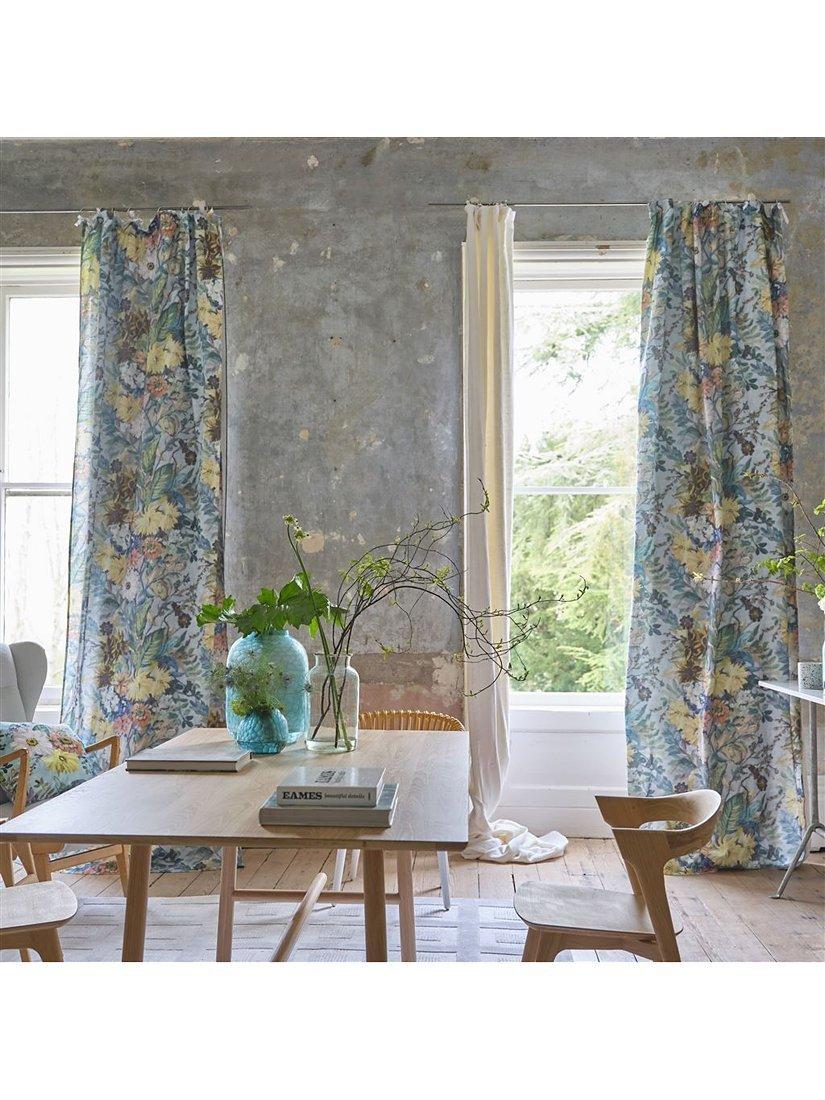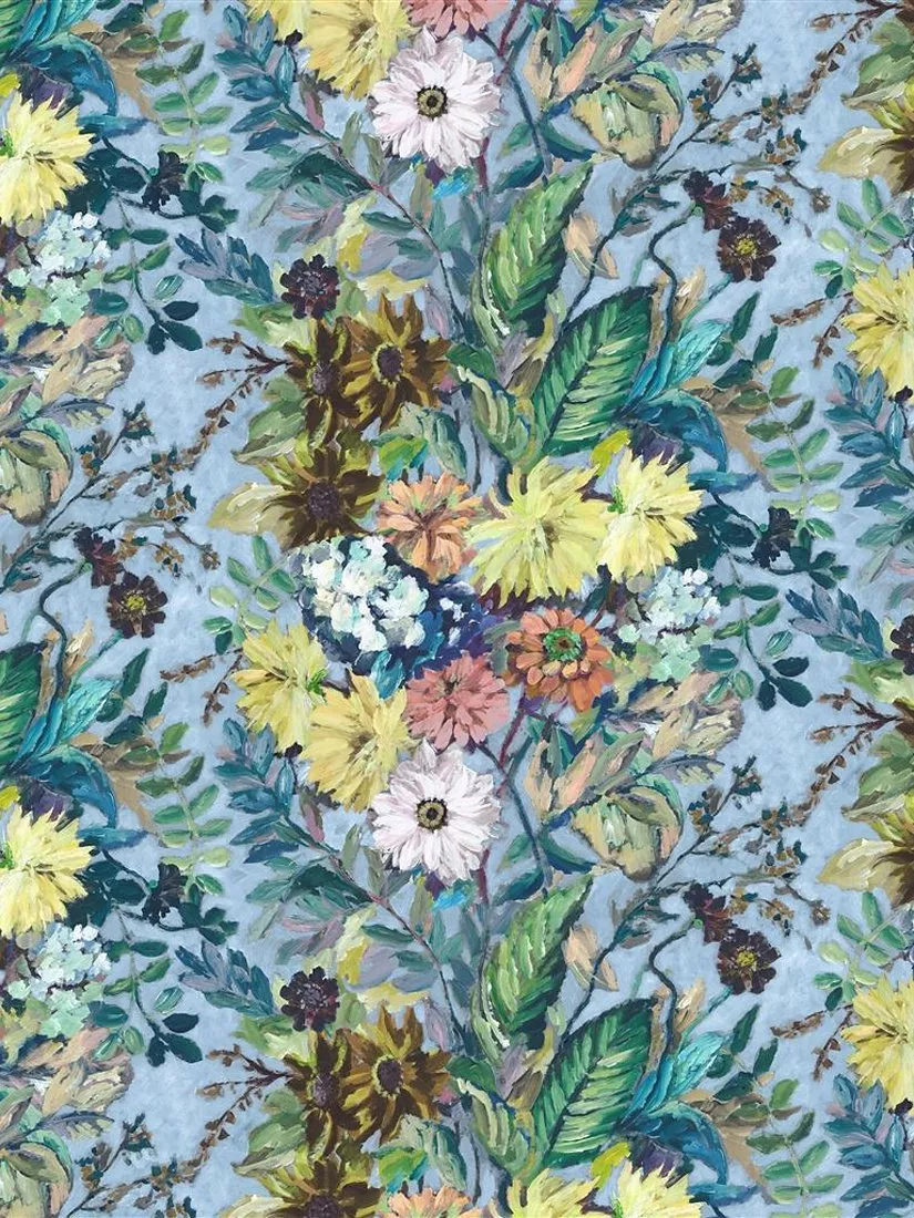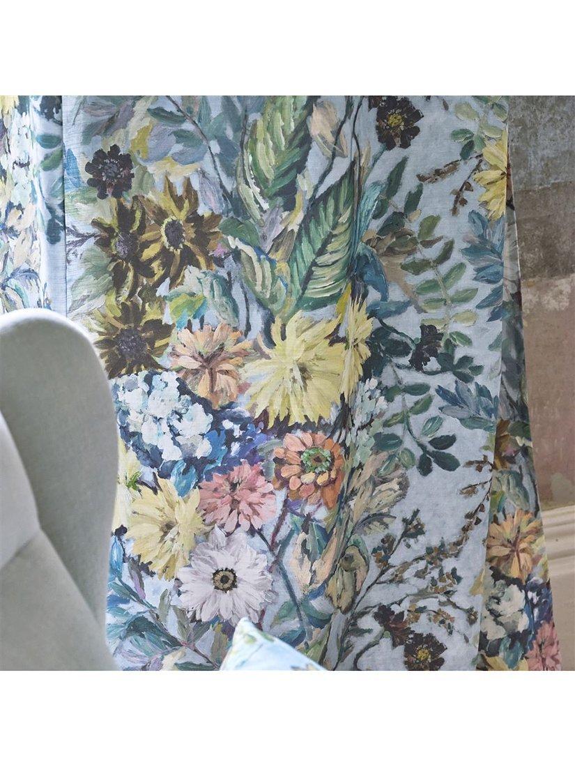 Beautifully painted studies of dahlias and hosta leaves evoke a sense of nostalgic artistry in this exquisite floral print with a panelled form. The design is digitally printed onto pure cotton with a subtle slubbed texture.