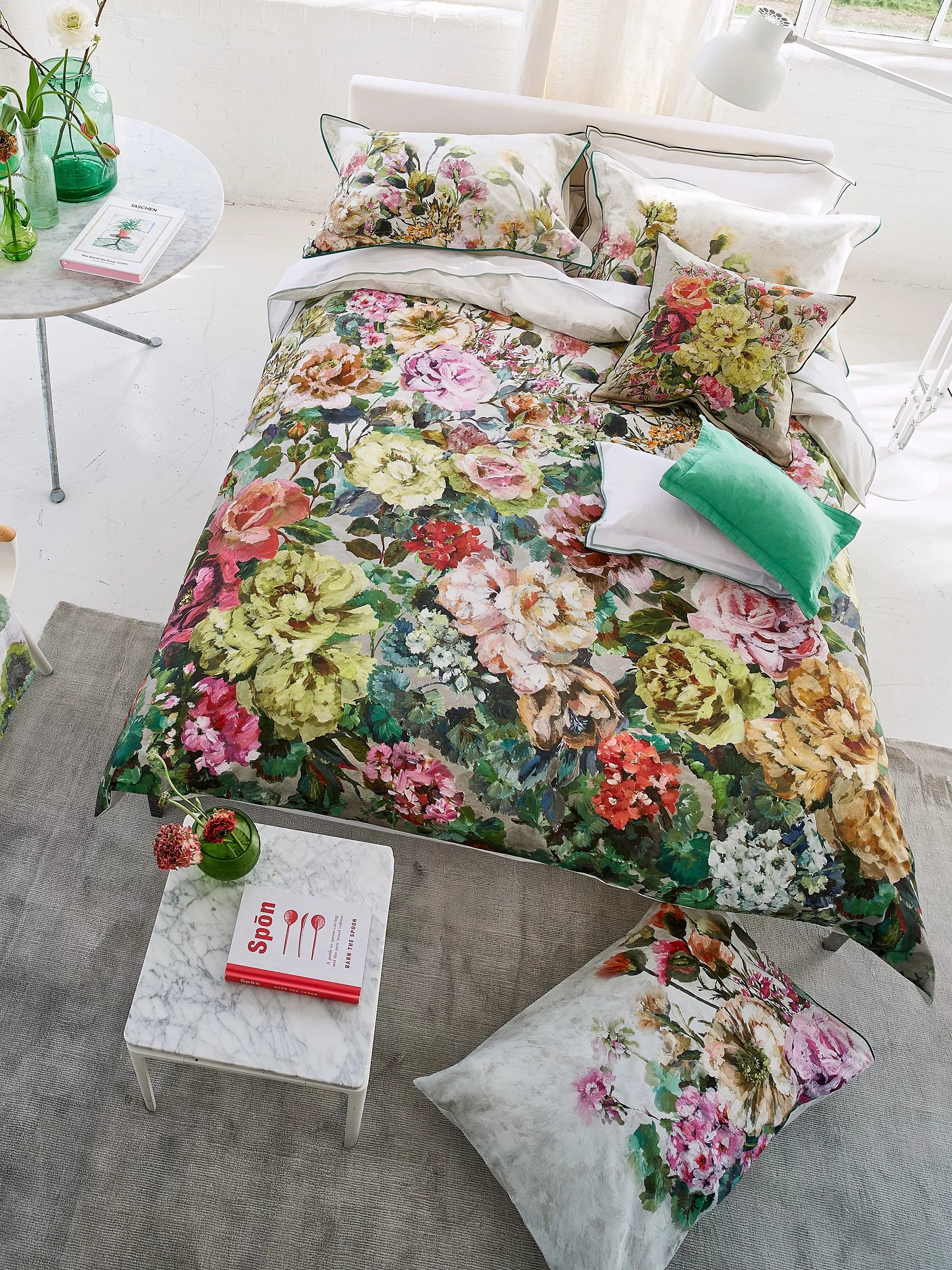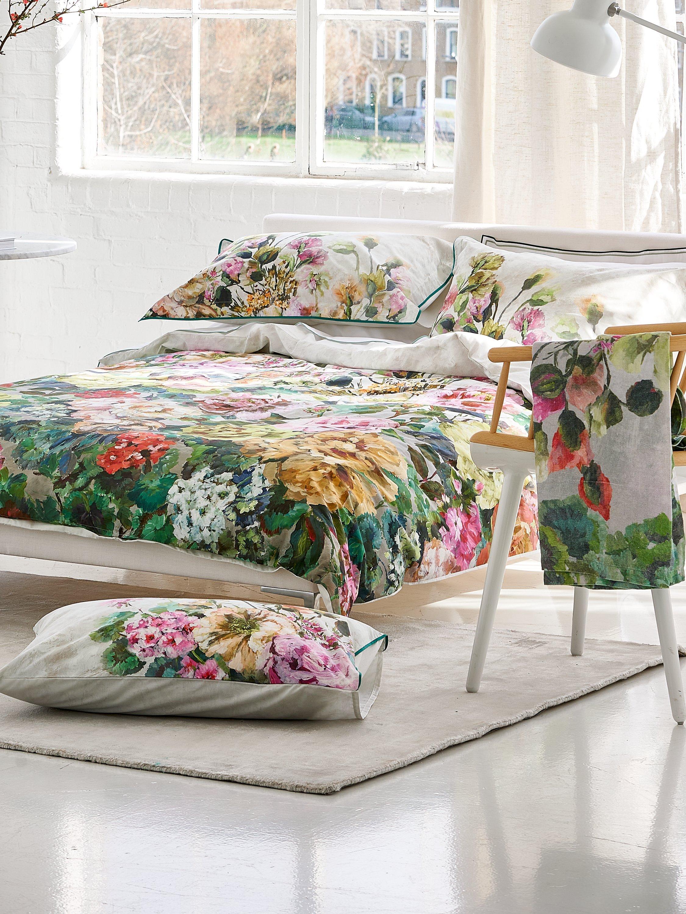 A celebration of spring flowers, this beautiful floral bedding design by Designers Guild is digitally printed onto 300 thread count cotton percale for a touch of luxury in your bedroom. The reverse features a soft texture and the duvet and pillowcases are finished with a teal blue trim.