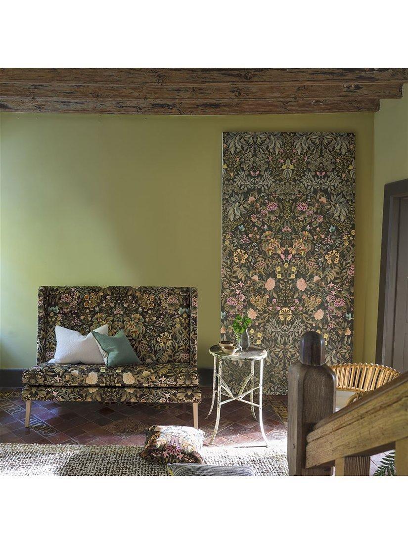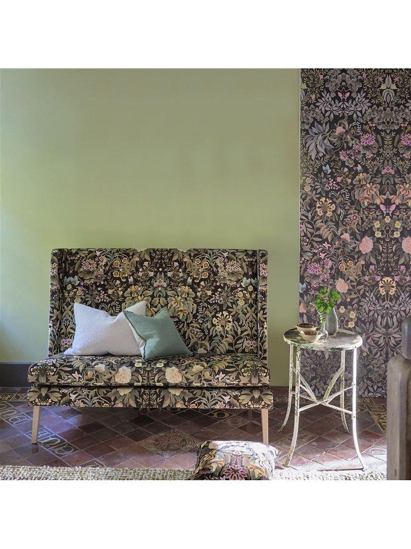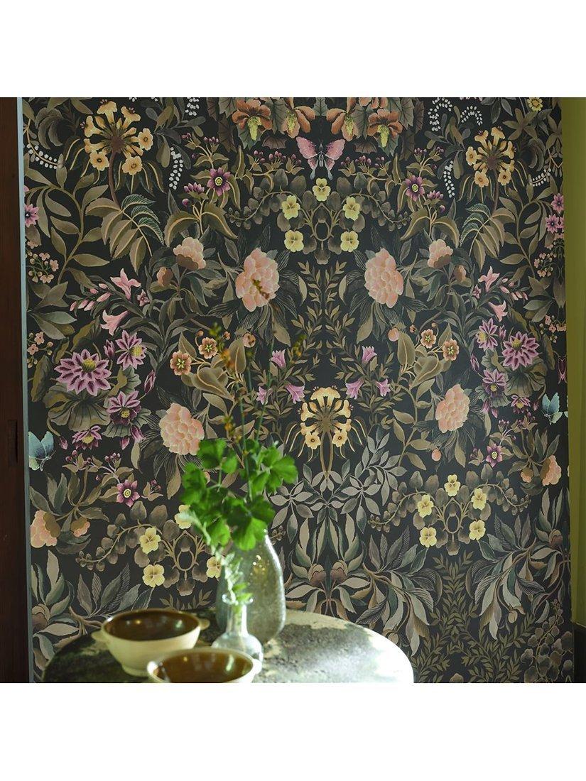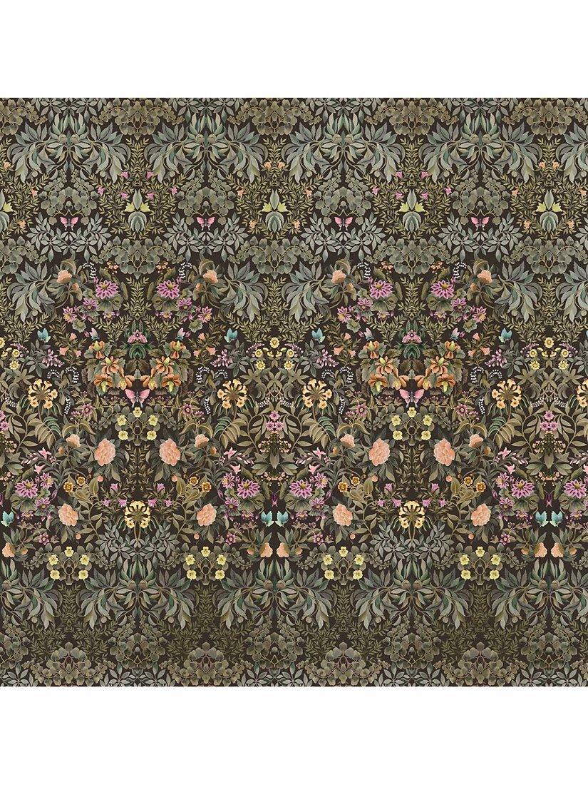 Exquisitely painted flowers, foliage and butterflies are arranged in an artful kaleidoscopic mirrored form to create a contemporary floral damask wallpaper panel. Digitally printed onto a matt non-woven ground for ease of hanging.