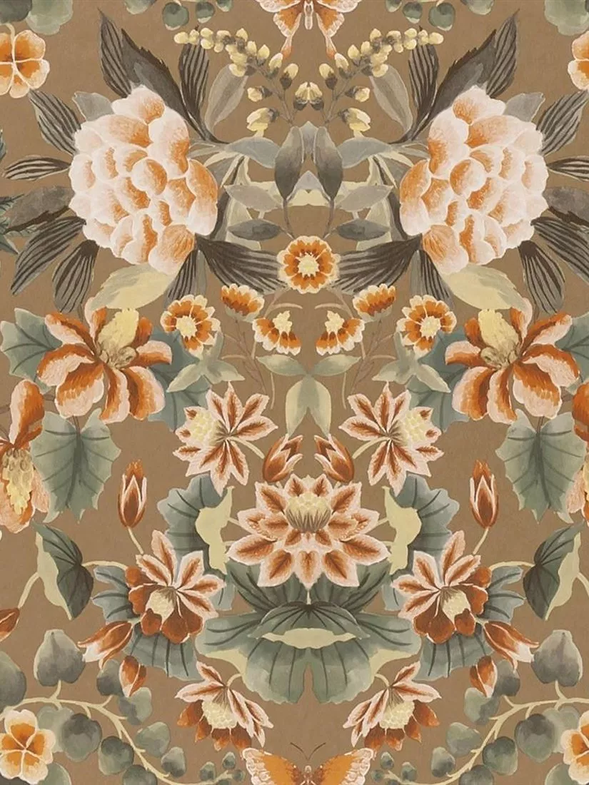 Exquisitely painted flowers, foliage and butterflies are arranged in an artful kaleidoscopic mirrored form to create a contemporary floral damask wallpaper. Gravure printed onto a non-woven ground for ease of hanging.