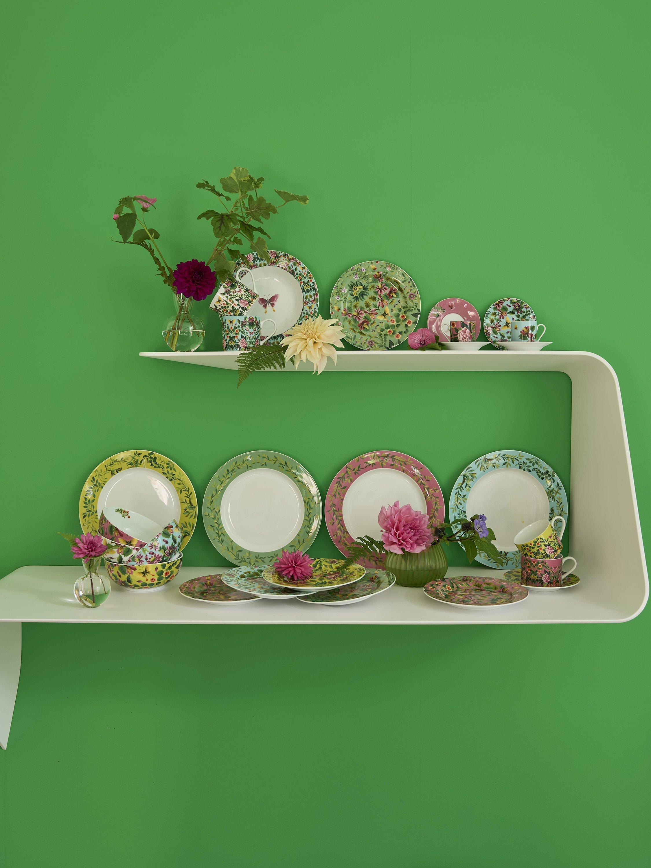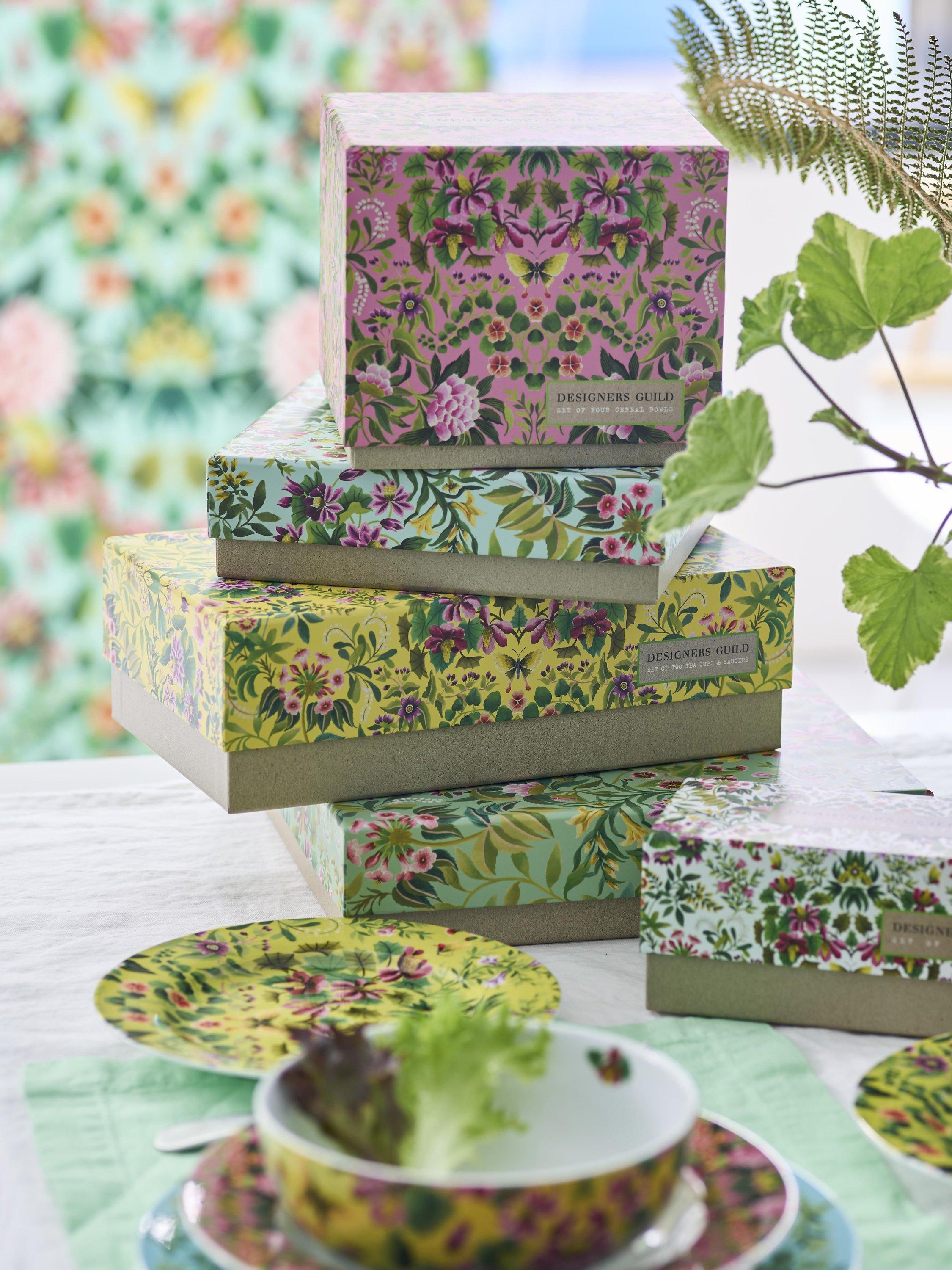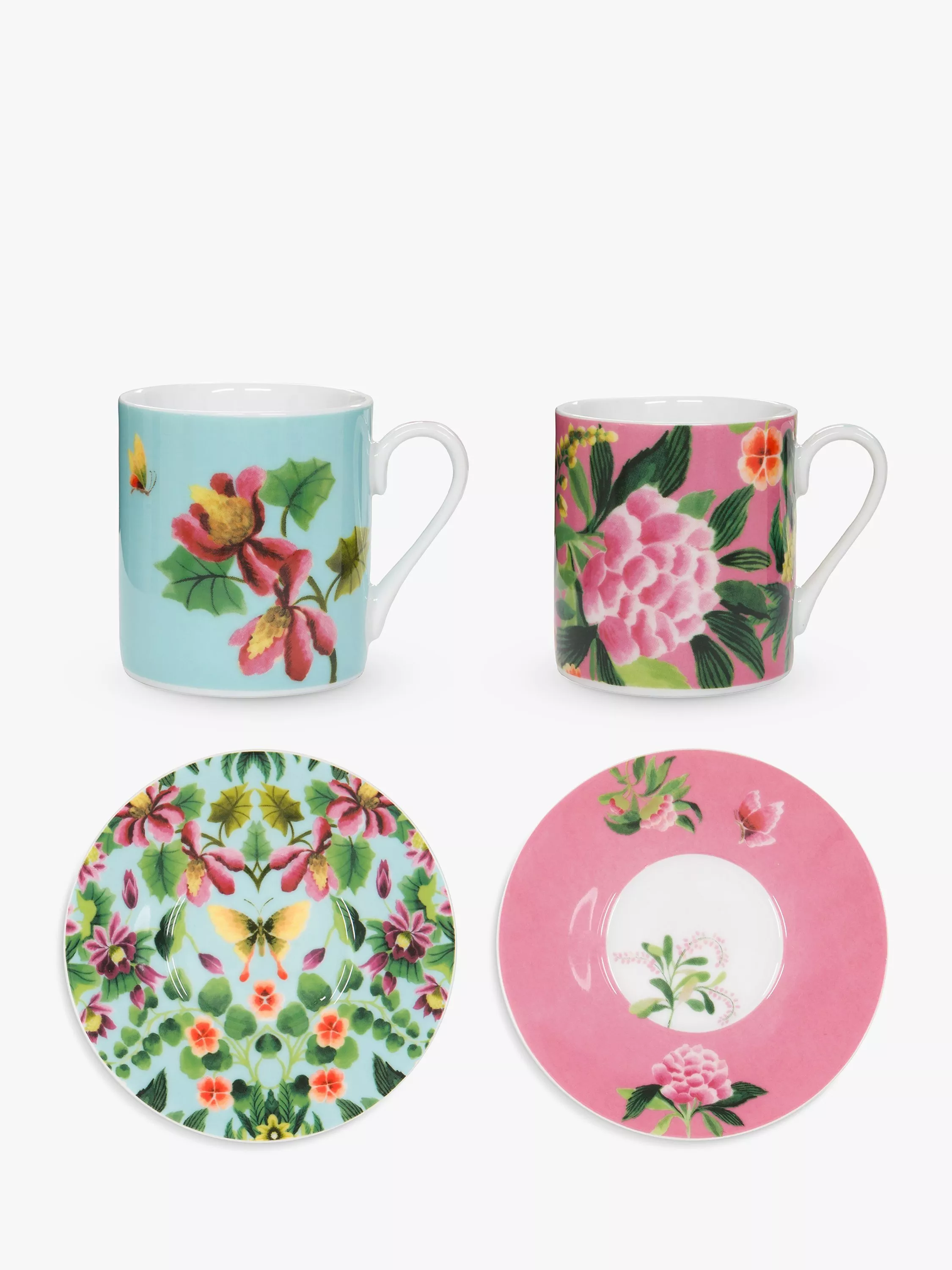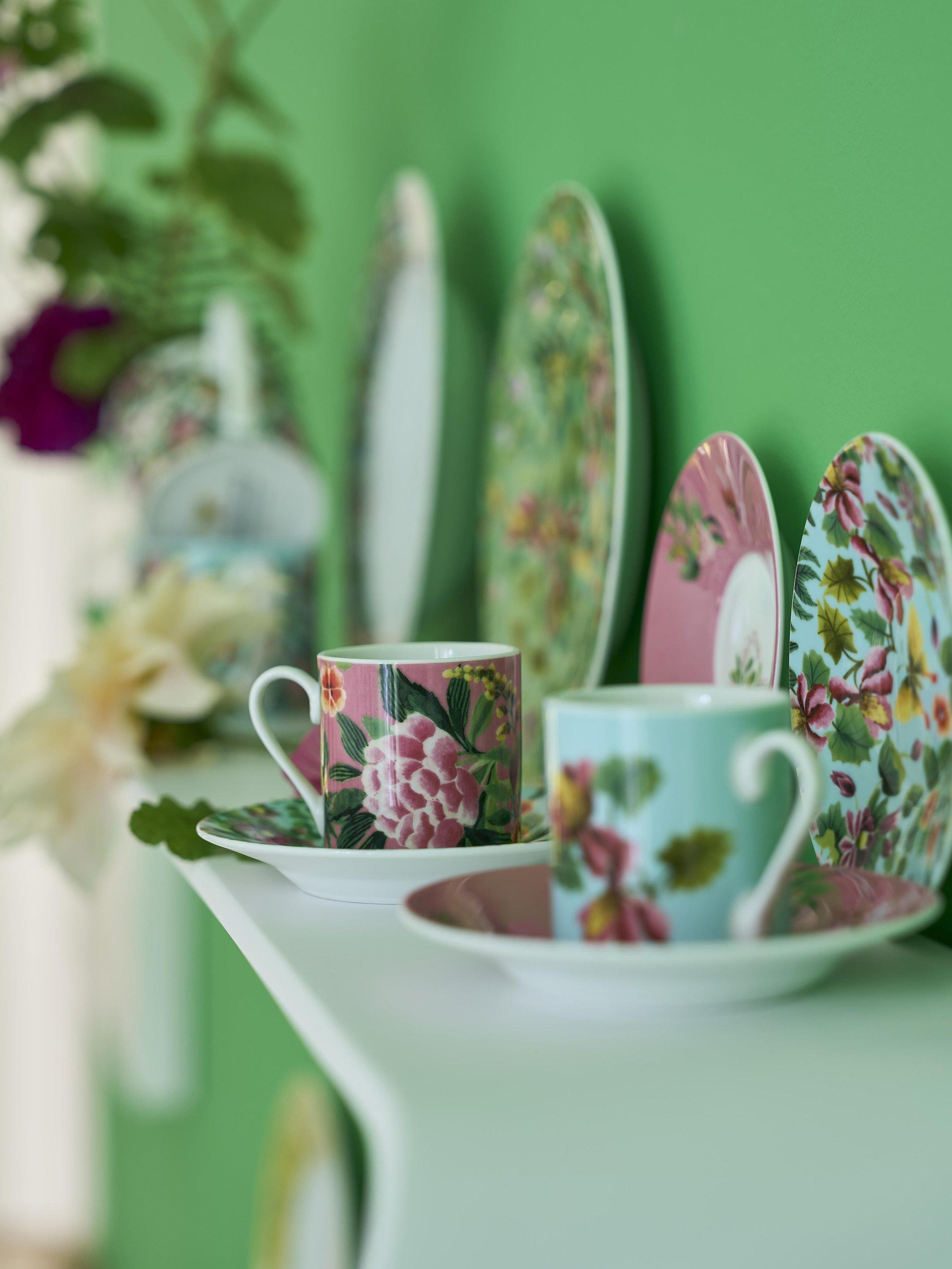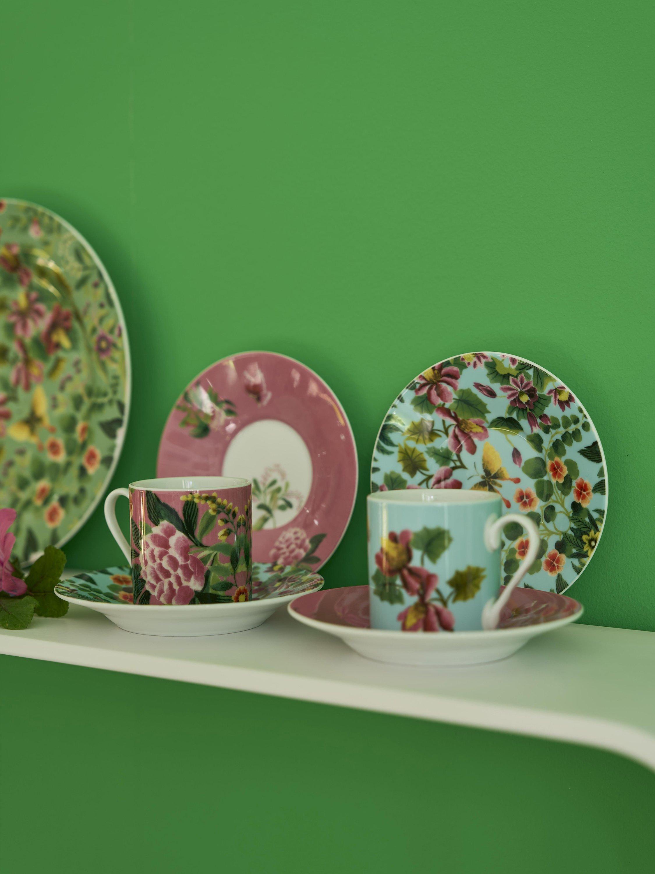 Two sets of espresso cups and saucers featuring the Ikebana design from Designers Guild. Two different vibrant floral designs packaged in a decorative gift box. Part of an exquisite range of luxurious contemporary porcelain tableware. Dishwasher and microwave safe.