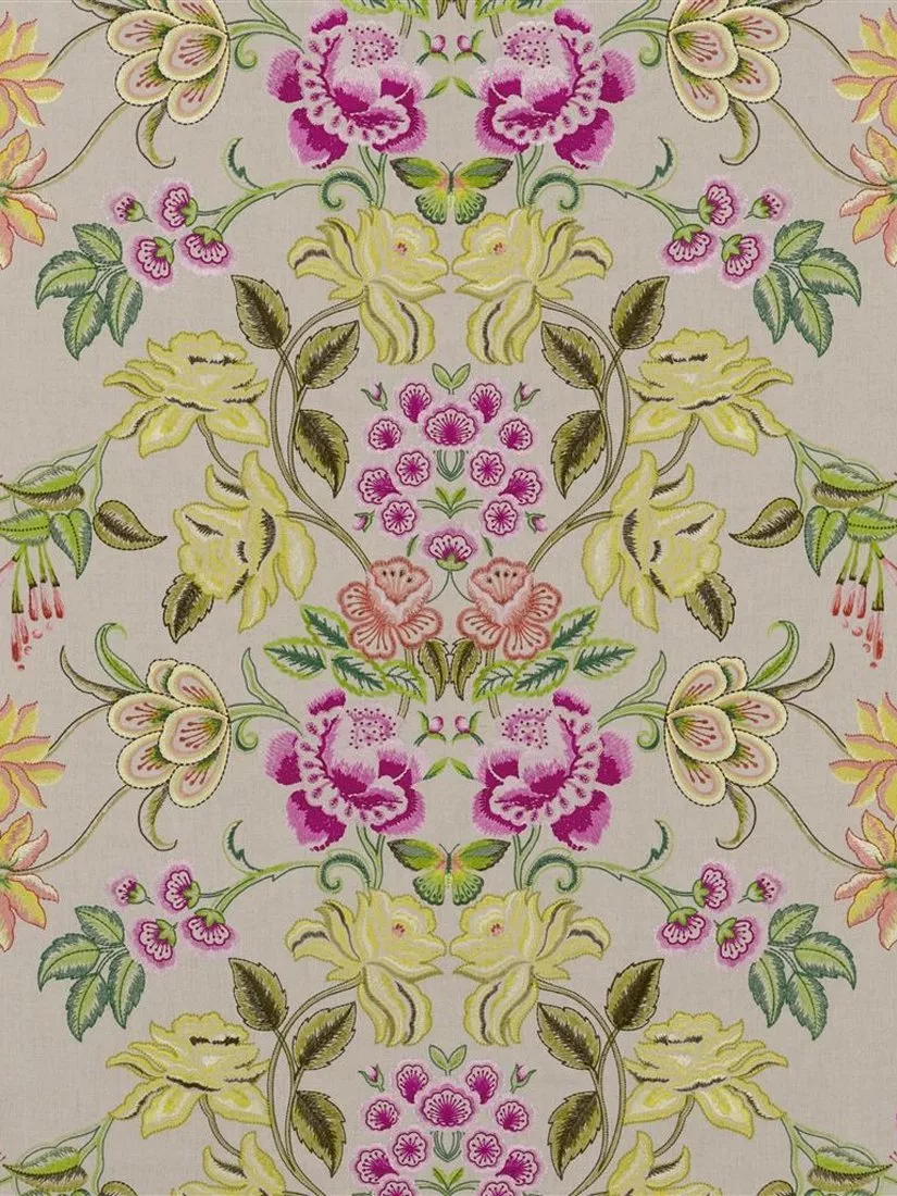 In dramatic mirrored damask form, this stunning embroidery showcases large scale floral motifs. Elegantly intertwined with leaves and foliage, using a variety of stitch techniques to create intricate detail and dimension.