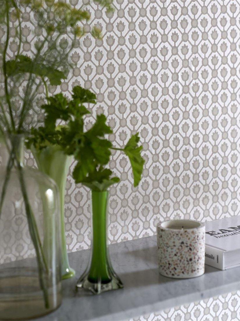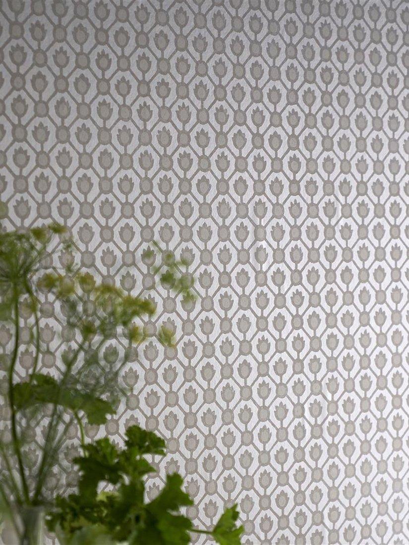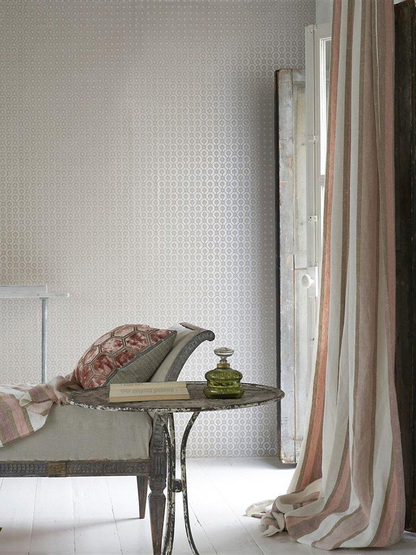 This archival print from Designers Guild features a small all-over stamped motif in two tones of colour. This graphic wallpaper is traditionally surface printed onto a subtly textured non-woven ground to emulate the hand-stamped feel of the original design.